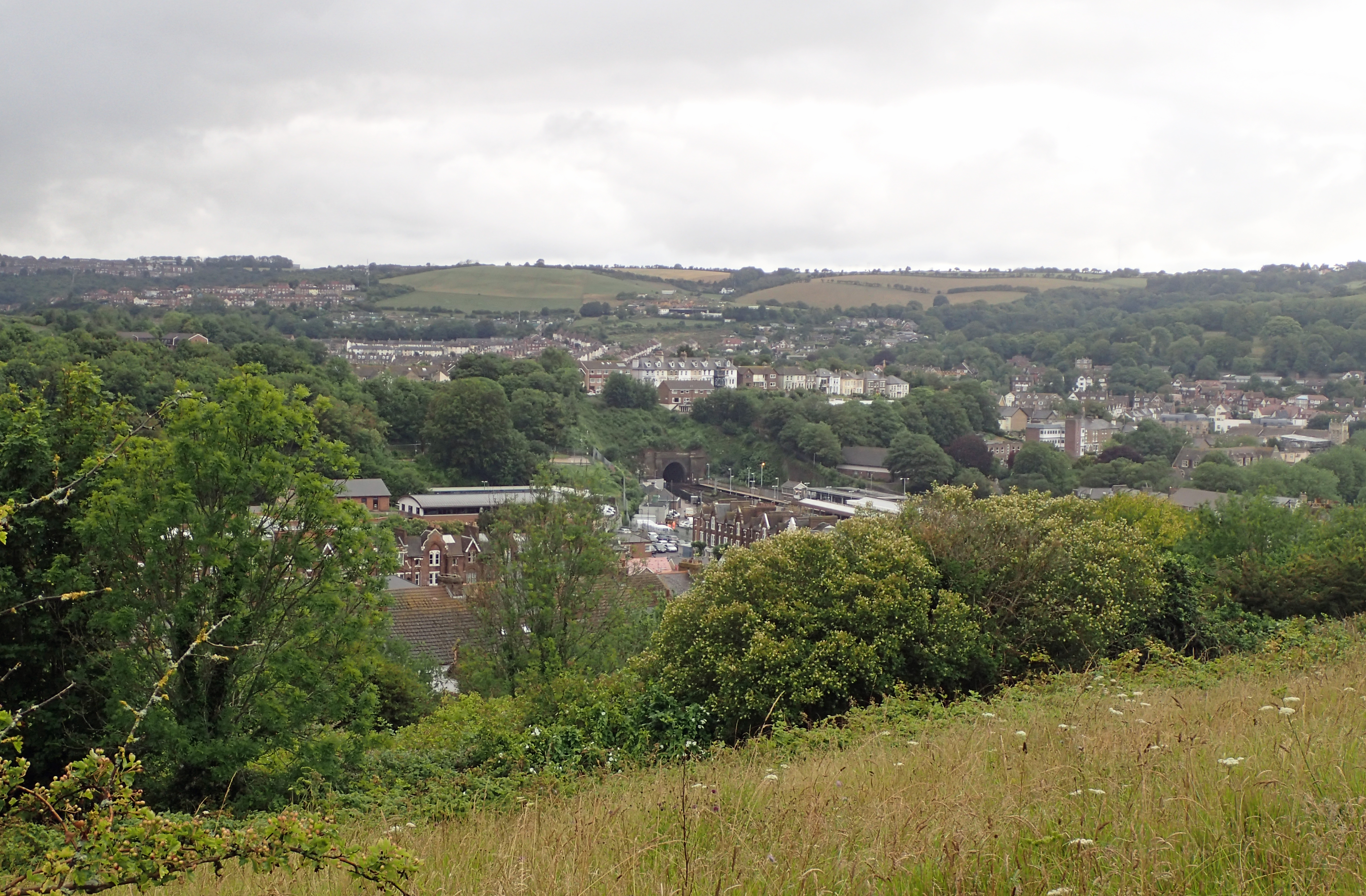 Looking down toward Dover Priory railway station from the Western Heights. The rain clouds are clearing and I only have sodden grass and muddy paths to content with