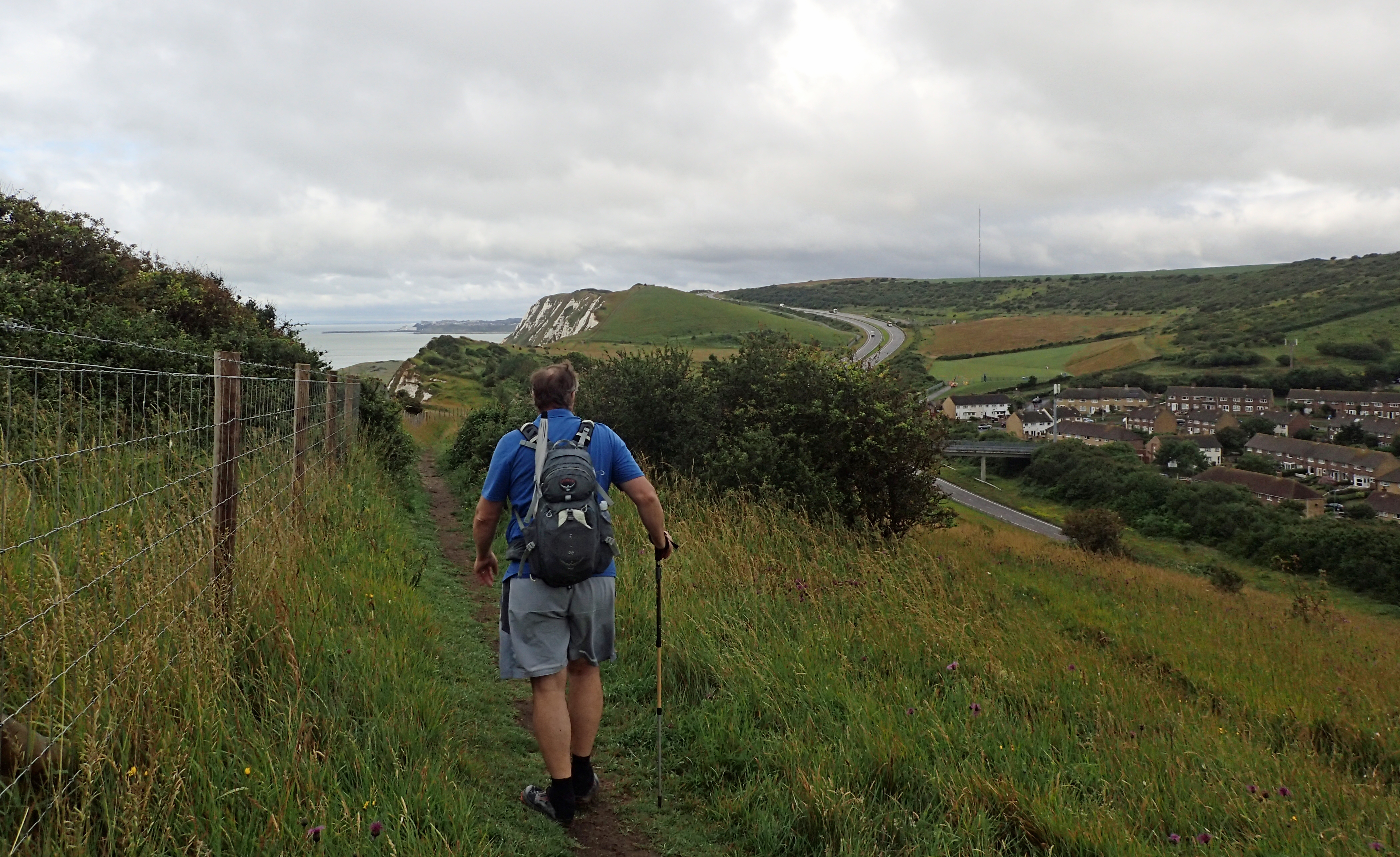 My final four days on the Saxon Shore Way beckoned. These offered possibly the most enjoyable walking of the whole trail. For my section from Dover to Sandling, I arrived at Dover Priory station early and despite the heavy rain and slippery grass on the slopes, I was up on the Western Heights, overlooking Dover, before seven. The rain clouds cleared and I looked forward to a walk along the chalk meadows above the cliffs. Before that I had to wend my way through various paths and peculiar routings, the route went up, down and most definitely around.