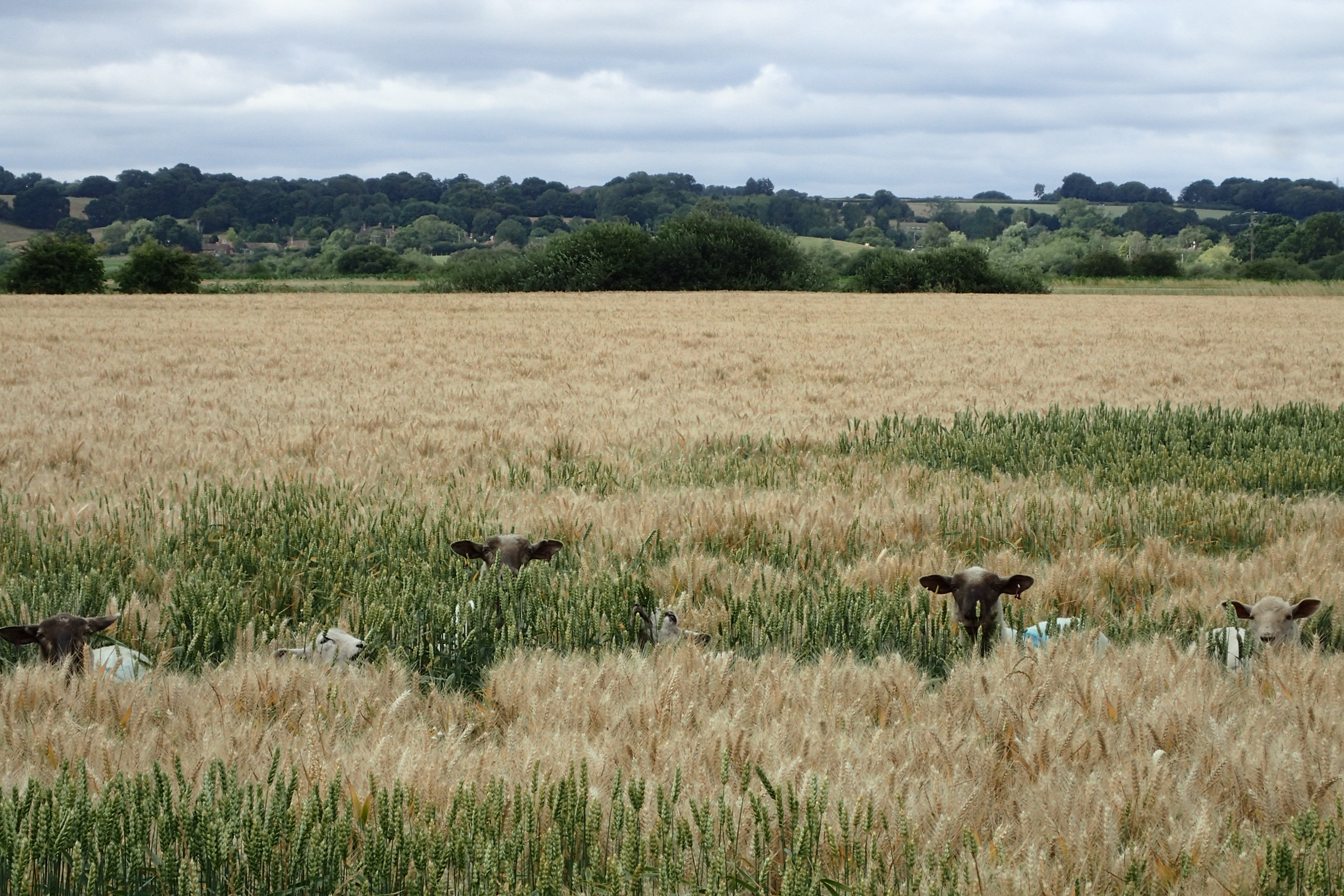 Then it was back to crossing cereal crops. A rustle to my left and a familiar head showed above the grain, followed by another, and another. What is it with these renegade sheep? Another bunch that had decided that the grass was, indeed, greener in the next field and had formed an escape committee.