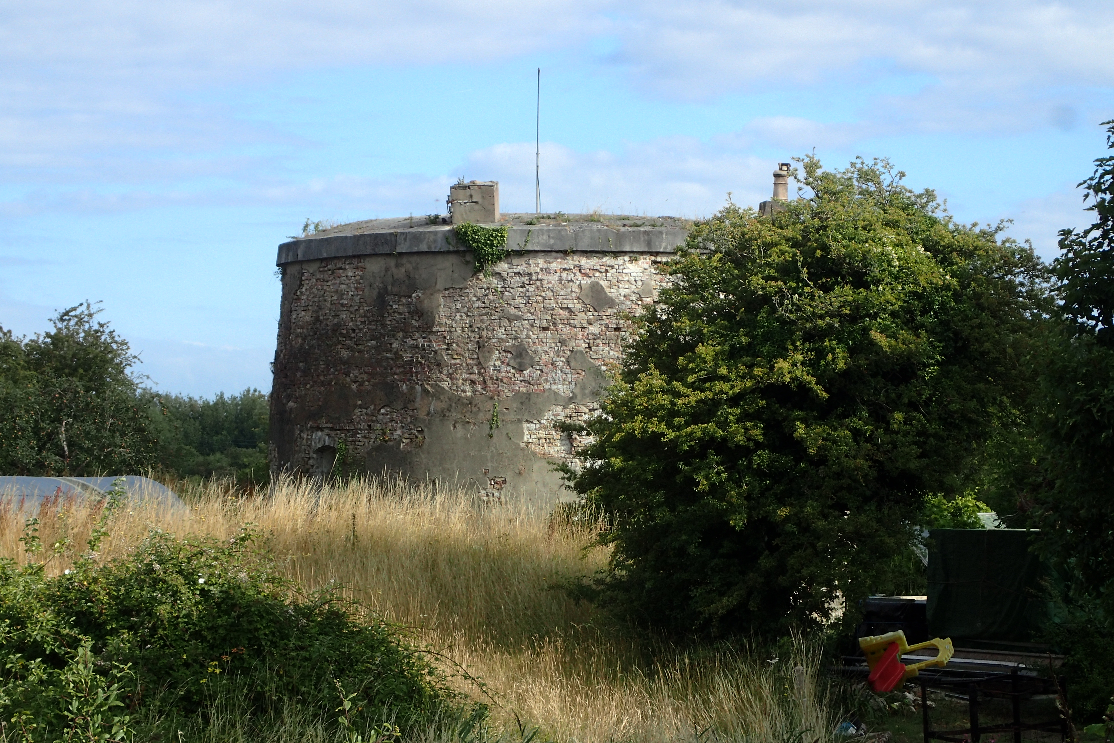 Back in Rye the following day it was already hot and sunny. A cloudless sky and a very exposed first half-day followed by just a little shady shelter in the afternoon. Exiting the station it is only a few hundred metres and the trail is already back into the country. I took time out to try and find Martello Tower No. 30 that is shown on the map. It was built there to protect the sluices of nearby Brede and Tillingham rivers. The tower is hidden away on private properties and I had to dodge the traffic to stand on a scrappy verge trying to see it.
