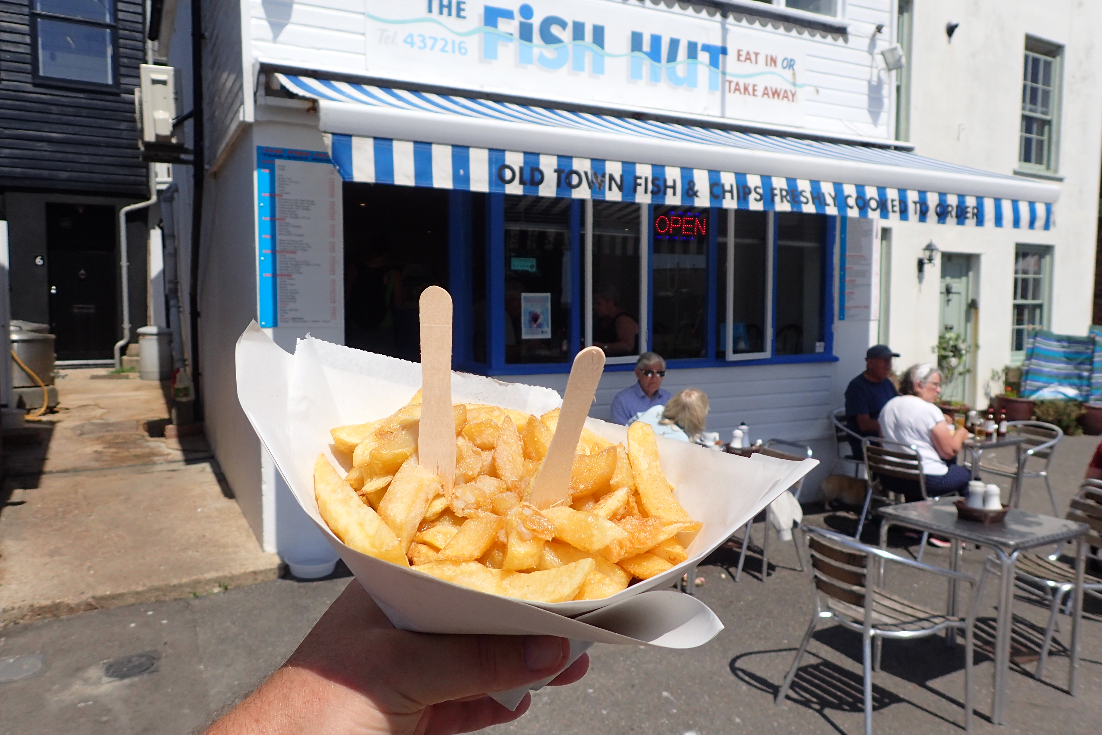 Reaching East Cliff it is a gentle walk down the slopes to the edge of Hastings Old Town. The East Cliff funicular railway isn’t working these days so it is a steep descent by steps down into the town, suddenly emerging to a throng of people out enjoying the lovely coastal town, ice creams and, wait for it… freshly fried chips from numerous open chippies.