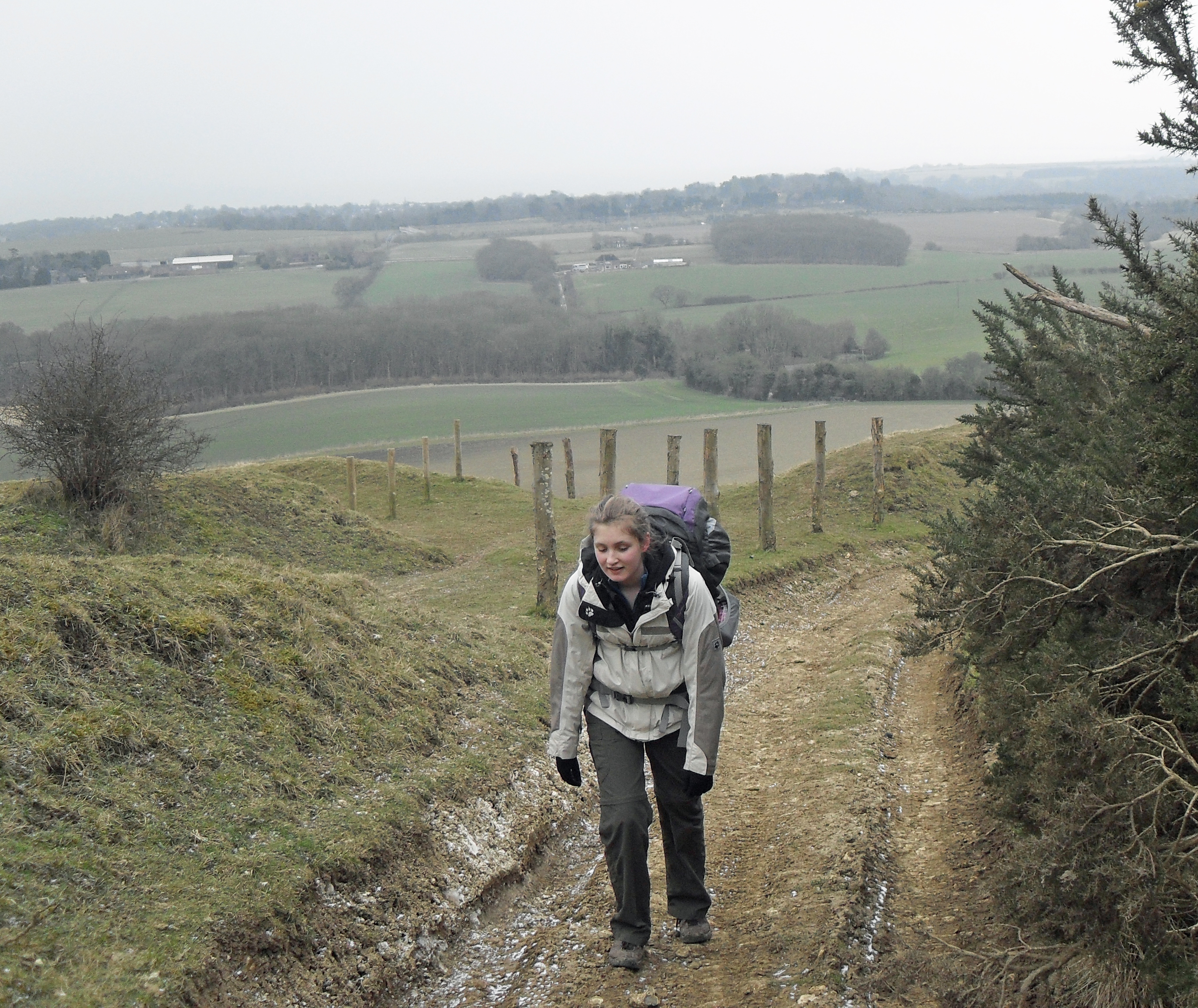 Miss Three Points of the Compass climbing Tolsford Hill when backpacking the Elham Valley Way in the winter of 2012/3. The Saxon Shore Way decends this hill toward Sandling
