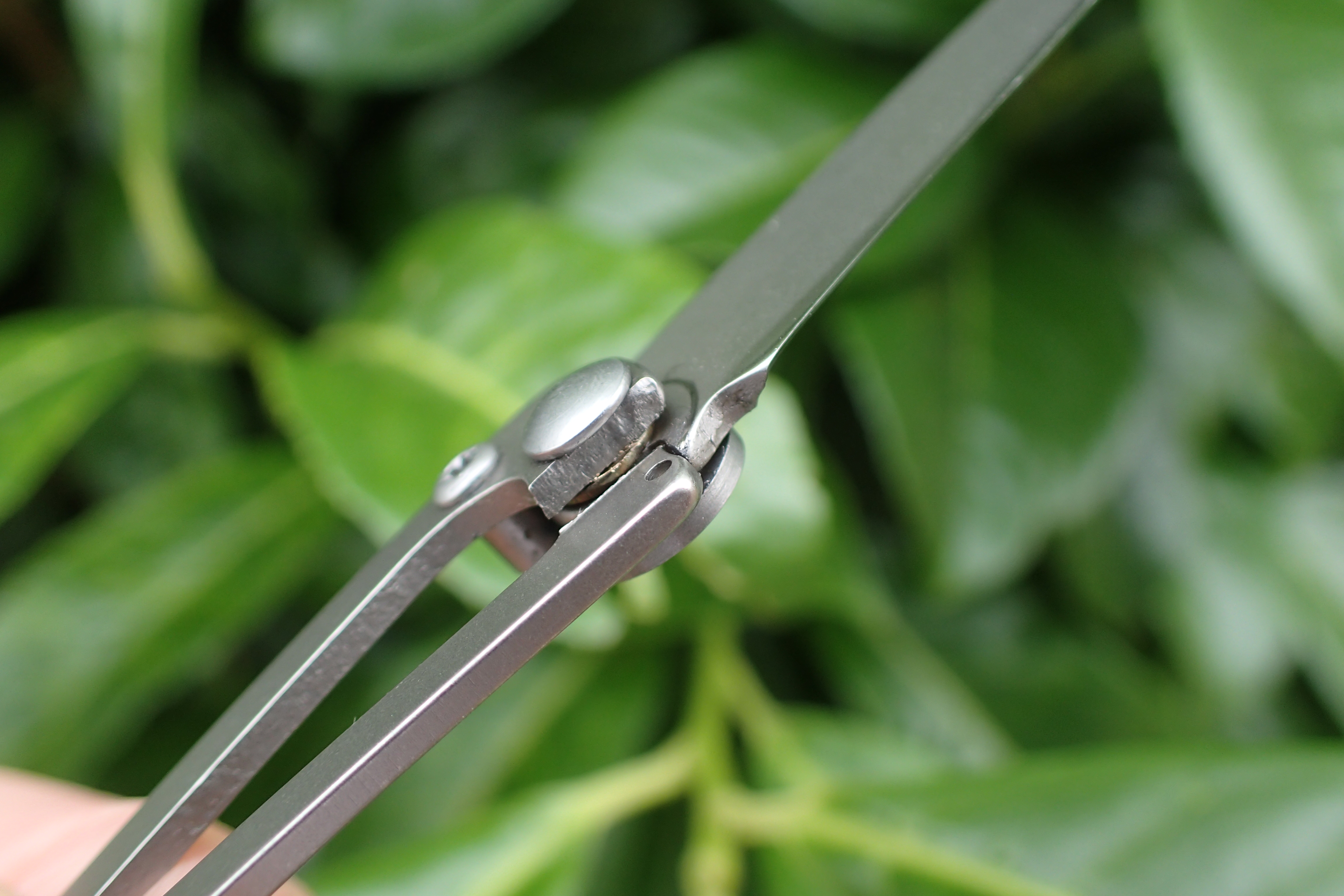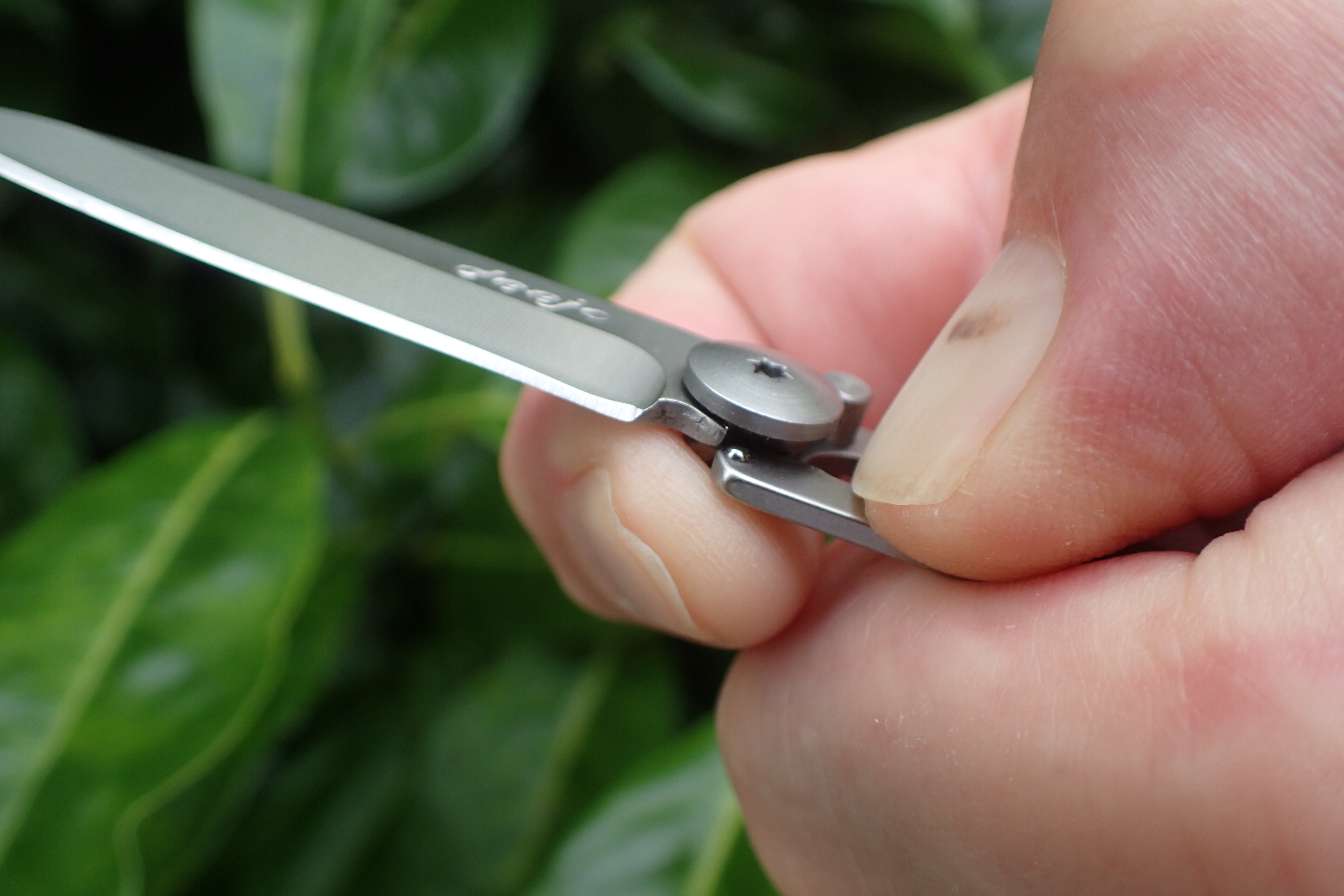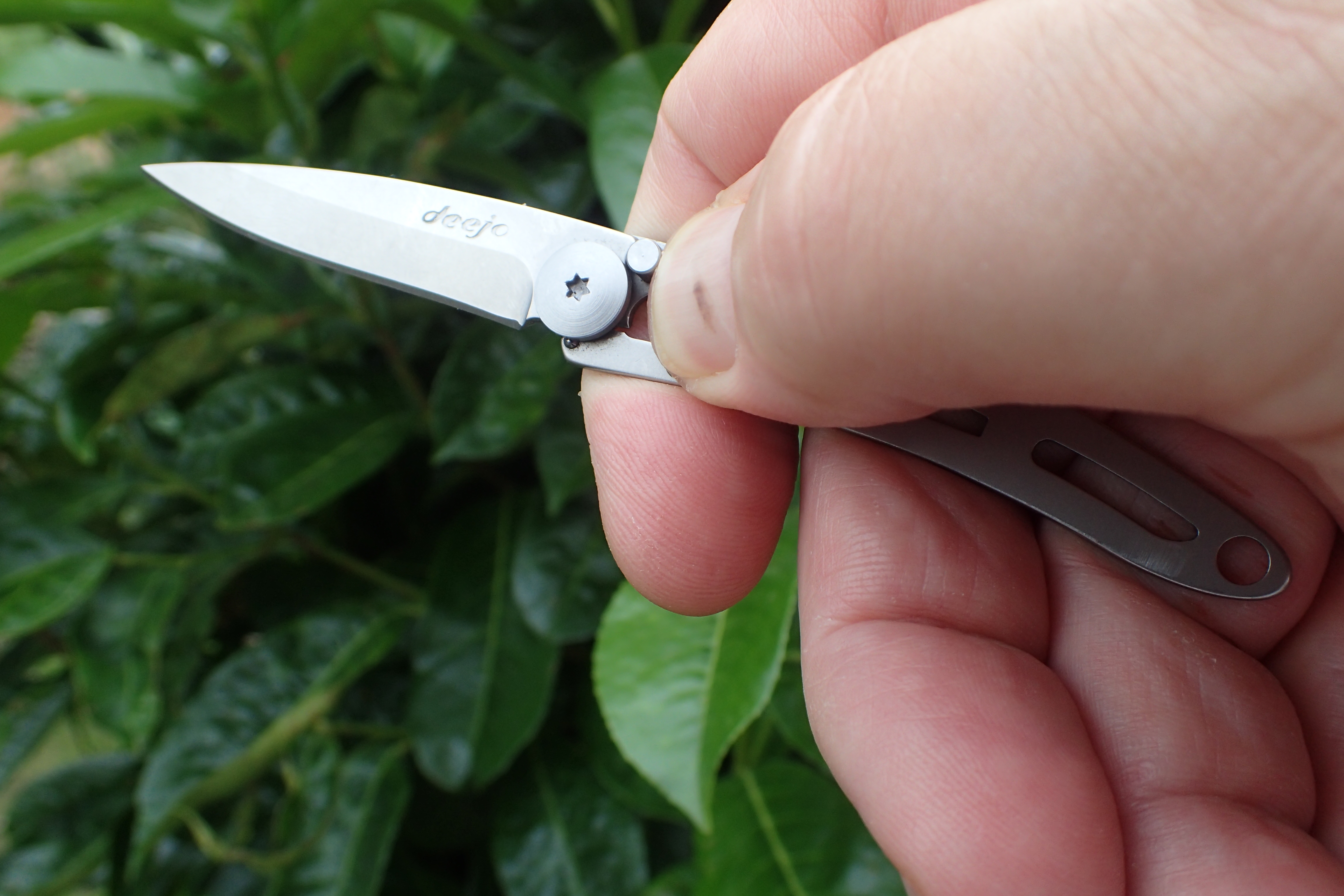 The Deejo 15g is a ‘naked’ knife. There are no scales or other accoutrements. The brushed steel finish frame, such that it is, is minimal, with a central cutout and a hole in the end through which a lanyard, carabiner or split ring can be passed. There is no nail nick and the blade has to be pinched to open it, which isn’t difficult. It cannot, and should not, be opened one-handed. With such a minimally guarded blade it requires two hands to open and close safely. There is a very slight curve to the handle that means the point is under pressure and flush when closed so the blade point cannot catch on clothing or skin when closed. There is almost a snap on the final point of closing. The short handle length means that only part of the hand is grasping it in use, with my large hands, some two and half finger close around it.
