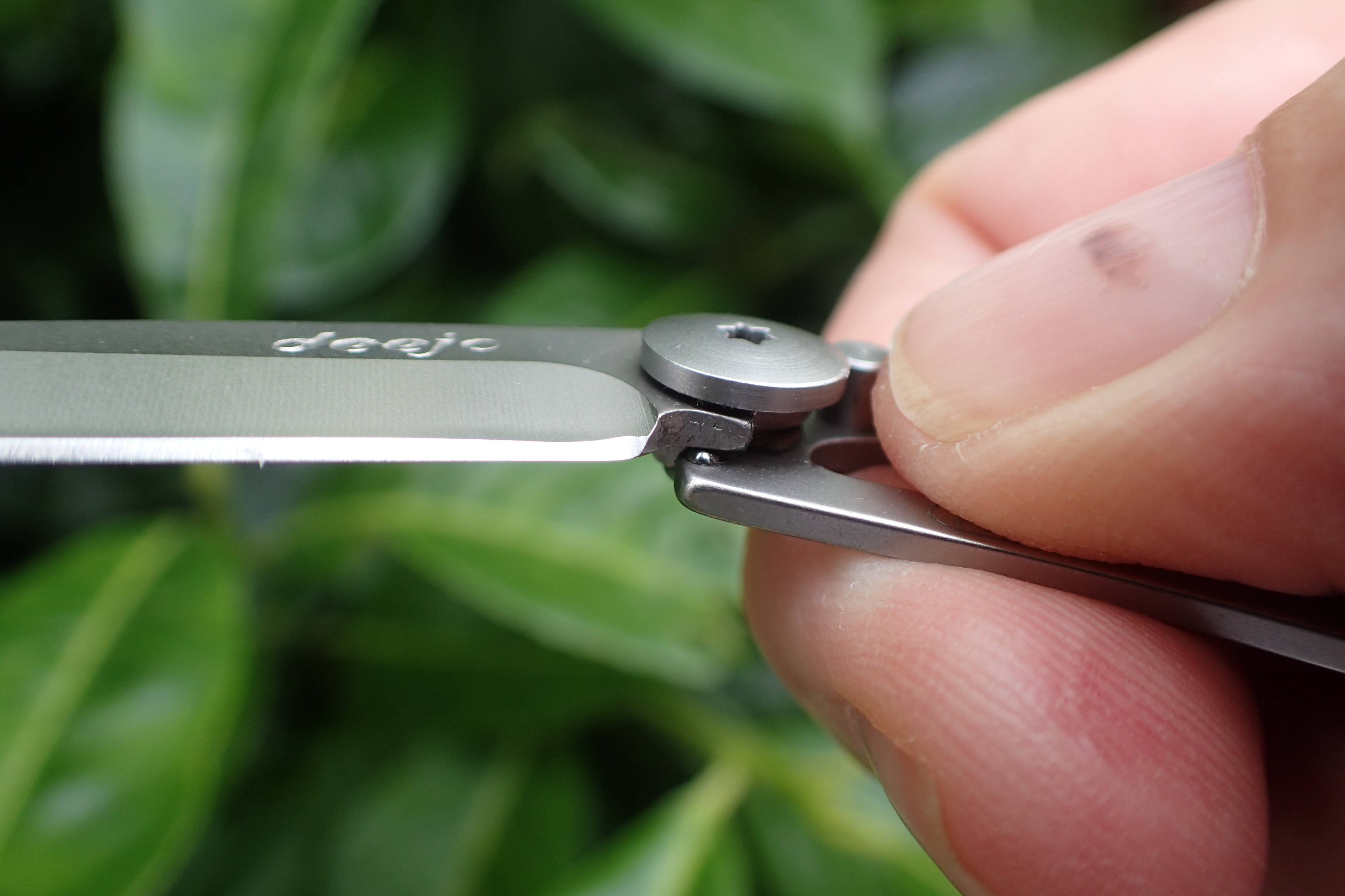 The whole knife is extremely minimalistic. There is little, if anything, that is included on this that isn’t required. A handle- that also operates as liner-lock, a blade, a pivot, and two ‘nubs’- one to act as a stop when opened, the other to indent into the closed blade and prevent it opening under its own volition. Finally- two engraved words, Deejo and PRESS on the liner lock.