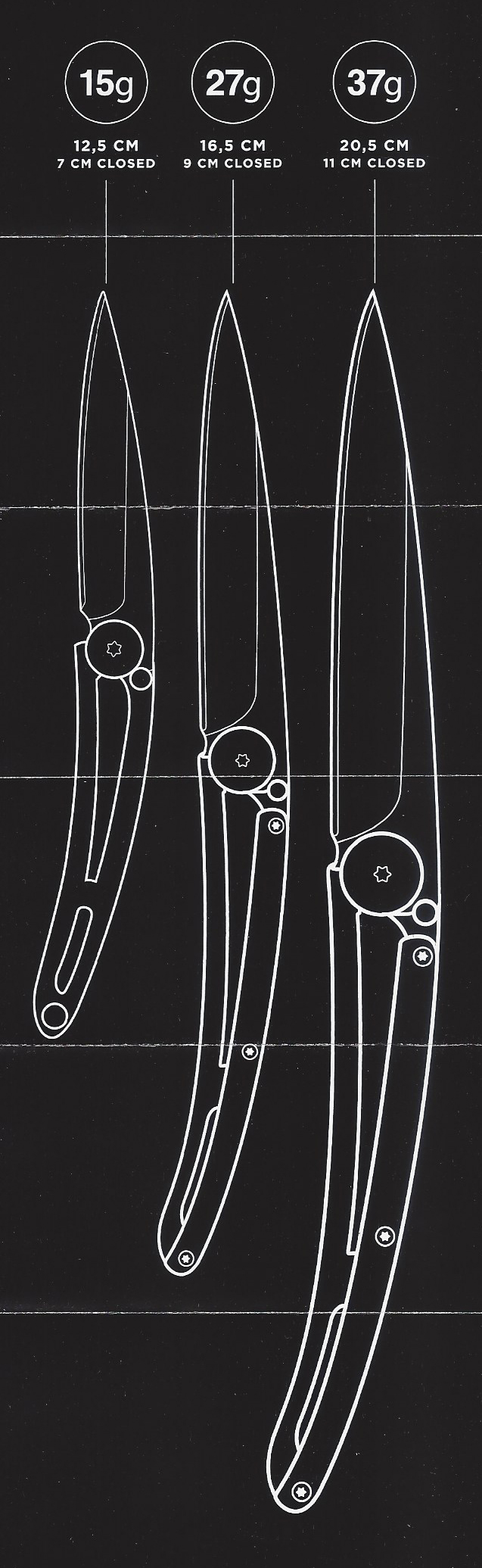 In 2010 Stéphane Lebeau designed and invented an ultralight pocket knife. Today the range of Deejo knives is small- just three sizes. In more recent years Deejo have begun to offer a wide range of customisation to the three knives so with choice of scale material and blade ‘tattoos’ a lot of personalisation is possible. The basic range is named by their weight, these are 15g, 27g and 37g. The smallest of these, the Deejo 15g, makes a very useful, minimalist, single blade, folding knife for backpacking purposes. A pocket, or belt clip, is fitted to the two larger sizes of knife, no clip is attached to the 15g.