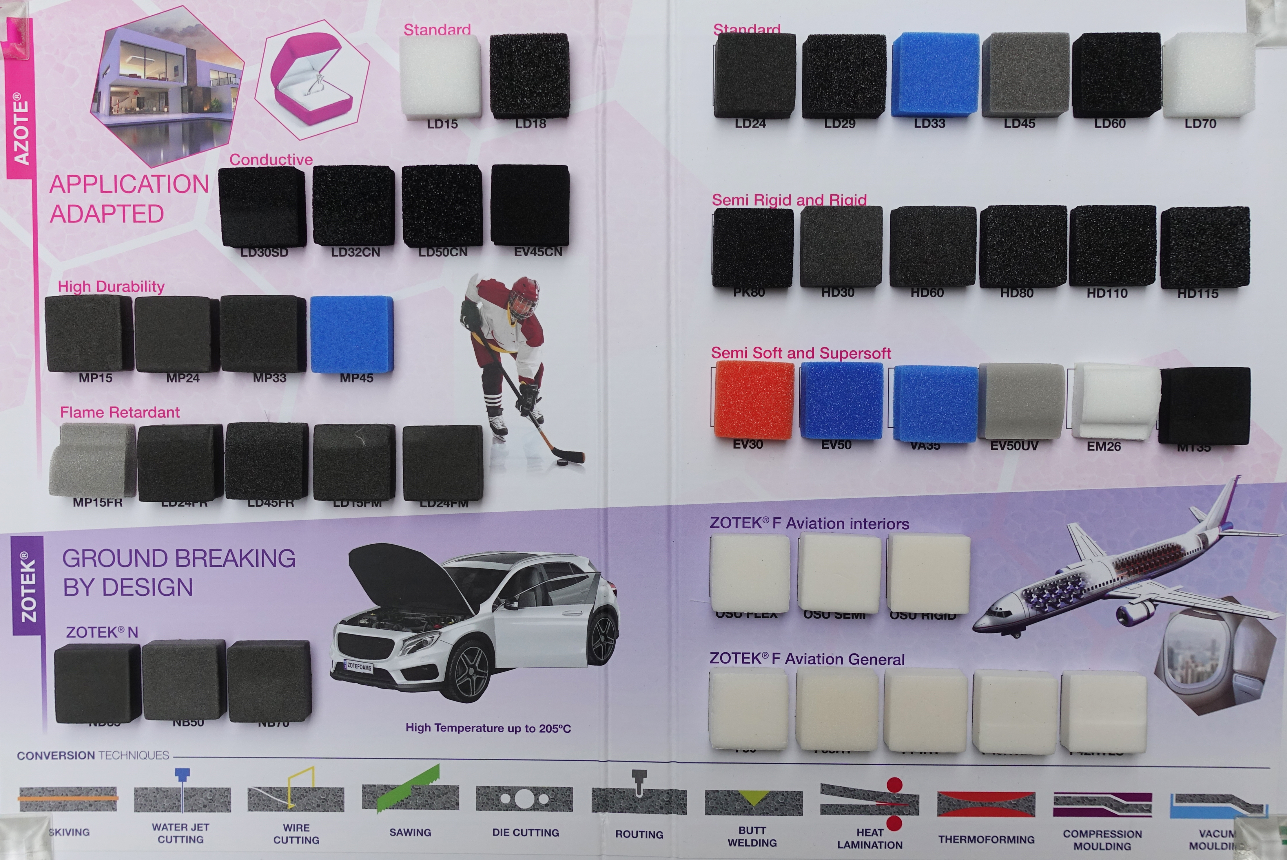 Nitrogen expansion technology is used to create block foams with uniform closed-cell size, low odour and standardised quality. These foams are a polyolefin, a polymer produced from an olefin. First Invented in the UK, the world’s largest manufacturer of lightweight cross-linked polyolefin block foams is Zotefoams who make two families of foam- Azote and Zotek. Within the former are Plastazote, Evazote and Supazote and these are used in numerous industries for many purposes.