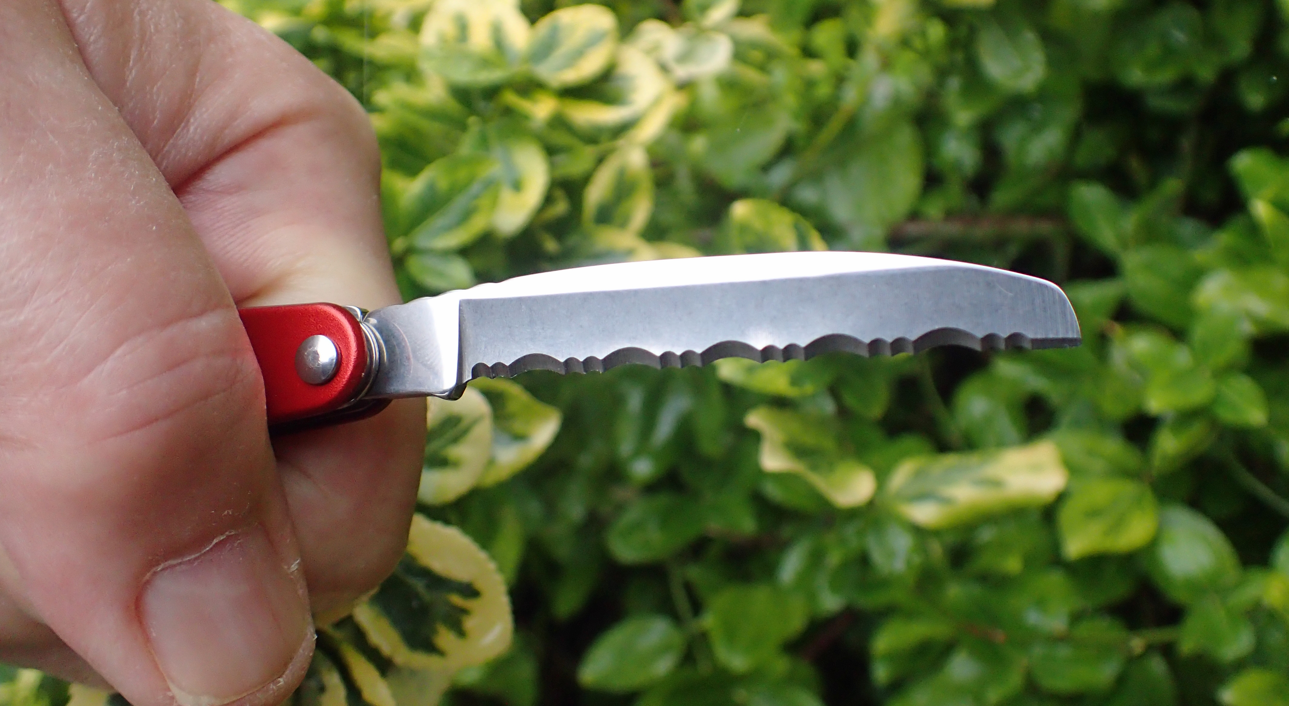 The serrated blade is made from the same steel as the fine edge. It is actually a millimetre longer overall and has a 58mm long cutting edge with blunt tip. The chisel cut serrated blade has jimping on the spine so it is possible to choke right up on the serrated blade with the fingers while cutting or sawing. In fact there is a minimal choil on both blades so it is possible to fold an entire hand around the 82mm long handle, extending the forward finger on to the unsharpened part of whatever blade is being used. The curved spine of both blades matches the curved profile of the handles when folded.