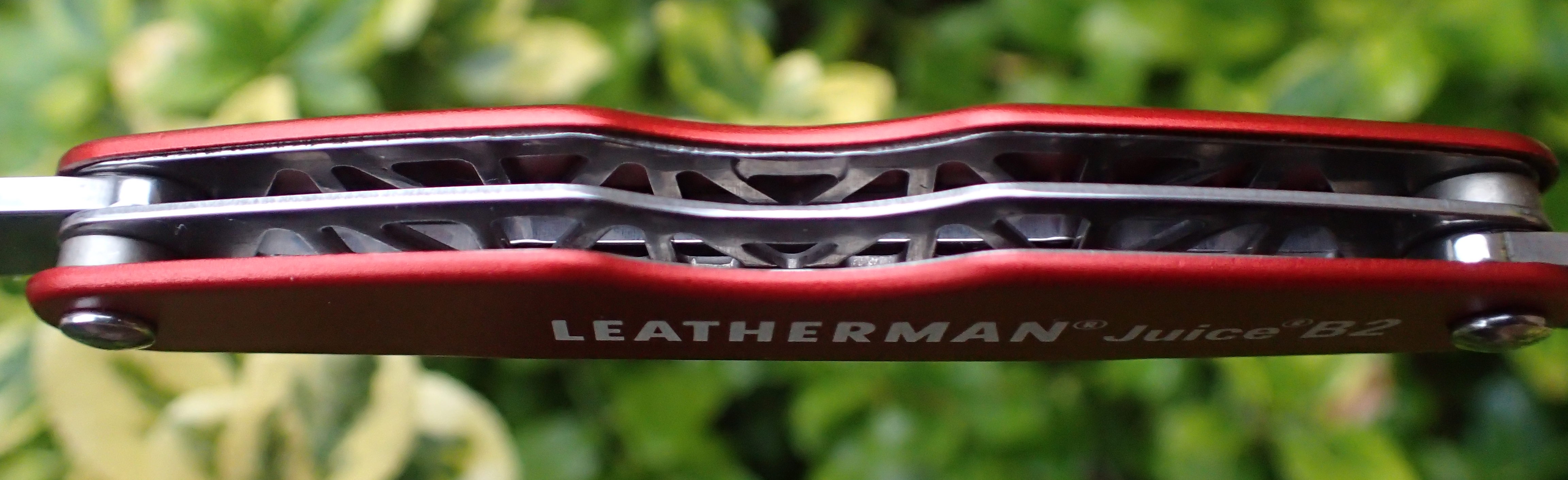 This is not a large tool. All of the Juice line-up were ‘mid-size’ Leathermans and are of a size that is far less noticable and bulky than any full size multi-tool yet provides a good degree of robustness over the smaller keychain sized offerings. This ‘half-Juice’ is even less conspicuous than any full size Juice. The inner frame is skeletonised to reduce weight. Obviously a successful practice, this does also mean that pocket fluff and debris can easily collect in the inner hole cut-outs and can be difficult to dislodge. However a periodic swish around in soapy water, followed by thorough drying out on a radiator and oiling would mostly sort that.