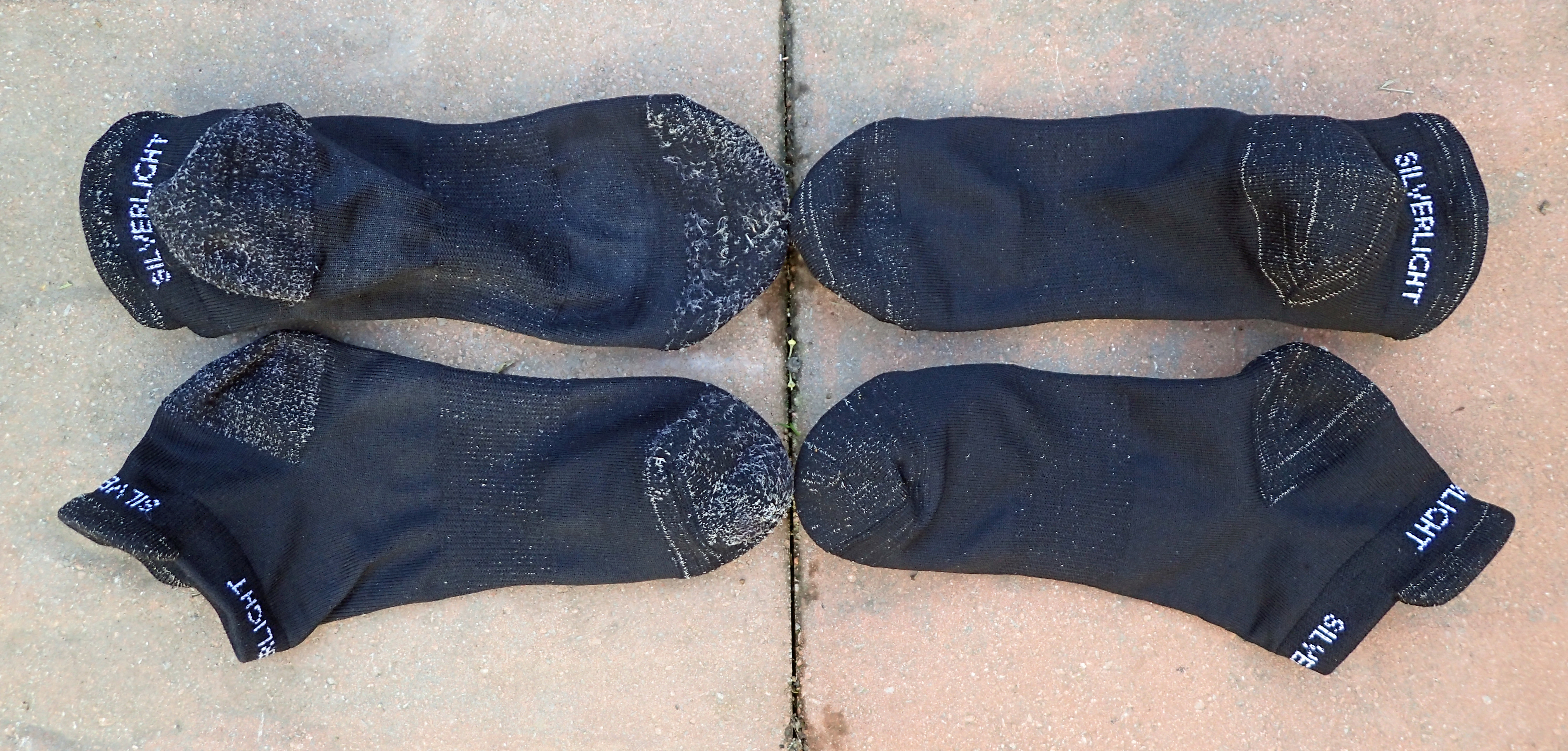 There is a fourth component- compression comes from a small amount of spandex. I am not a fan of spandex, or elastane (a stretchy polyurethane based synthetic fibre) as it takes longer than many materials to dry and stinks a bit in itself, but it is a very minor material in these socks and probably essential for the form fitting. We are informed that the spandex helps provide arch support which can aid people with Plantar fasciitis. As someone who has suffered with this in the past, one can only hope. With these four materials the socks hug without being constrictive and are super comfy. Does the silver work? All I can say is that I haven’t had stinky Silverlight socks following a hike yet and have used them on multiple days without washing in between.