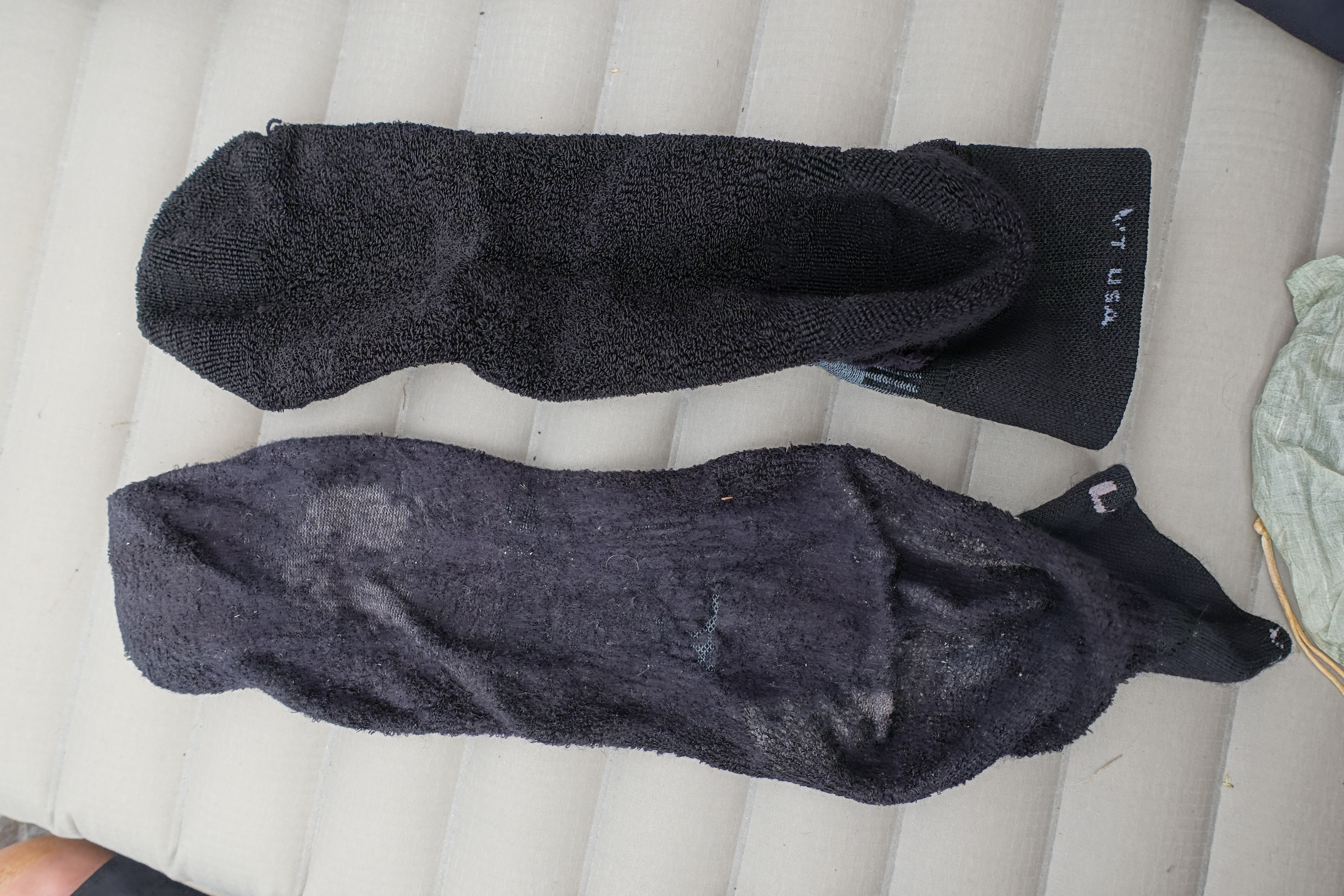 Every hiker spends a great deal of time on their feet. Trail miles are hard on the body, shoes or boots and the barrier between them- the socks. For the past few years Three Points of the Compass has primarily been using Darn Tough socks. The Hiker 1/4 sock light cushion are 51% nylon, 45% merino, 4% spandex though other models have slightly differing composition. These are comfortable socks that I have worn for thousands of miles, not least a two-thousand mile continuous hike across the UK. These are a tight weave sock with lifetime warranty, though personally, I have never has any issue with simply purchasing replacement pairs when they are worn out. And they do, all socks will, particularly if fine grit works its way through breathable mesh trail shoes into the sock pile where it will grate and wear away at the sock.