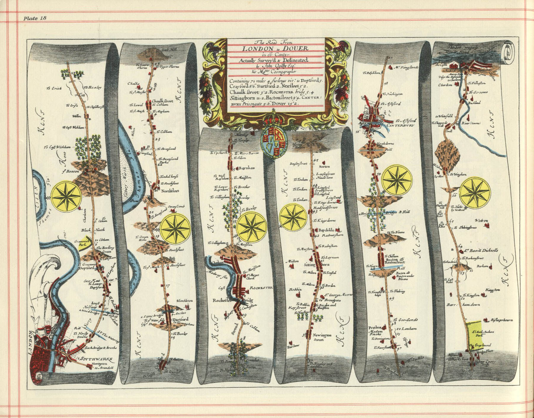 Plate 18 from Ogilby’s Britannia of 1675 showing the road between London and Dover through the county of Kent