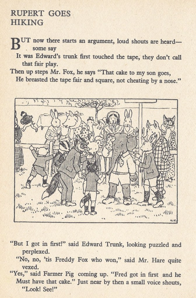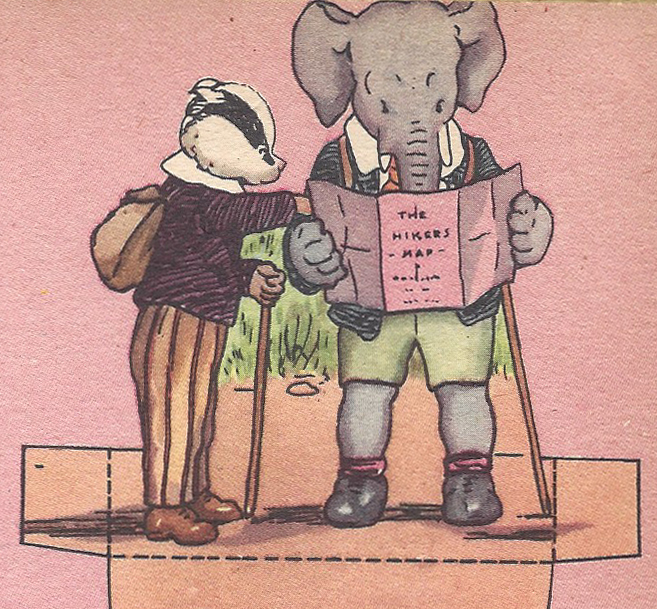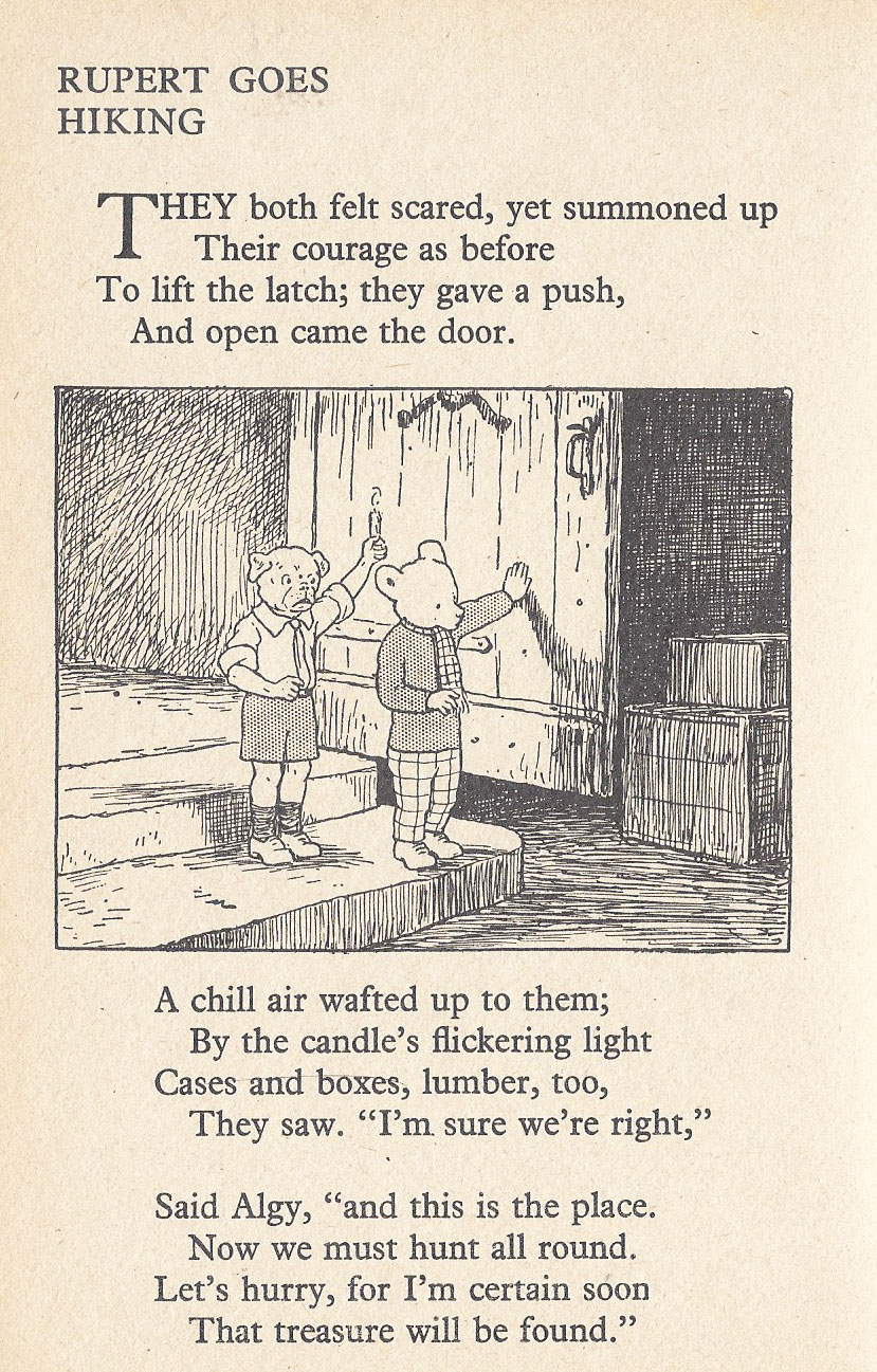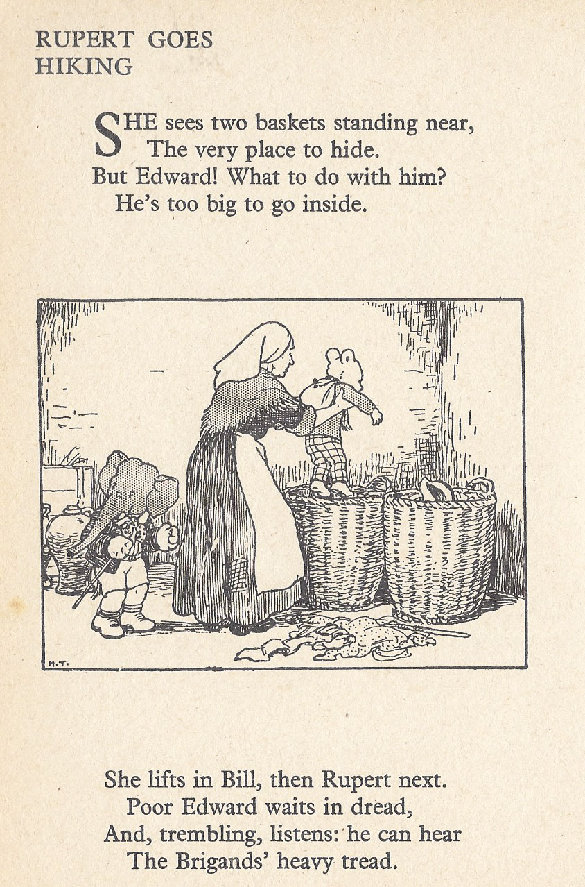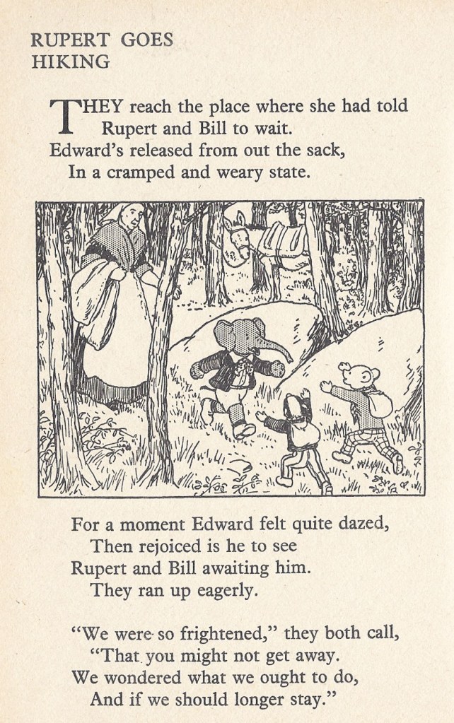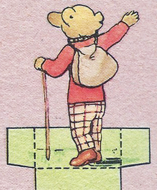 Rupert goes Hiking was also included in one of the ‘Monster Rupert ‘ compilation books published and reprinted in the 1930-50’s. The other three stories included in this volume were: Rupert in Trouble Again, Rupert and the Old Man of the Sea and Rupert and the Wilful Princess. Alongside the stories, coloured figures from story panels could be carefully cut out and the stories acted out by children.