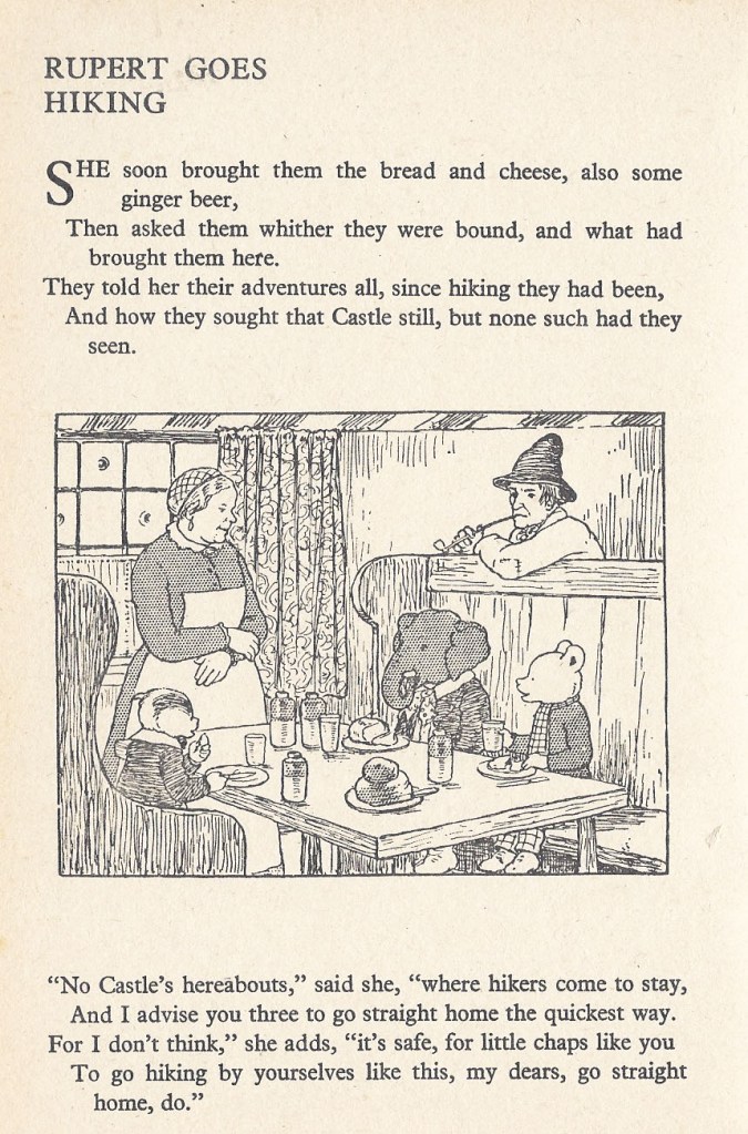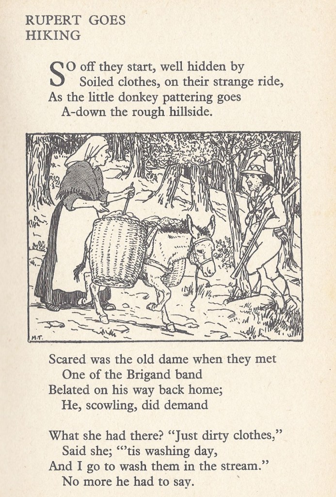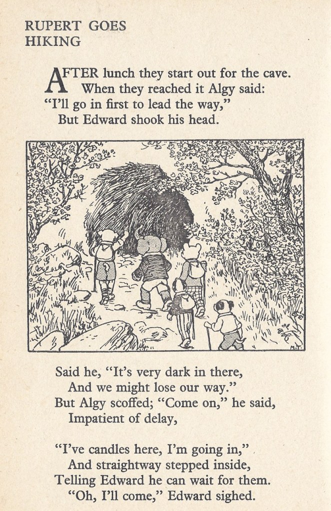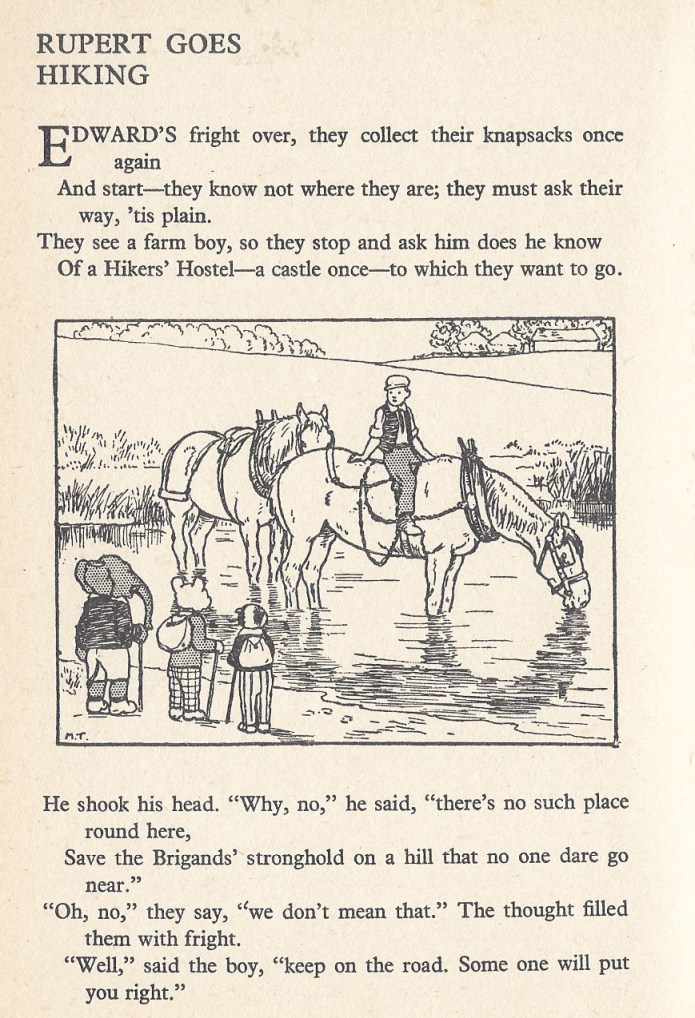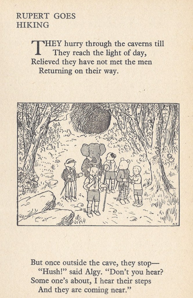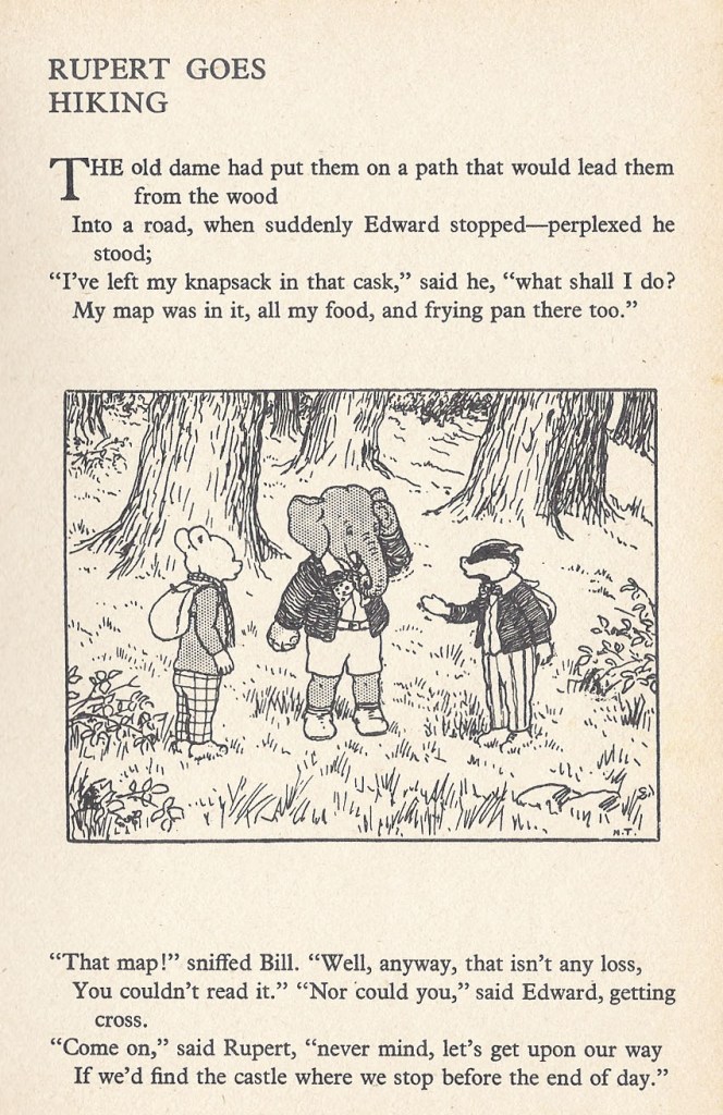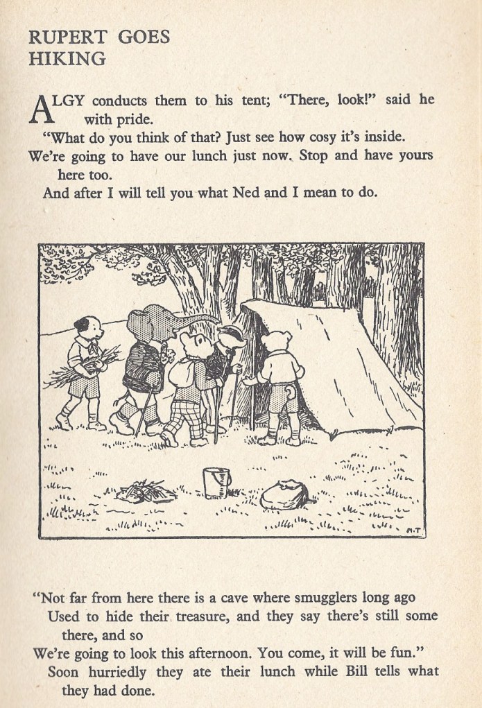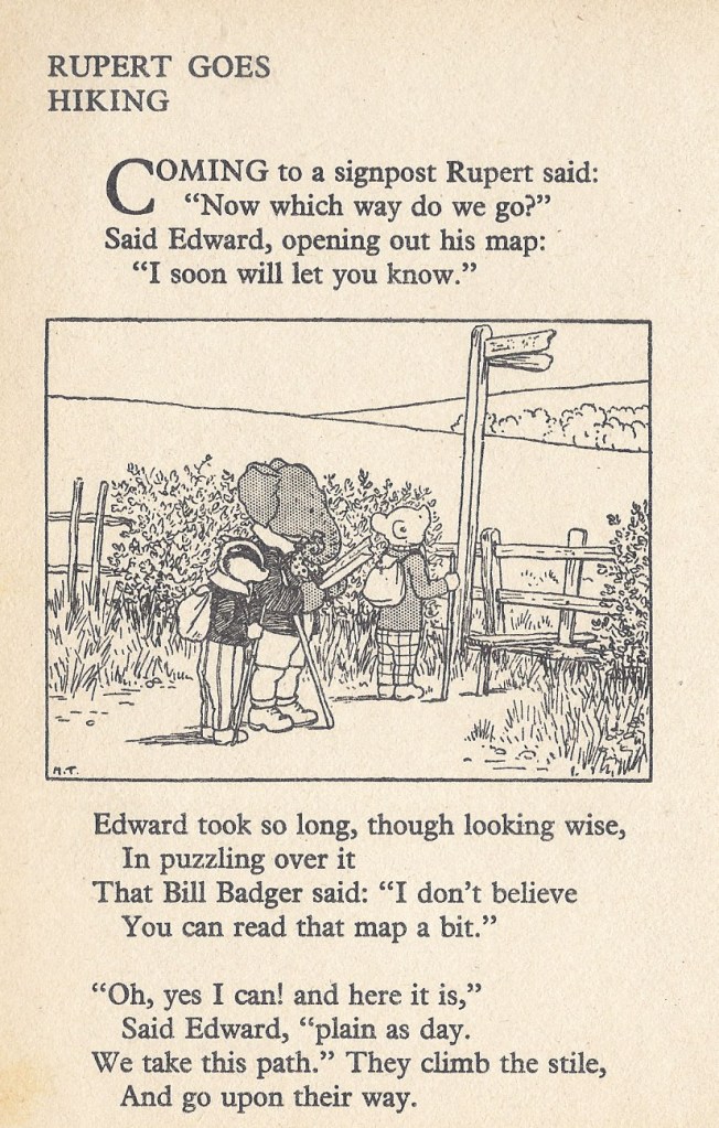 The Rupert Bear character belongs to a nostalgic world, one where a young bear could sally forth, find adventure and excitement, nothing too perilous, and still return home in time for tea. ‘Rupert goes Hiking ‘ was a 58 panel story that originally appeared in the Daily Express newspaper 27 June 1932 to 1 September 1932 The panels are reproduced at the end of this blog.