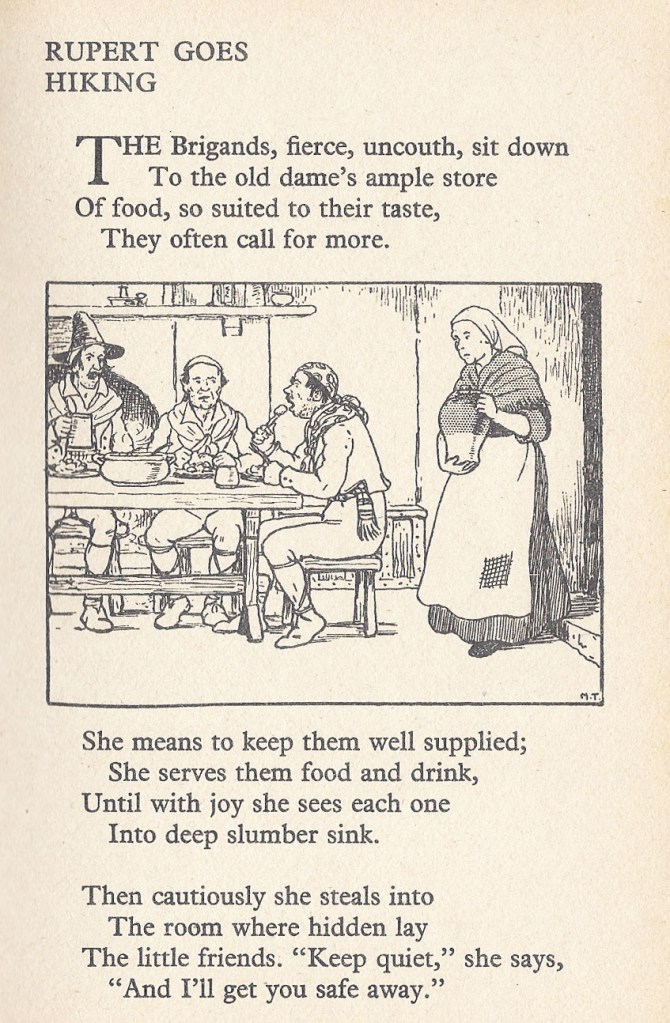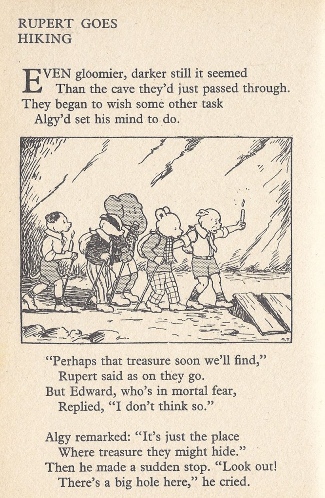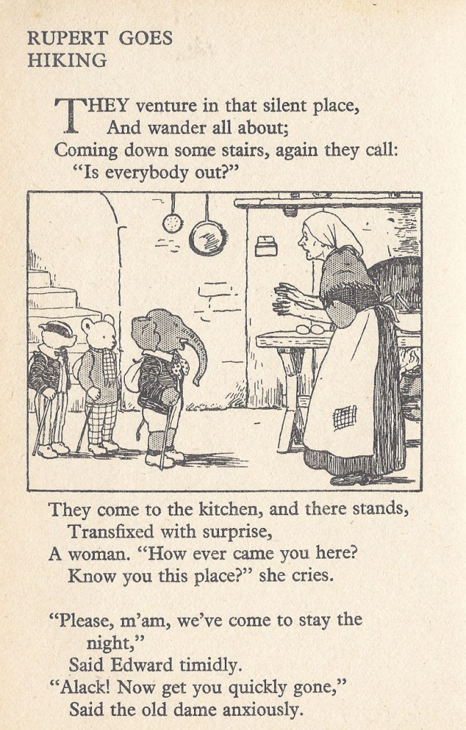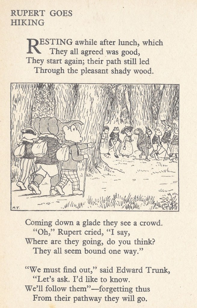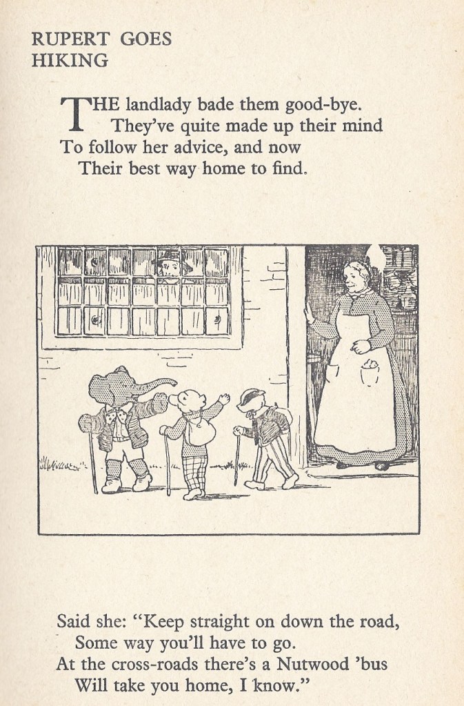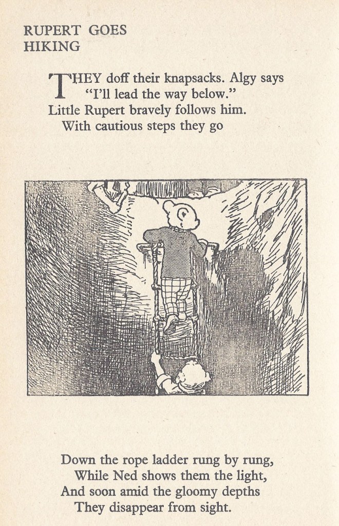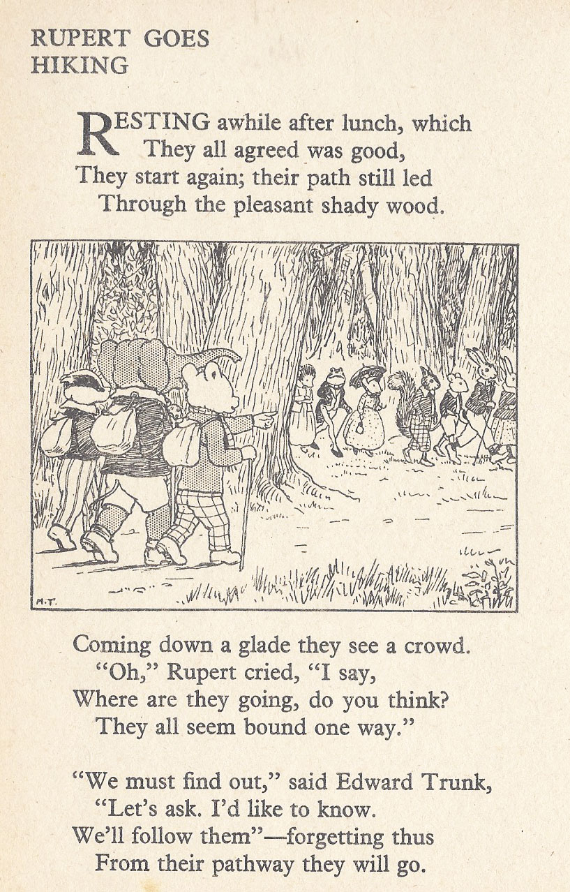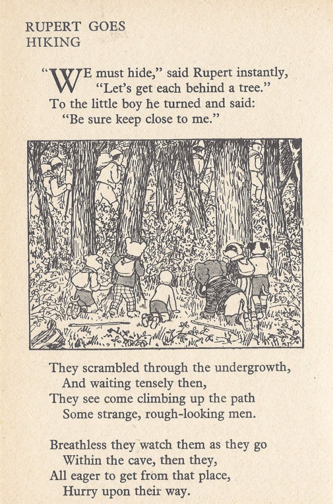 The Rupert Bear character belongs to a nostalgic world, one where a young bear could sally forth, find adventure and excitement, nothing too perilous, and still return home in time for tea. ‘Rupert goes Hiking ‘ was a 58 panel story that originally appeared in the Daily Express newspaper 27 June 1932 to 1 September 1932 The panels are reproduced at the end of this blog.