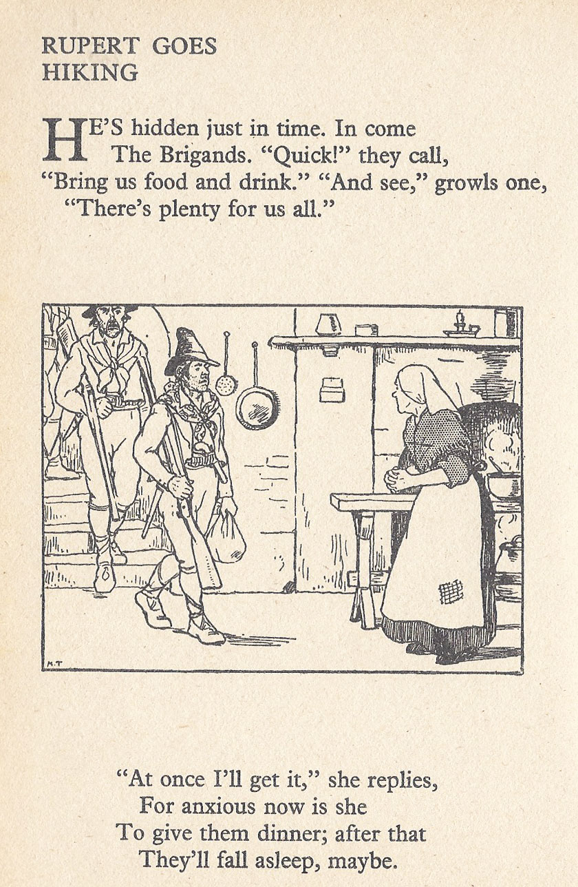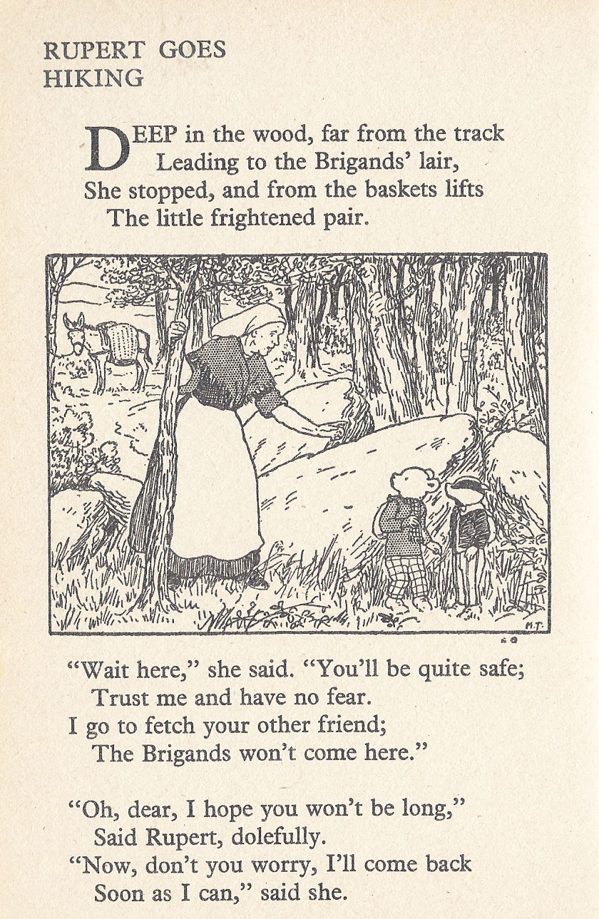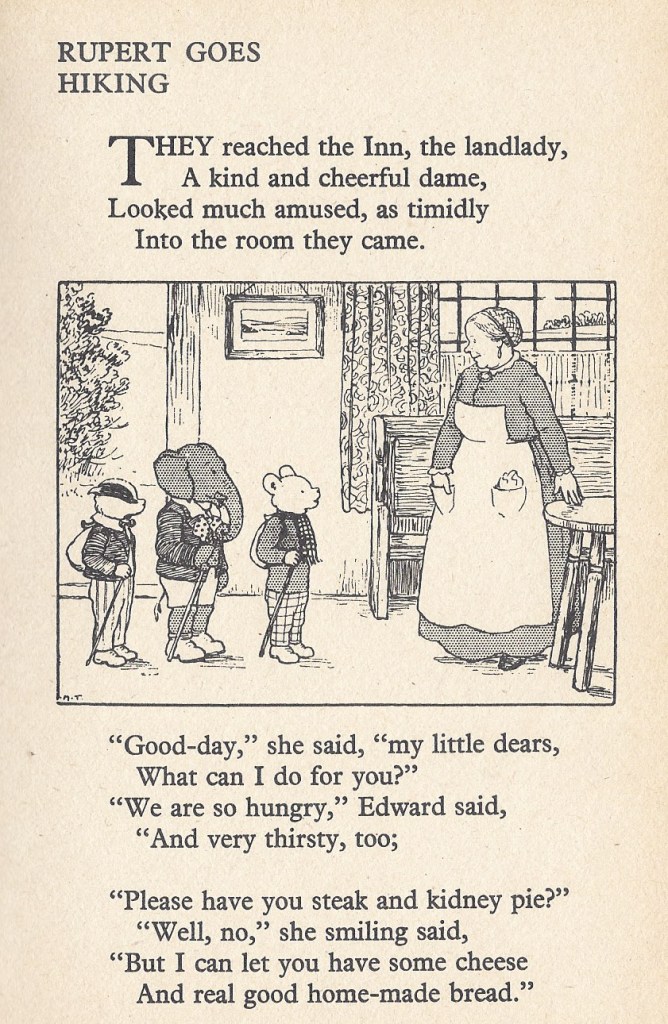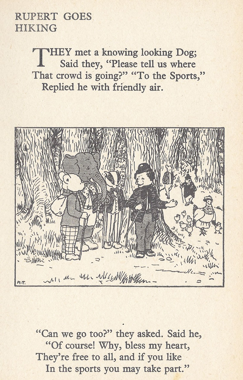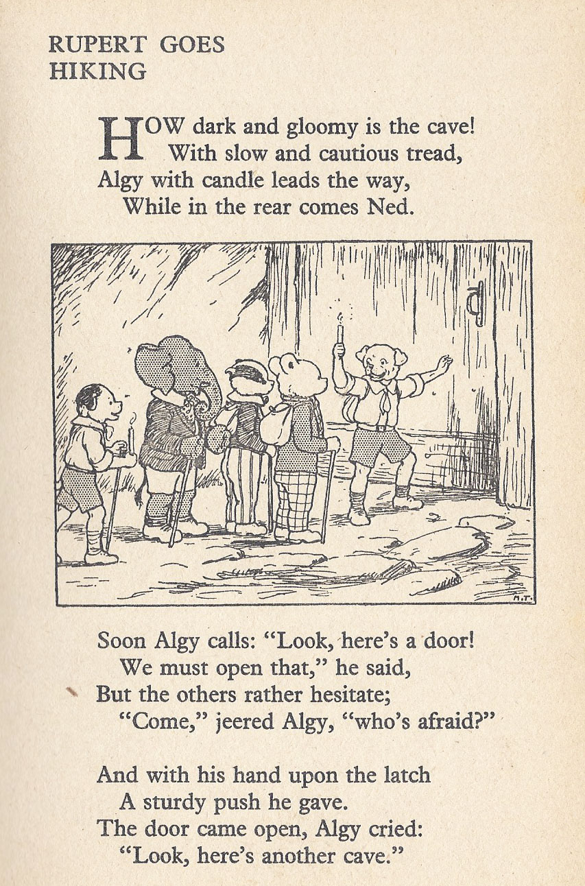 The Rupert Bear character belongs to a nostalgic world, one where a young bear could sally forth, find adventure and excitement, nothing too perilous, and still return home in time for tea. ‘Rupert goes Hiking ‘ was a 58 panel story that originally appeared in the Daily Express newspaper 27 June 1932 to 1 September 1932 The panels are reproduced at the end of this blog.
