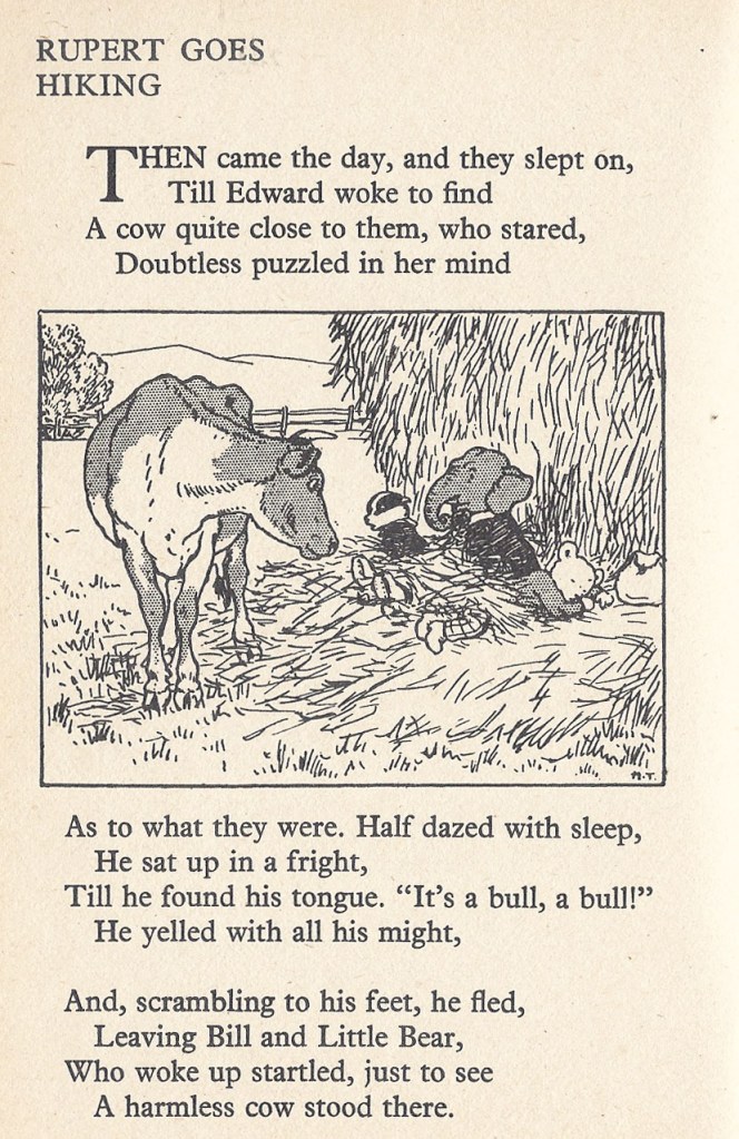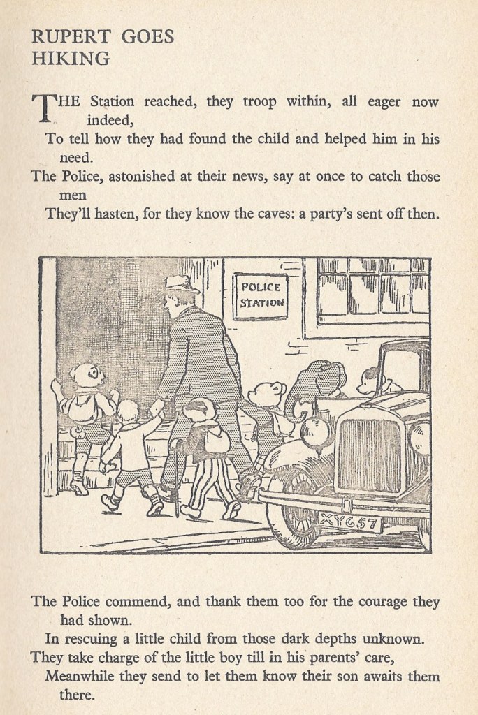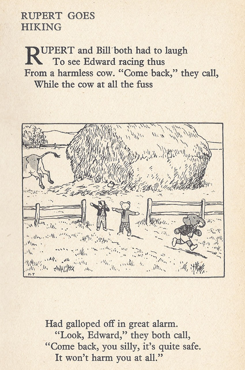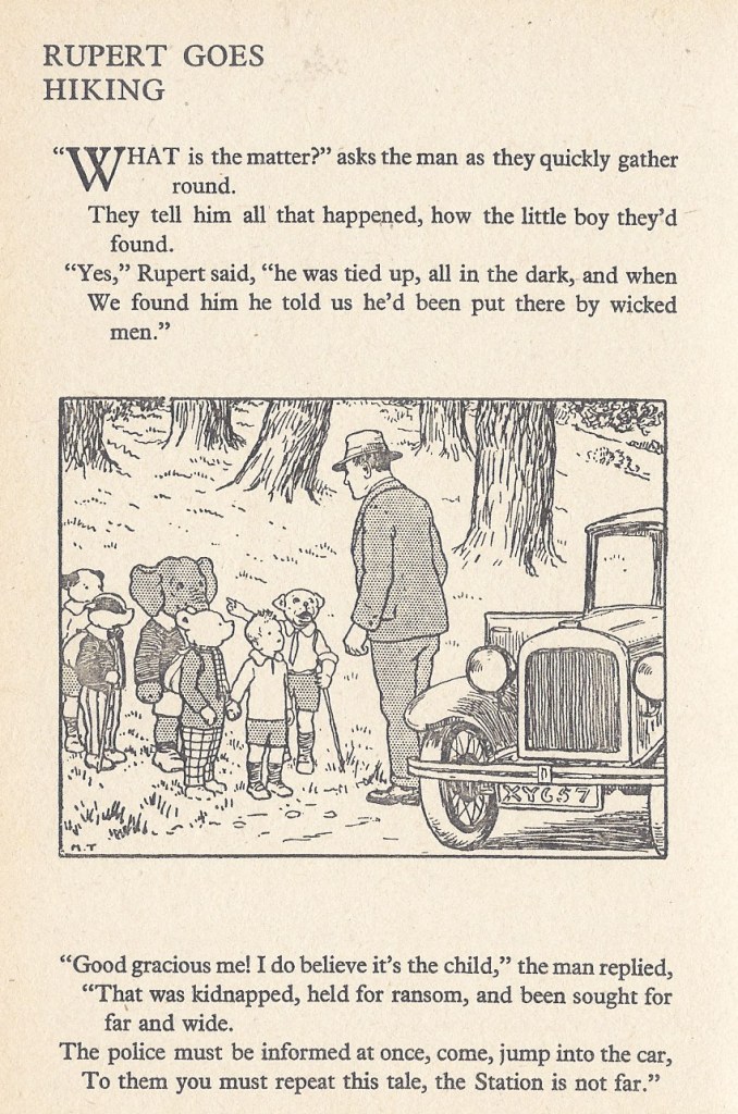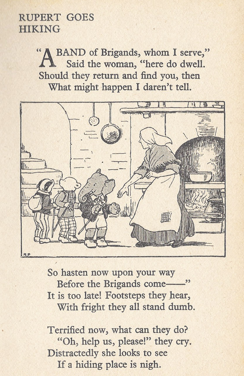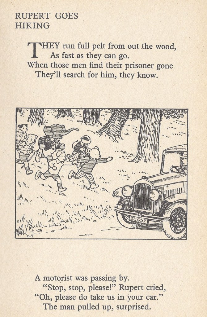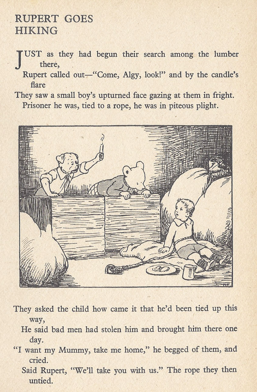 The Rupert Bear character belongs to a nostalgic world, one where a young bear could sally forth, find adventure and excitement, nothing too perilous, and still return home in time for tea. ‘Rupert goes Hiking ‘ was a 58 panel story that originally appeared in the Daily Express newspaper 27 June 1932 to 1 September 1932 The panels are reproduced at the end of this blog.