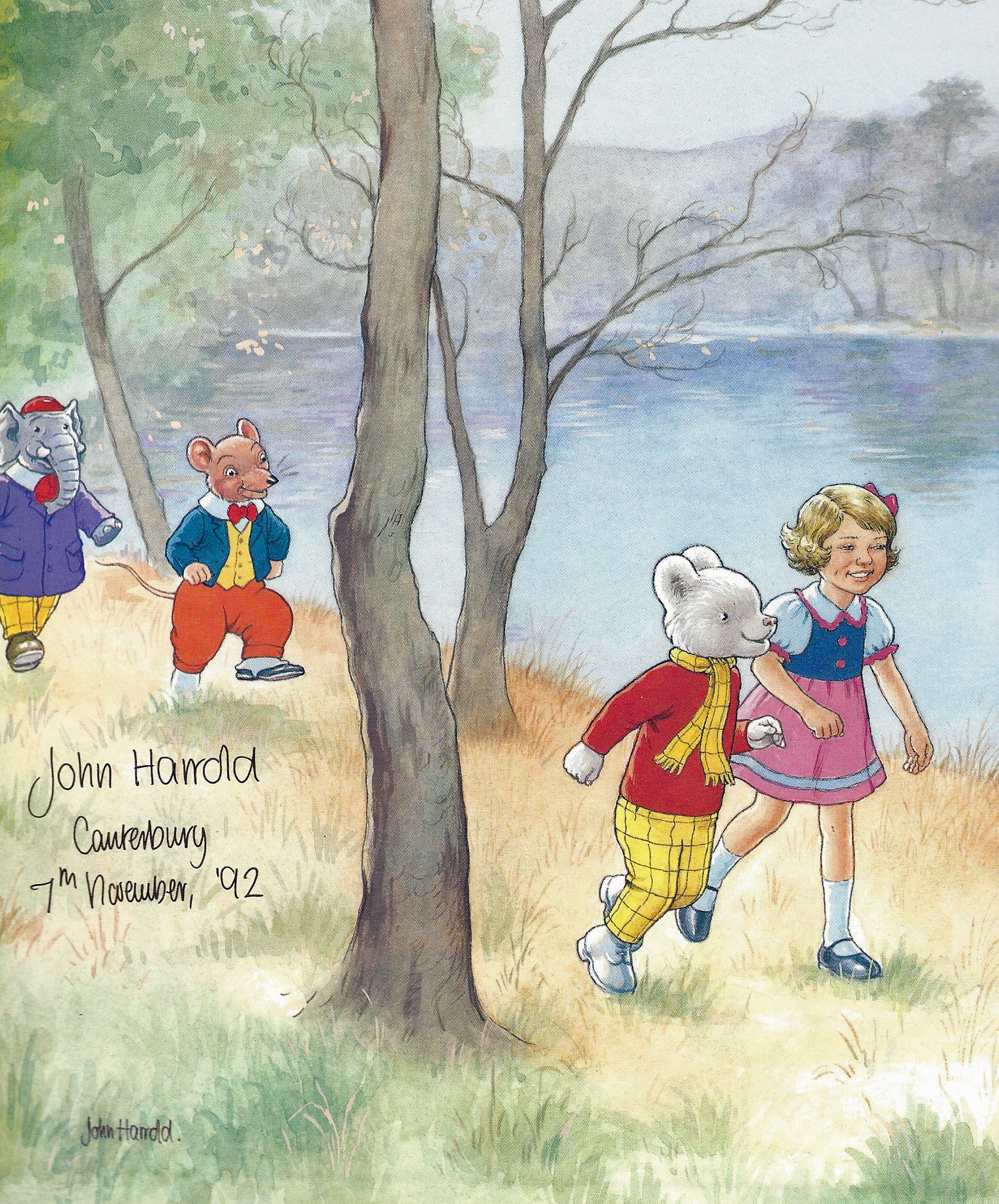 Though first depicted as a brown bear (with blue shirt and white check trousers), The colour of Rupert’s fur was changed in order to save ink and he began to appear with white fur in his stories, a practice that continues today, however he is normally shown as a brown bear on the covers of the various albums and books in which he features. Since Mary Tourtel, there have been various artists who have drawn Rupert and his adventures. Occasionally, having handed over the illustrator’s reins, an earlier illustrator’s work would be re-used, or they would return to the artist’s chair and contribute to subsequent publications.