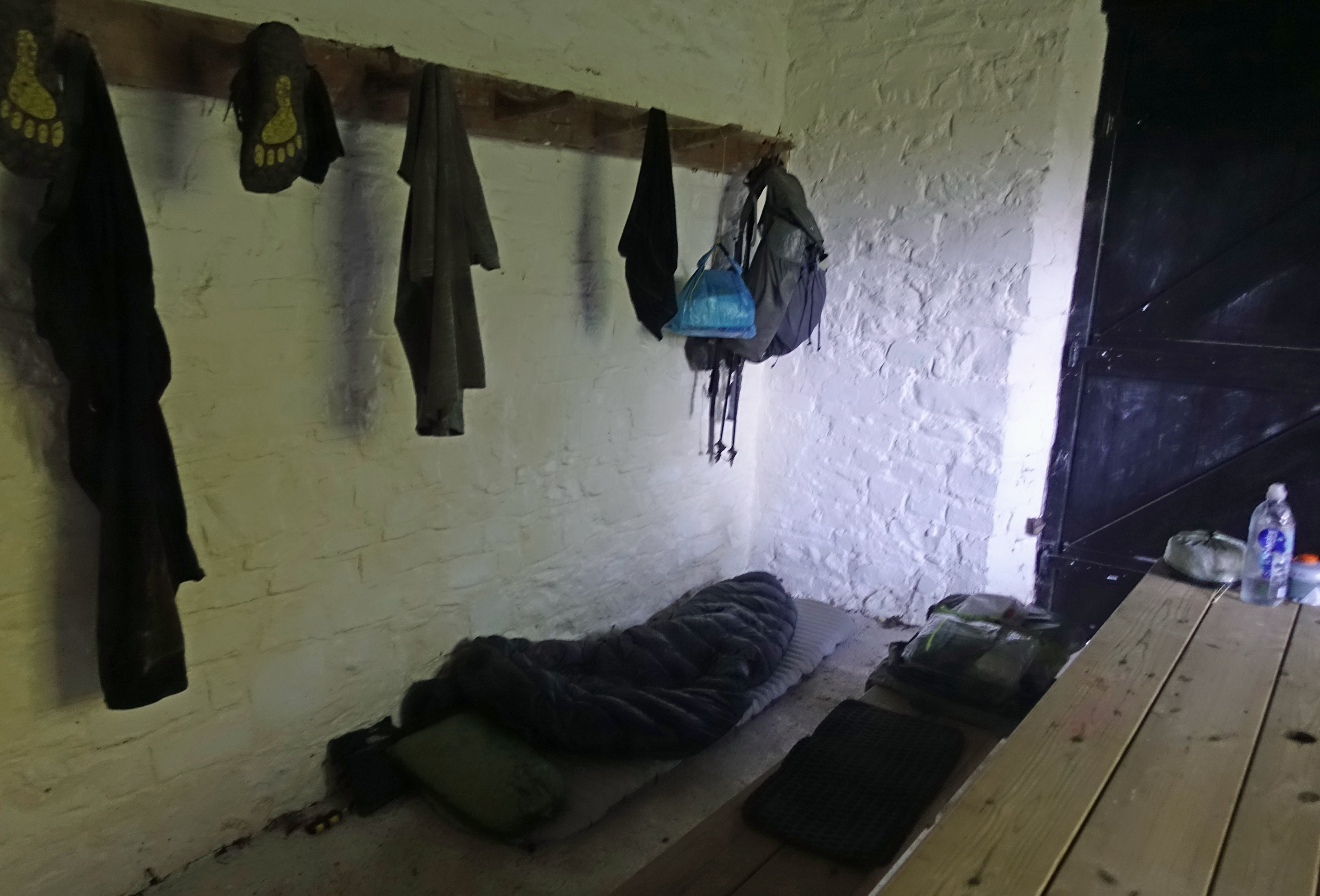 I cleaned the days grime off in the nearby stream, changed into insulation layers, cooked an evening meal and considered an early night as the inside grew dark from a combination of no internal lighting and small windows. I lit one of my few tea candles, lined up a second in case I needed it and began to write my trail journal. The door crashed open and Ken Maclean threw in his bag of coal and kindling and introduced himself. The evening improved immensely.
