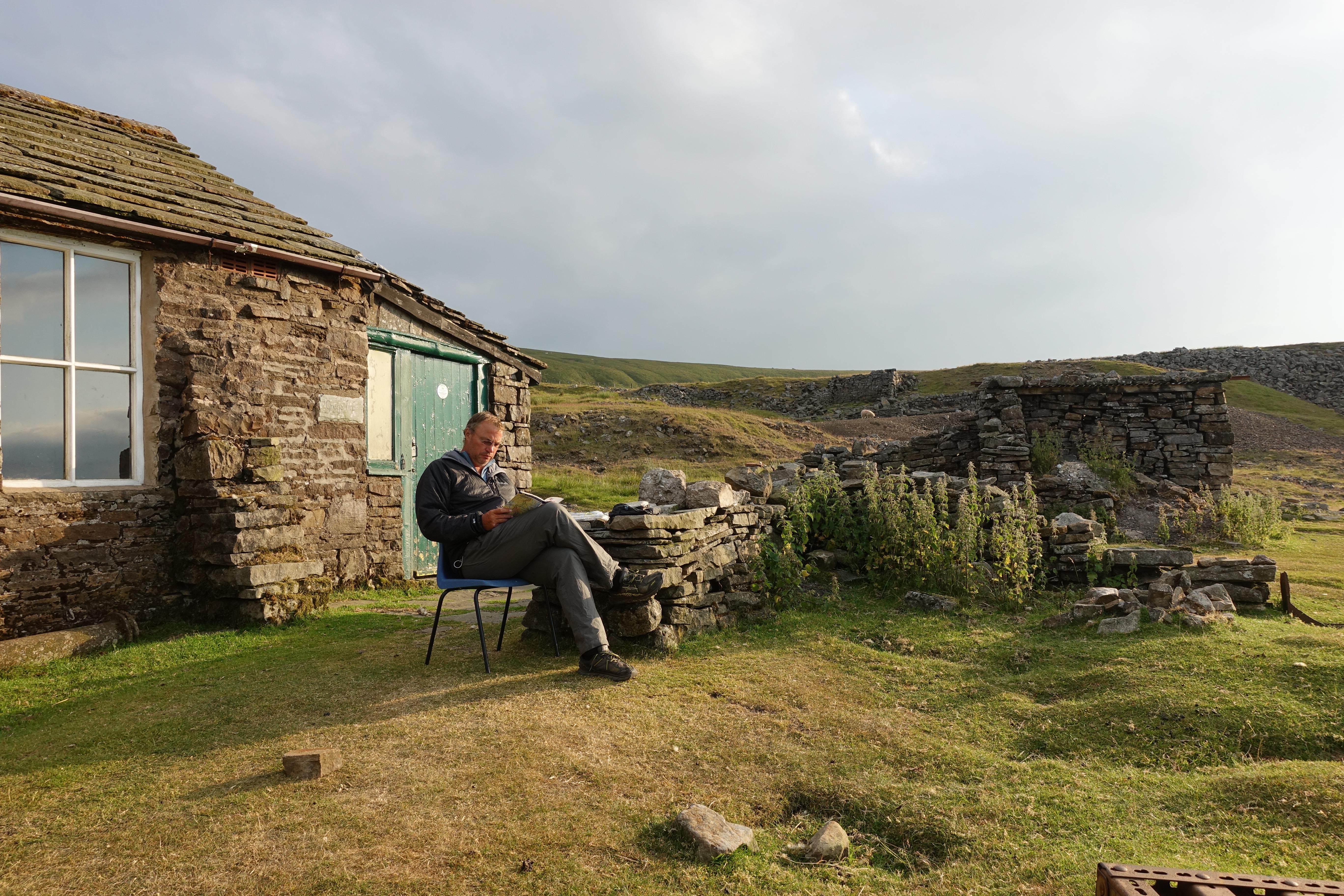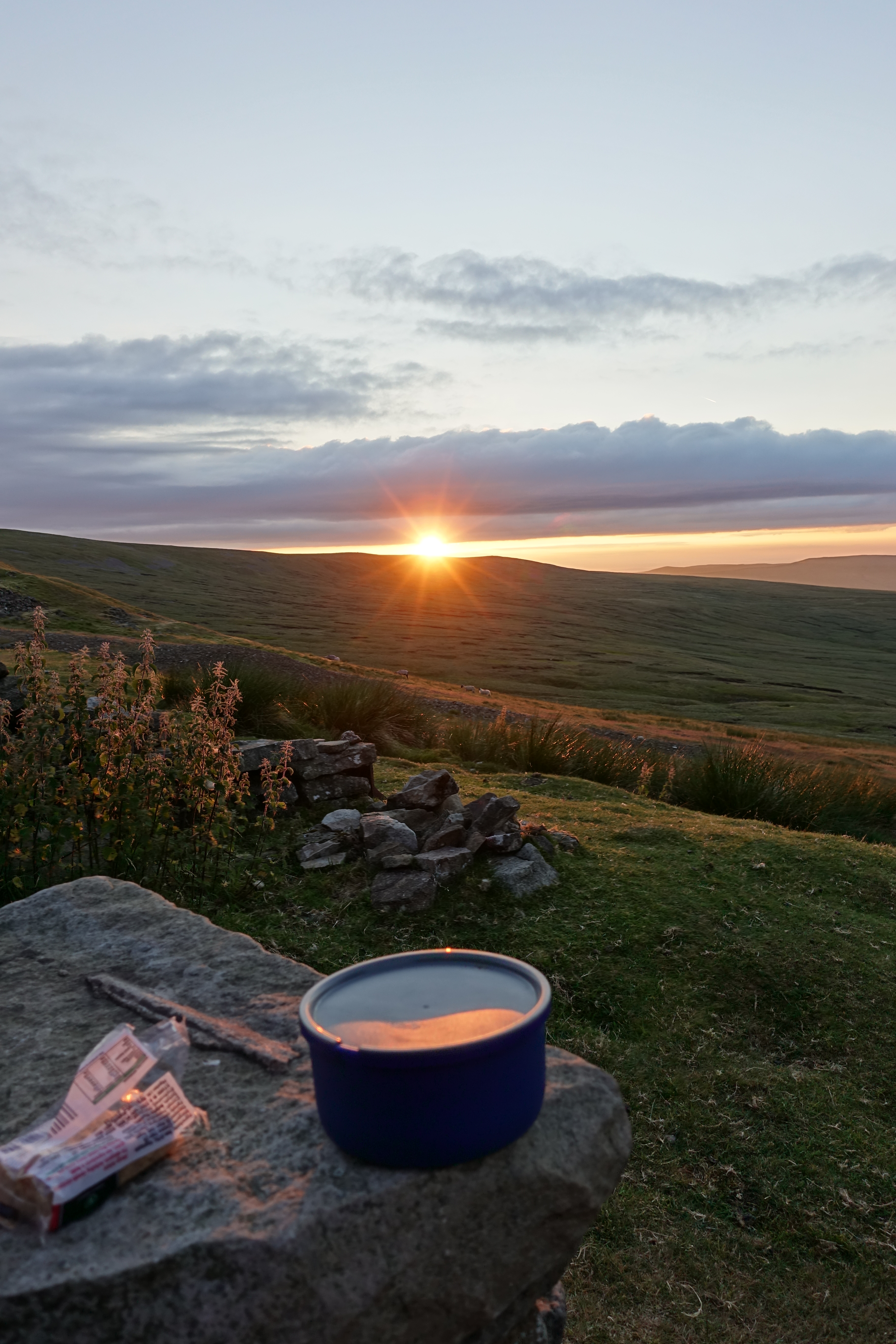 Dropping down off Cross Fell on the Pennine Way, Greg’s Hut was being used by a marshal to check through a stream of fell runners. I was stopping there the night and having made a brew I stood outside to watch the athletes pass, runners looking steadily less athletic as time passed. The last came through and the marshal left on his cycle toward Garrigill. I was left alone and sat outside to watch the sun set. Sheep on the slopes below me all also orienting themselves to watch the sun drop and the sky change colour. I heard voices carrying across the hills and an hour later Alex and his pink tracksuited young daughter Lexi arrived. Spartan bothies can be a shock to the uninitiated. In her mind she had built up her expectation of the bothy as some form of adventure palace and her face dropped when she viewed the simple interior and wooden sleeping platform. Within seconds she rallied, adjusted, played outside and then joined her experienced backpacking father, eating an endless array of sweets, making noodles and toasting marshmallows. She was still excitedly chatting at eleven when I dropped off.