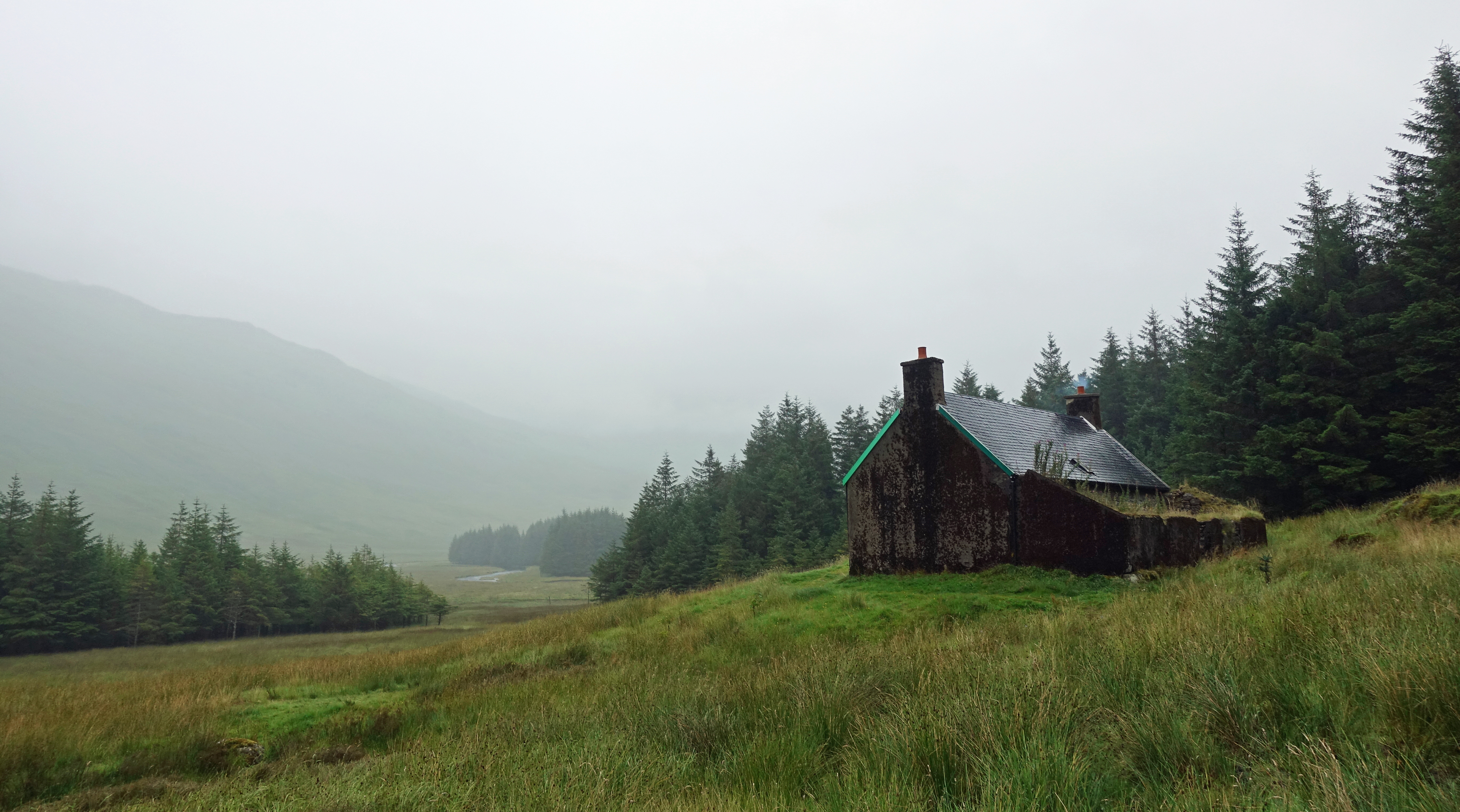 A’Chuil is a well-situated and appreciated halt. Particularly by those on the Cape Wrath Trail. As I approached the bothy on a damp evening having hiked in heavy rain for the best part of the day, I was welcomed by a smoking chimney. Despite the growing number of occupants, I was able to squeeze in to one of the rooms, joining David and James, and claim a space on one of the sleeping platforms. Before peeling off waterproofs, I went off to the neighbouring forest to gather fallen wood. Hikers continued to arrive for hours later. The weather had been atrocious and a crucial bridge further on down trail had been washed away. There was much discussion as to the wisdom of continuing. Later that evening, I spent half an hour demonstrating safe river crossing technique to a Dutch couple, the three of us linking arms and waltzing across the room.