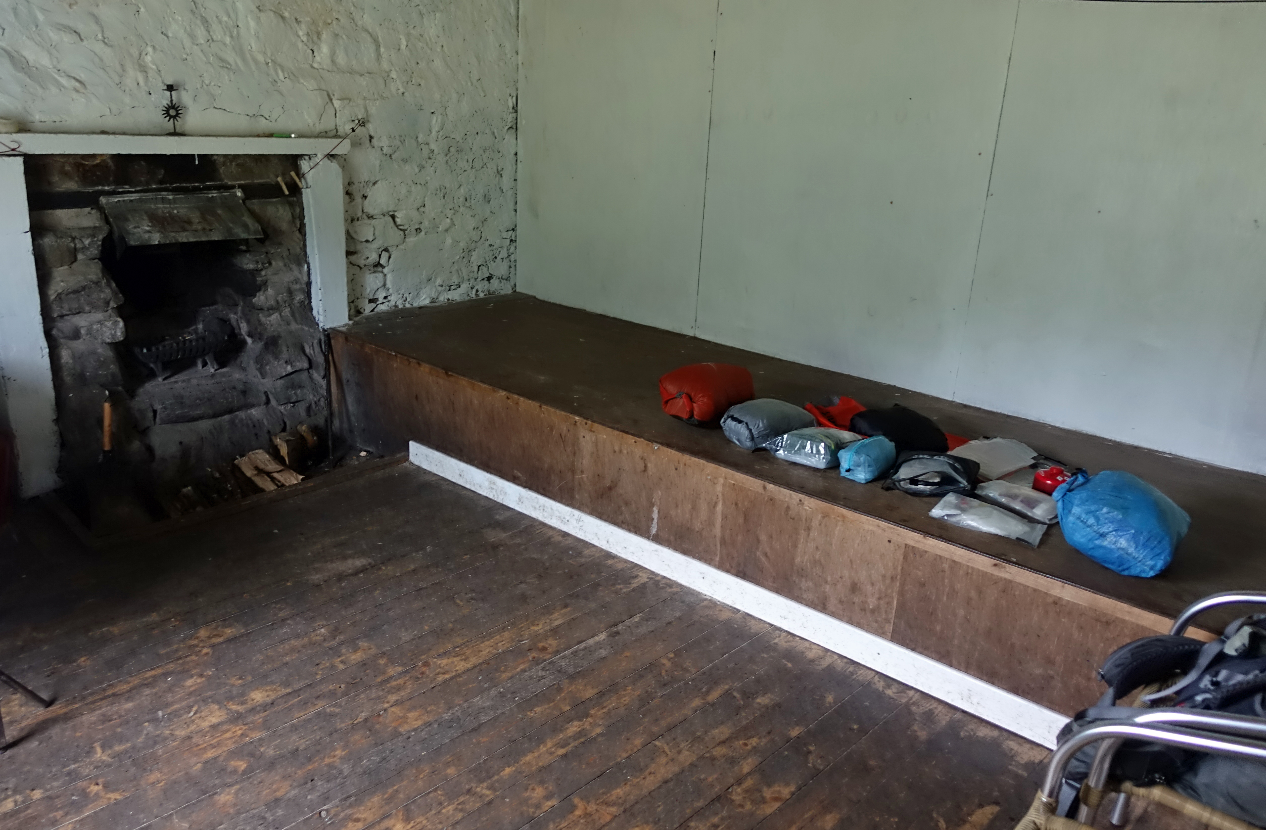 Having swept the floor and prepared the fire for the next visitor, a roll call of my gear spread out on the sleeping platform prior to packing and leaving. A’Chuil bothy, Western Highlands
