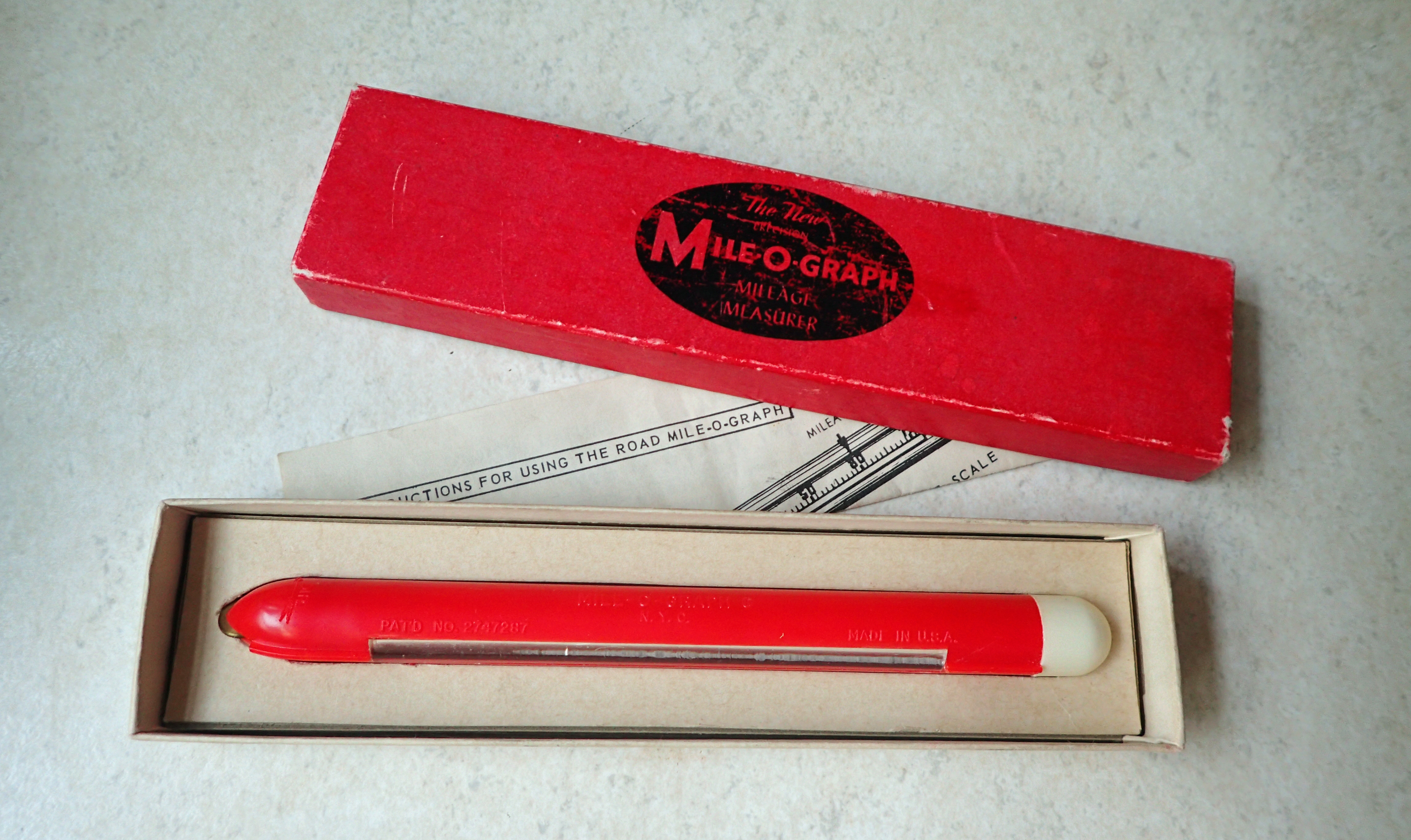 In 1956, the Mile-O-Graph measure was advertised in newspapers across the U.S. as ‘the “different” gift for every driver’. Usually priced at $2 each, this instrument was immediately intuitive to the user. Held like a pen, the small brass wheel could be rolled along lines on a map, be they road or path, and the distance easily read off.