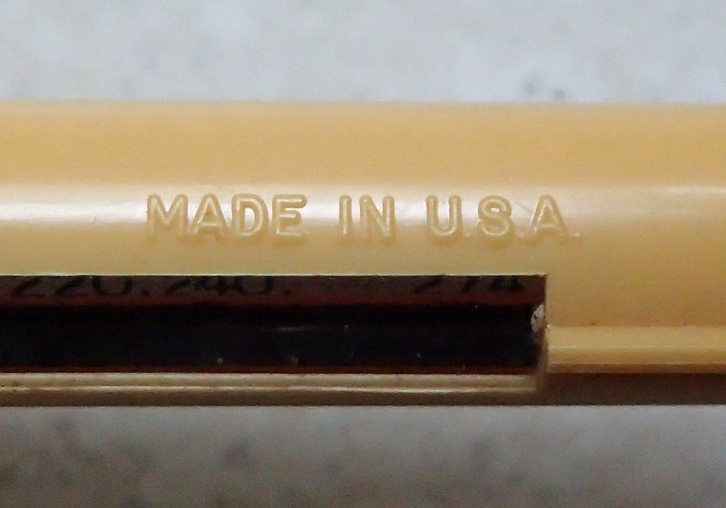 The plastic body and end cap for the measurers was made in three colours- black, red and white. The white has normally altered to a cream tint in the intervening years. There is a very yellowish cream bodied version that may be an off-white or is actually yellow, too many years have passed with consequent changes in the plastic medium to be sure. Just about any combination of the colours can be found and the colour of an instrument is no indicator of the type of measure that it is- mile, kilometer, nautical or engineering.