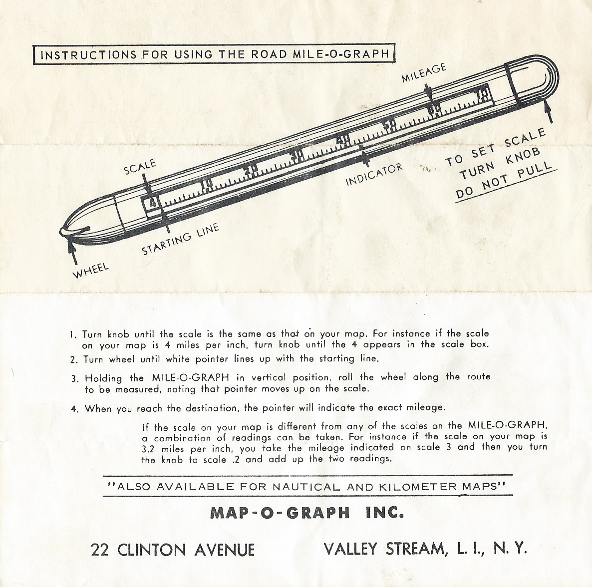 The name of the plastic measure was specific- Mile-O-Graph. From at least 1957, beside simply measuring miles, the instrument was also available with a nautical scale. Other versions had alternative scales for kilometers and other engineering purposes.