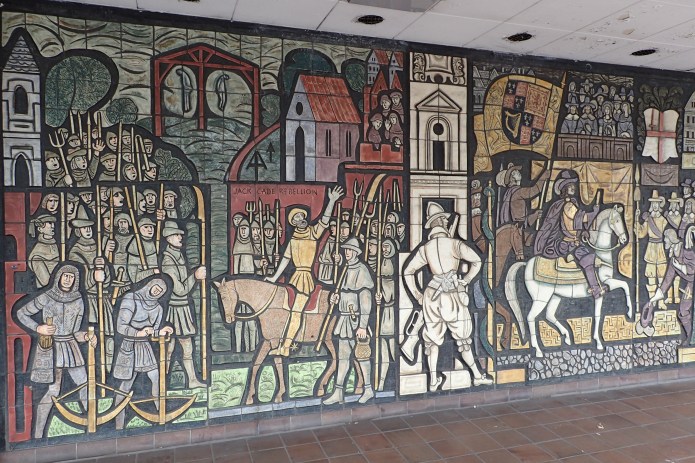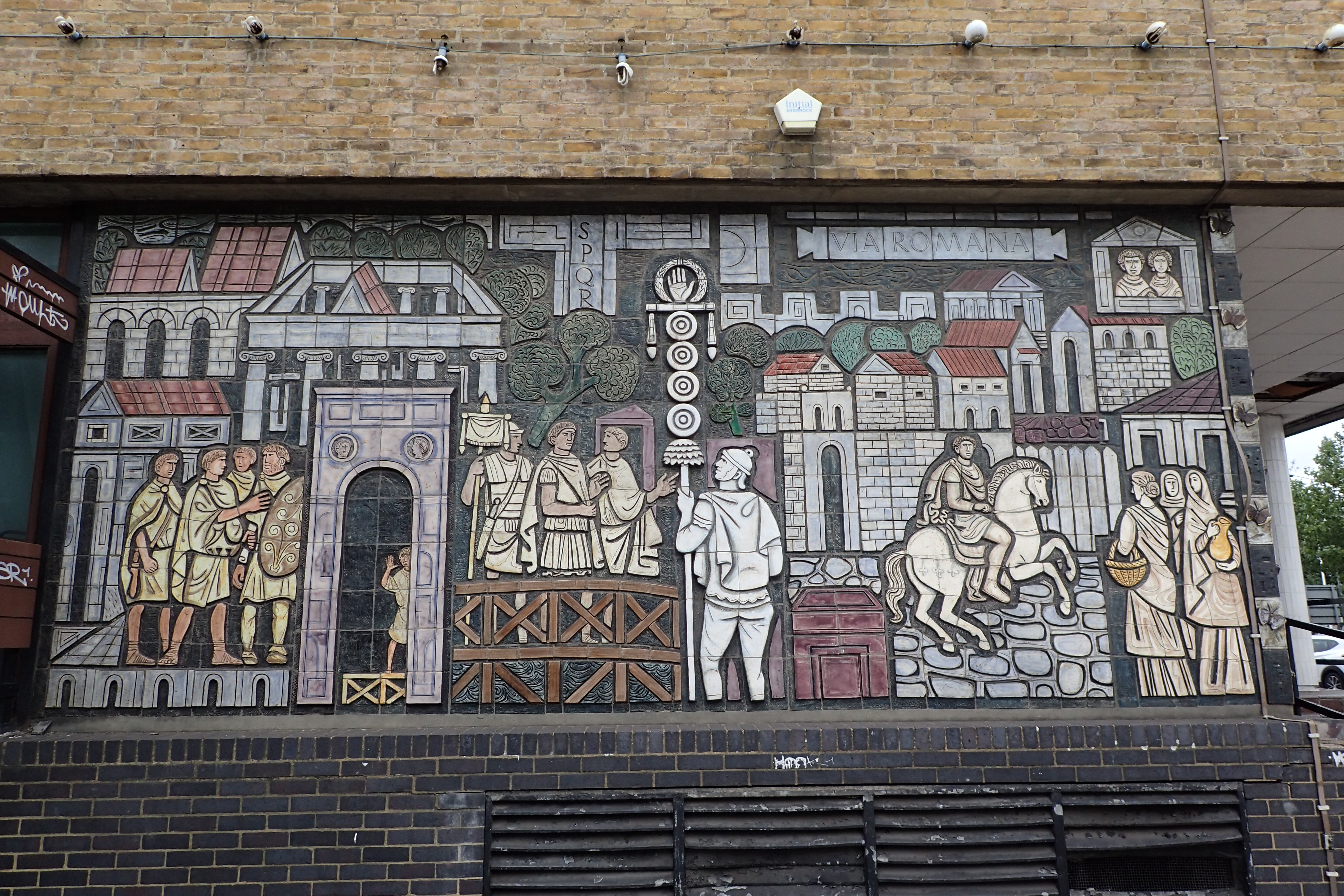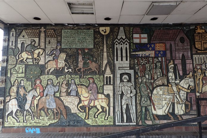 Through busy and smelly Bricklayers Roundabout and on to the Old Kent Road, and I soon crossed to look at the secular ceramic depicting much of the history of this road. Spread around two walls of the Everlasting Arms Ministries Church, formerly the North Peckham Civic Centre. The 2000 tile, 1000 square foot frieze had been created by the ceramics artist and sculptor Adam Kossowski in 1964 as thanks for his release from a Soviet labour camp. Besides Romans, Henry V, Charles II and the expected Chaucer pilgrims, there was also a (defaced) London bobby, pearly King and Queen and sad souls rotting on gibbets. It is fantastic. Then back to the roadside path and onward, heading out of London.