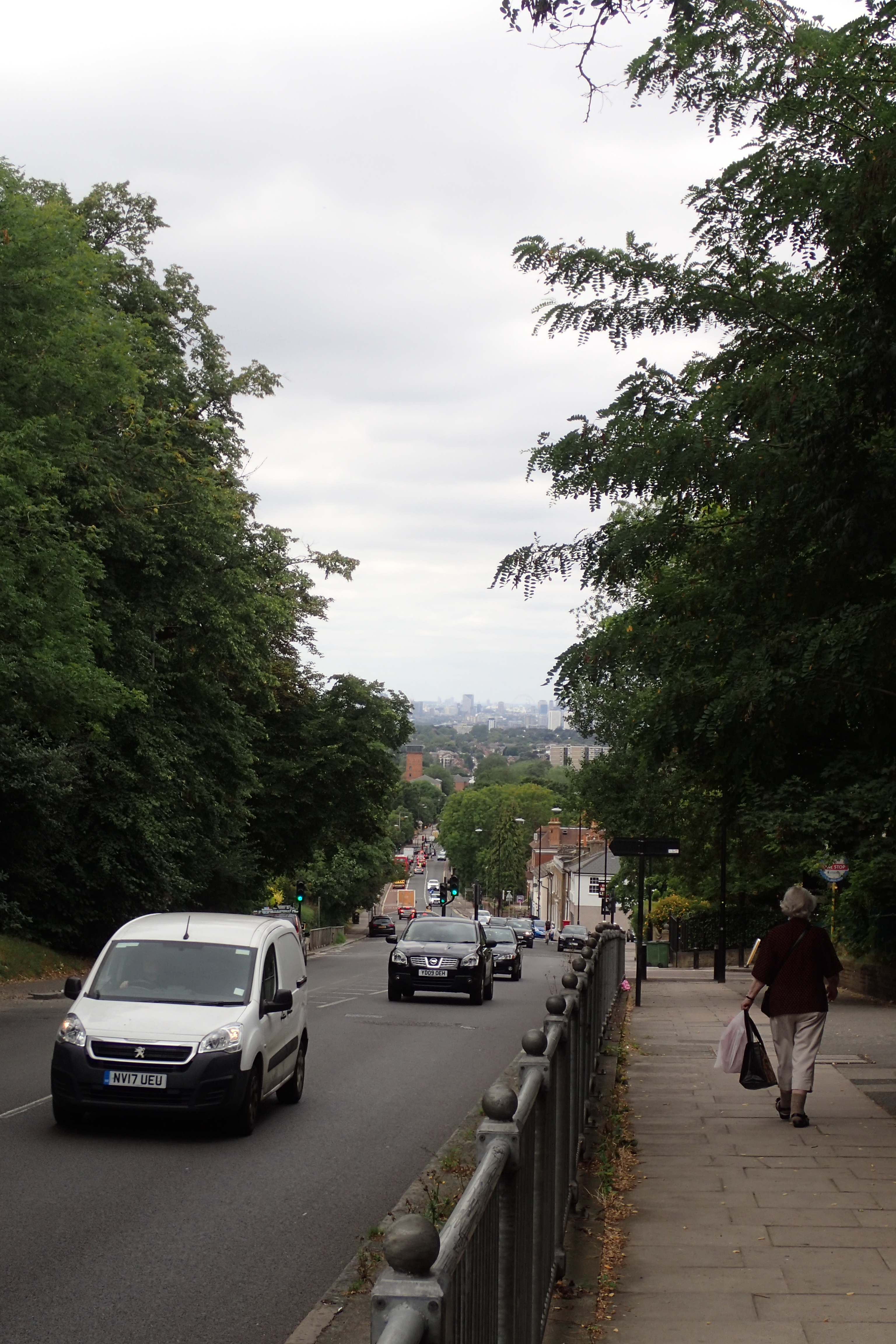 Climbing Shooters Hill , a glance backward reveals my departure point at the base of the distant Shard
