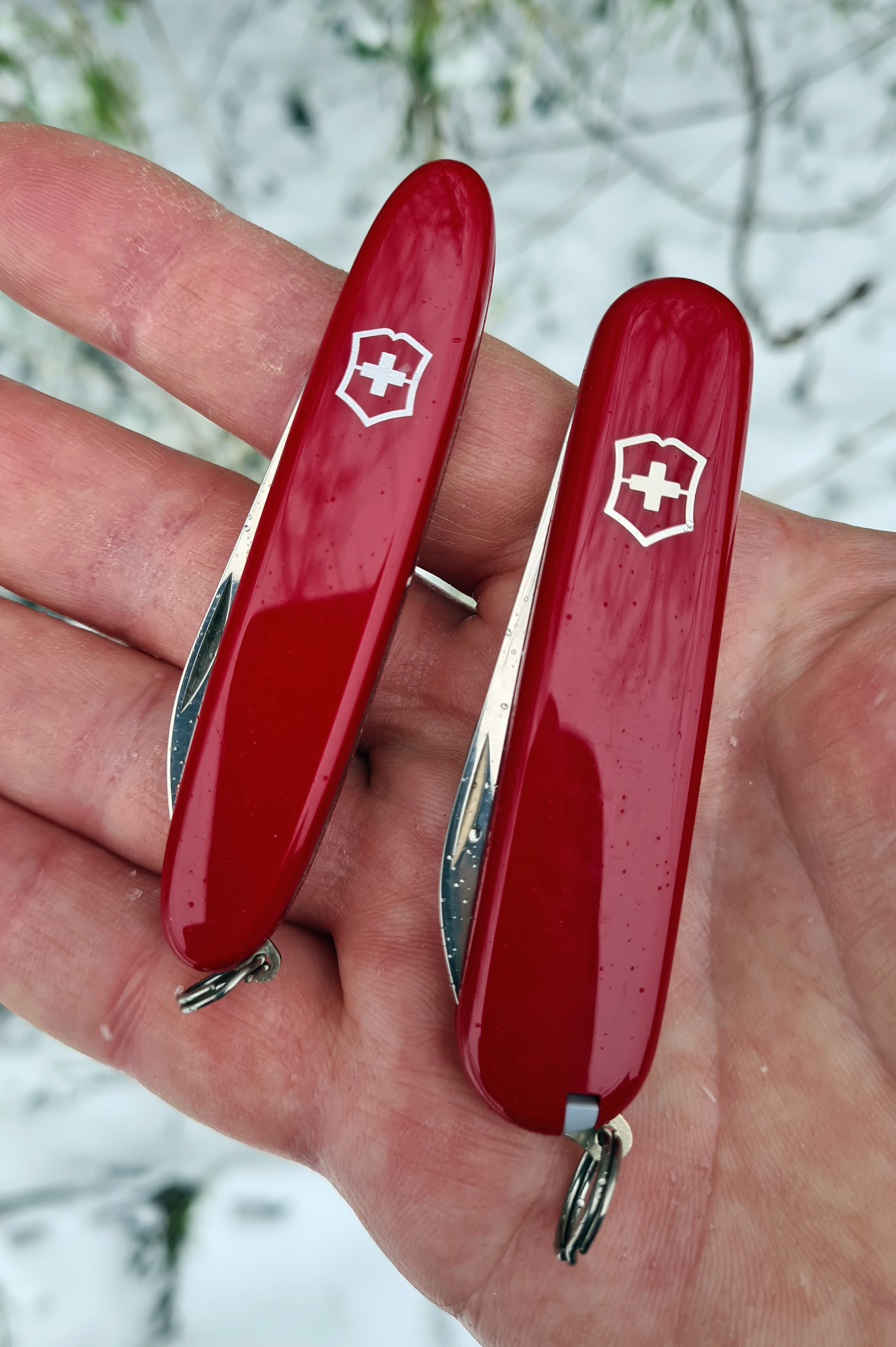 All of the small Excelsior range have a v-grind, drop point 58mm long ‘Large’ blade with a 52mm cutting edge. The spine of the stainless steel blade is 1.70mm thick. This is a little less than the 2.08mm steel used on the wider 84mm Victorinox knives such as the Bantam shown here beside an Excelsior. When open, the 84mm long tool fits more comfortably in the hand than smaller Vic options and permits slightly safer use of the slip-joint non-locking blade.