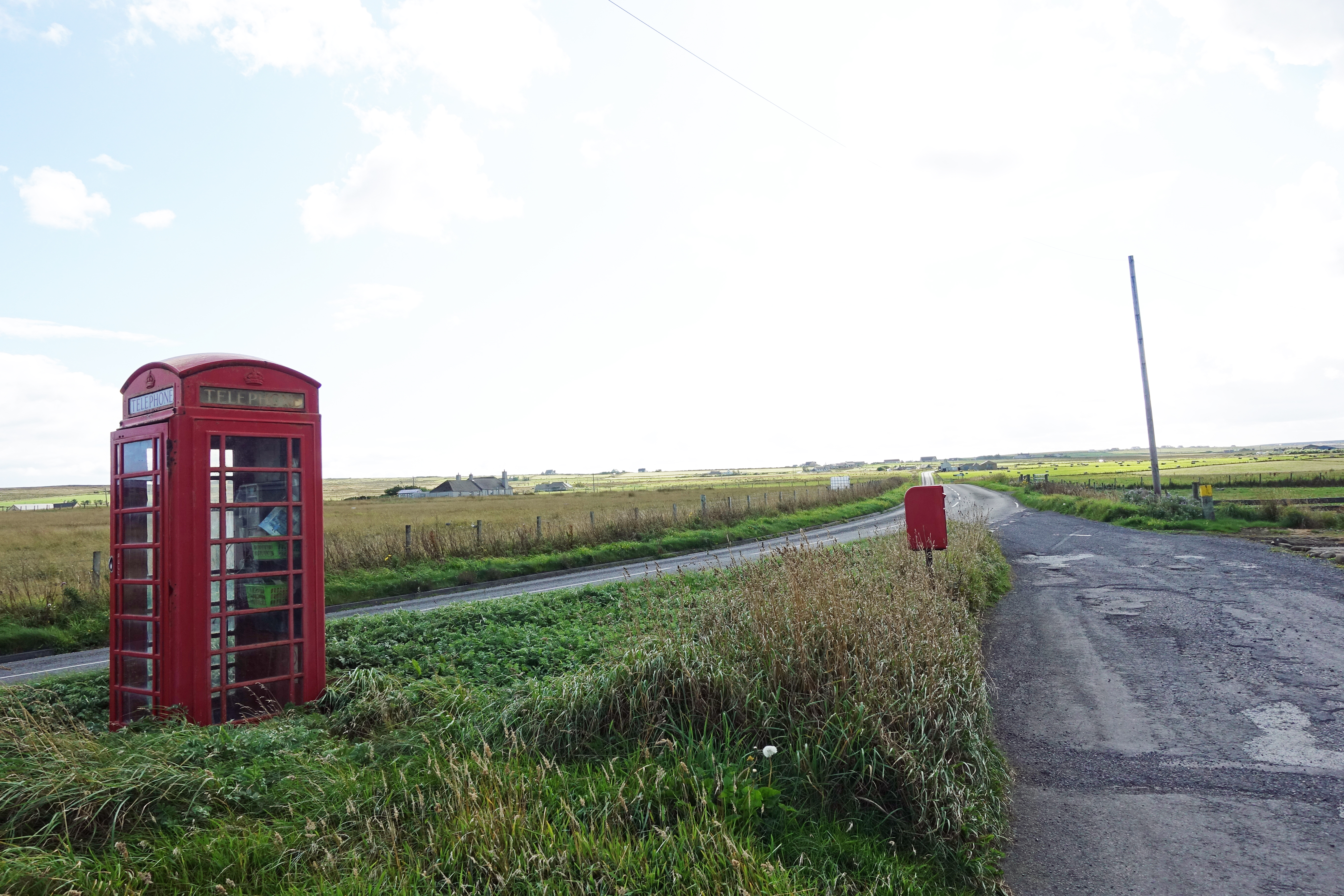 K6 kiosk on the road approaching John O’Groats. In the roll-out years of mobile phones in the UK, coverage could sometimes be patchy in lonely areas. Landlines from telephone kiosks were crucial for many years, less so today