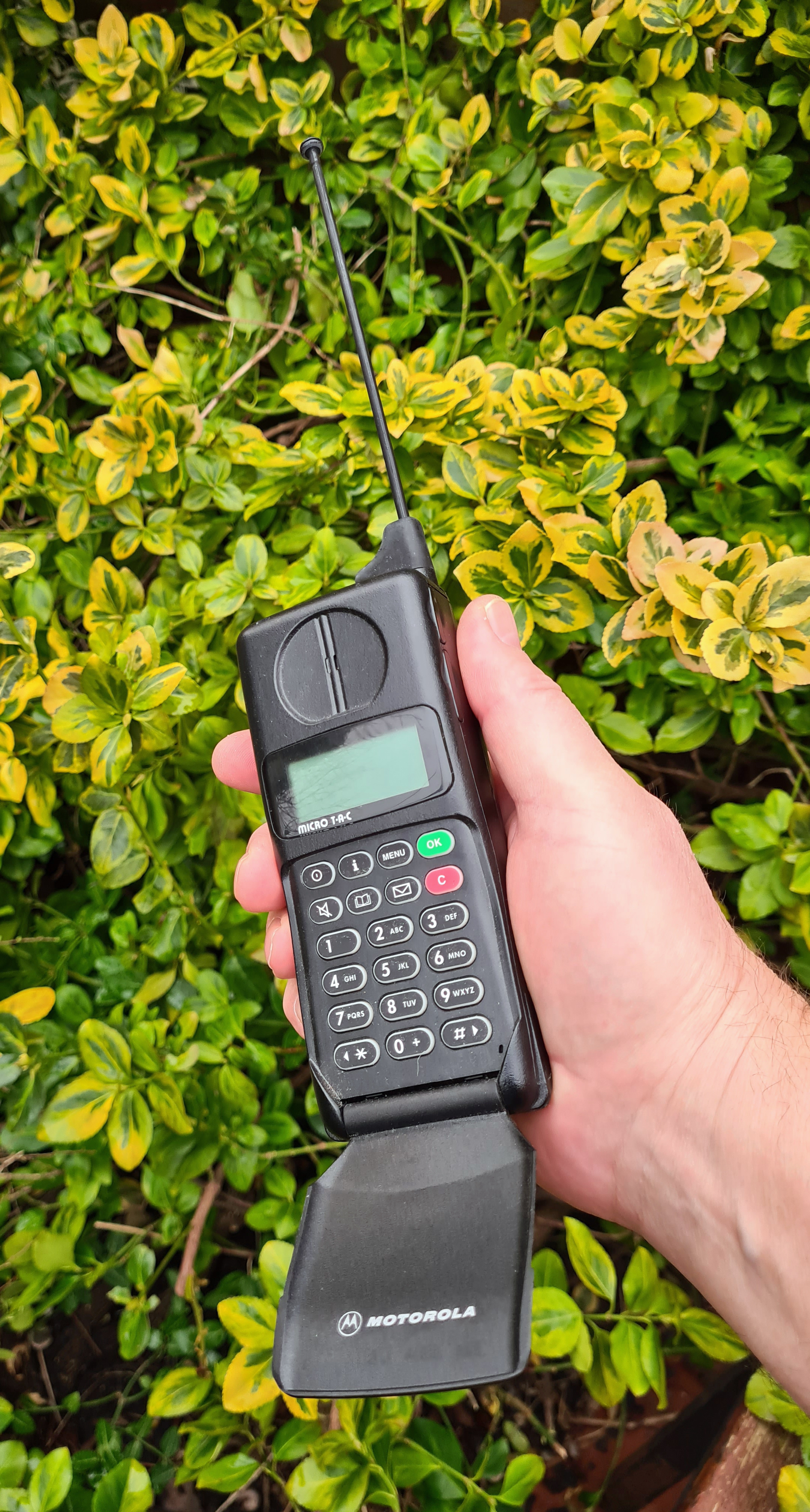 Motorola International 7500 GSM 900 ‘flip phone’ from 1995. With extending ariel and a flip open cover over the keys. The MicroTAC was a digital phone that evolved out of an analogue phone. This ‘brick’ had been left behind when Nokia shot ahead with adopting the emerging GSM standard