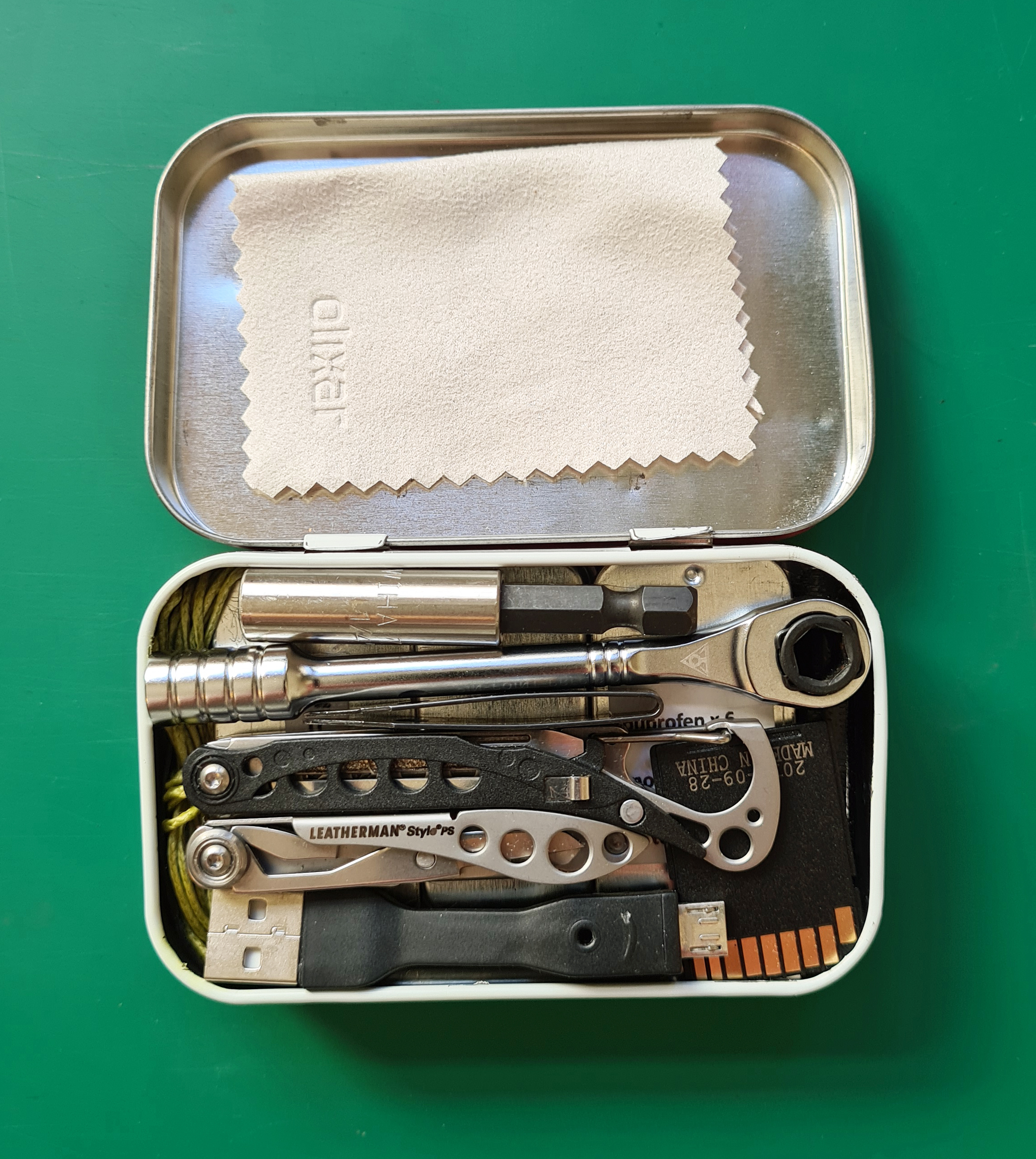 The tin itself is an Altoids tin that originally held mints. Contents are in layers. Opening the tin reveals a small rectangle of microfibre cloth as top layer. This is for cleaning lenses and is opposite a threaded needle taped to the lid. The cloth also lessens rattling of contents while being carried.