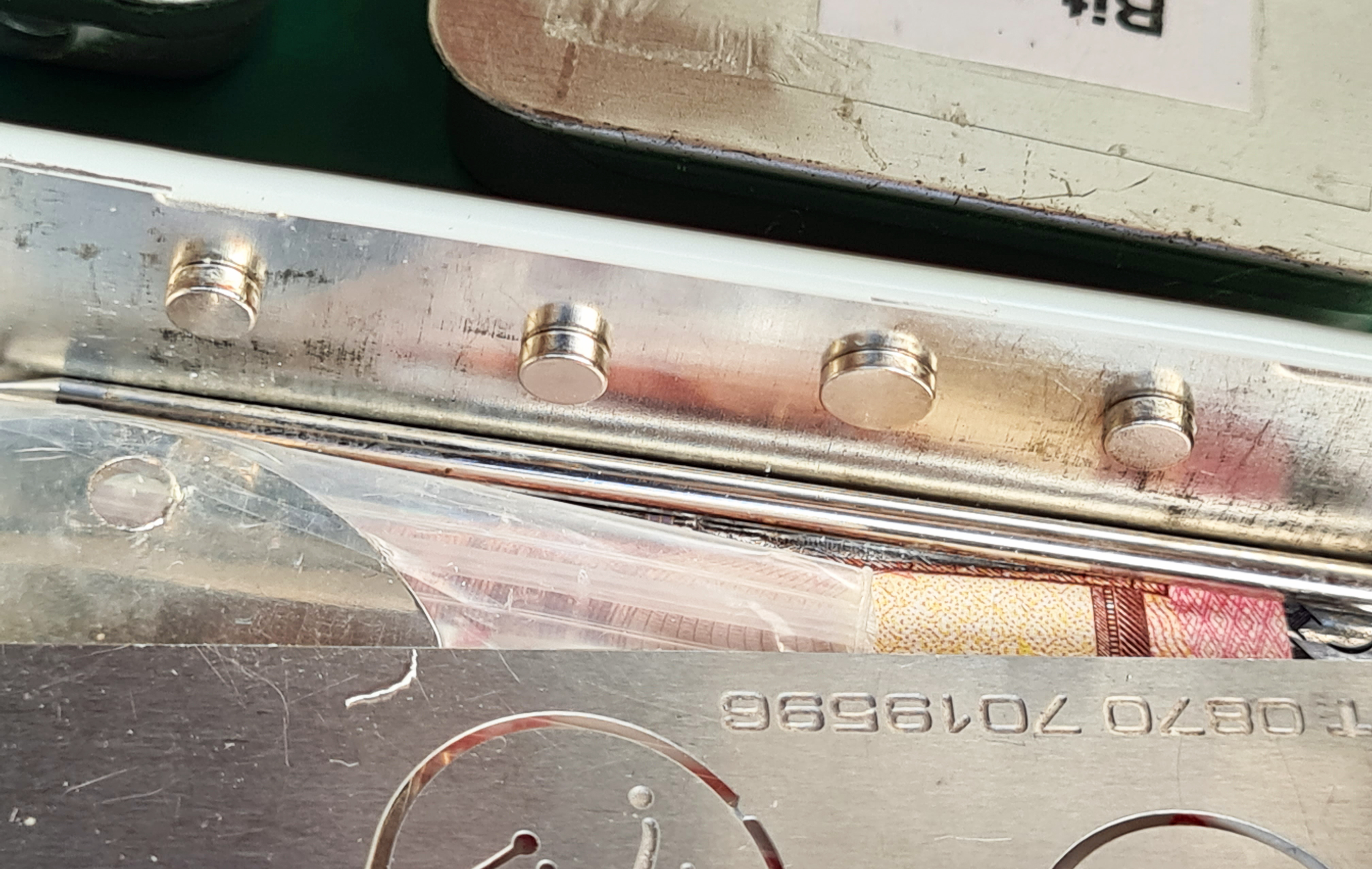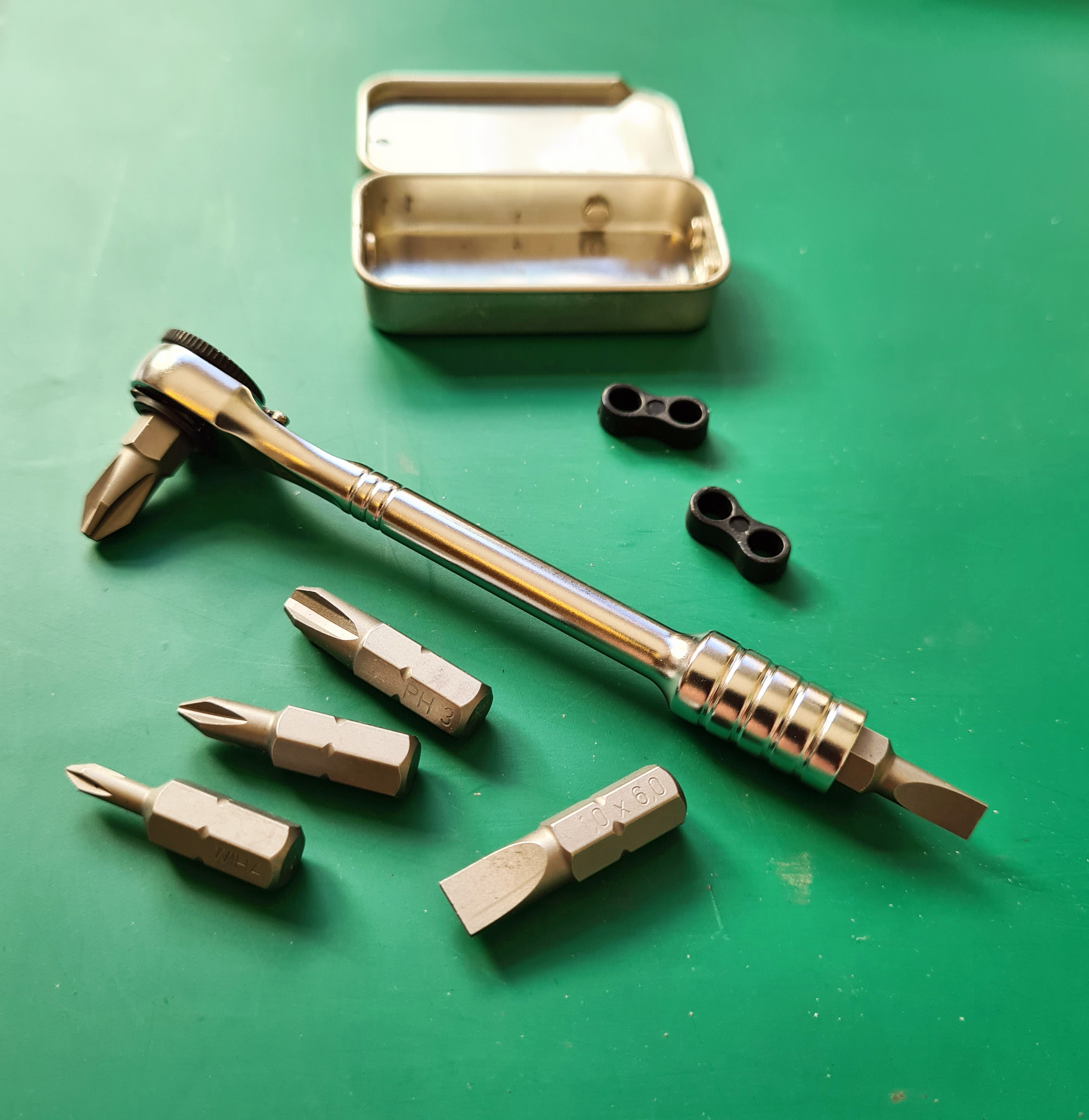I include six bits in one of my little tins. The 1/4″ drive bits are used with the ratchet tool and its extension piece if necessary. Bits are two sizes of flat and four different Phillips. Also tucked into here are two little plastic ‘thingies’ that slide onto the green cordage which can be wound back on to these as a quick and reliable fastening. These plastic fasteners especially suit using with this particularly slippery cord. A small number of rare earth magnets are scattered around the inside of the tin to stop things rattling about.