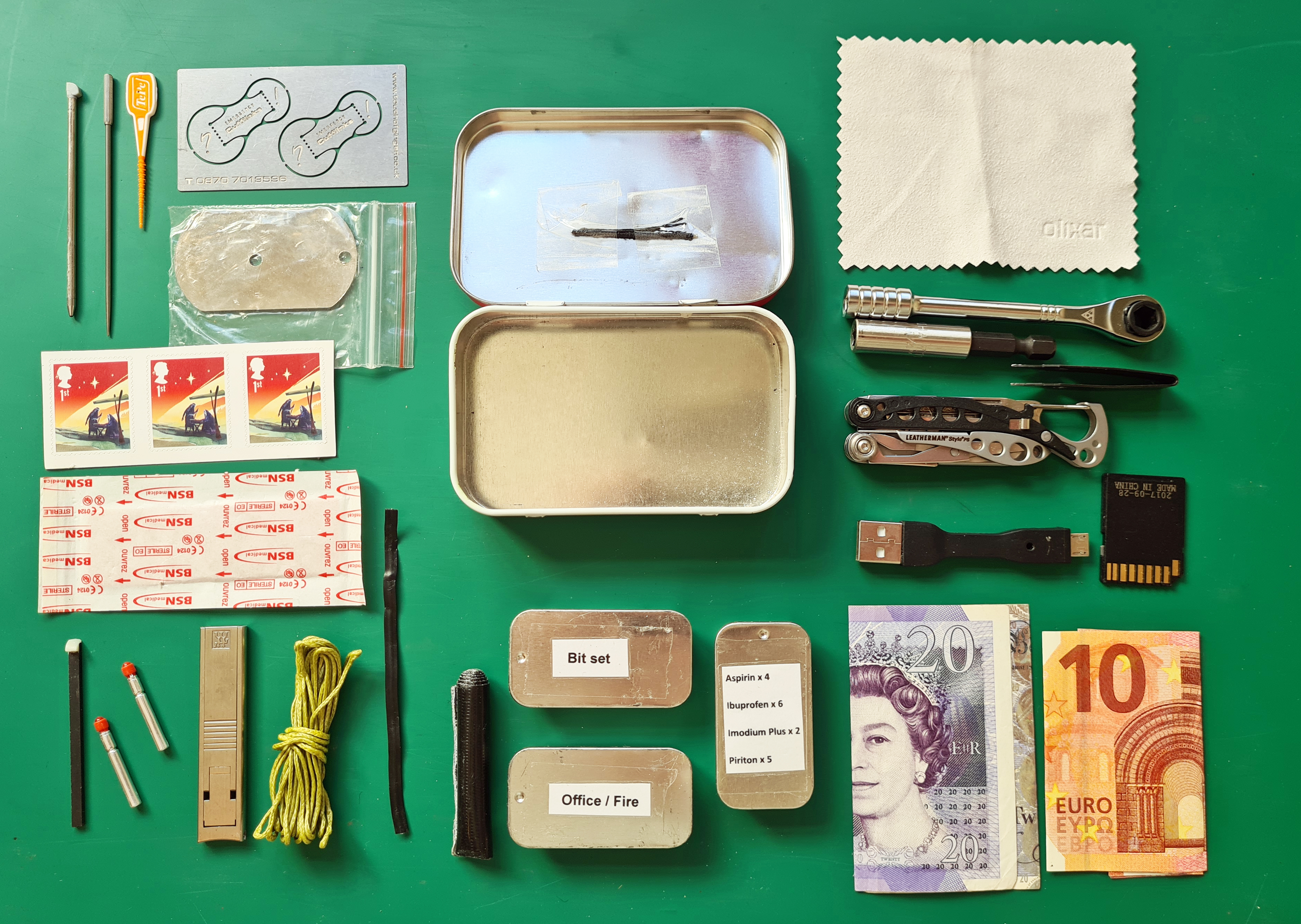 I include a little mirror, a single sterile tough fabric plaster and some postage stamps. Stamps are Non-Value Indicator so retain a First Class value regardless of price increases. I carry a little cash for emergency use only- a sterling twenty-pound note and ten euros. There are two toothpicks- a disposable TePe and a titanium pick. Also a pen taken from a Victorinox SwissCard. Plus a small ferrocerium rod and two tiny, limited life ‘lights’.