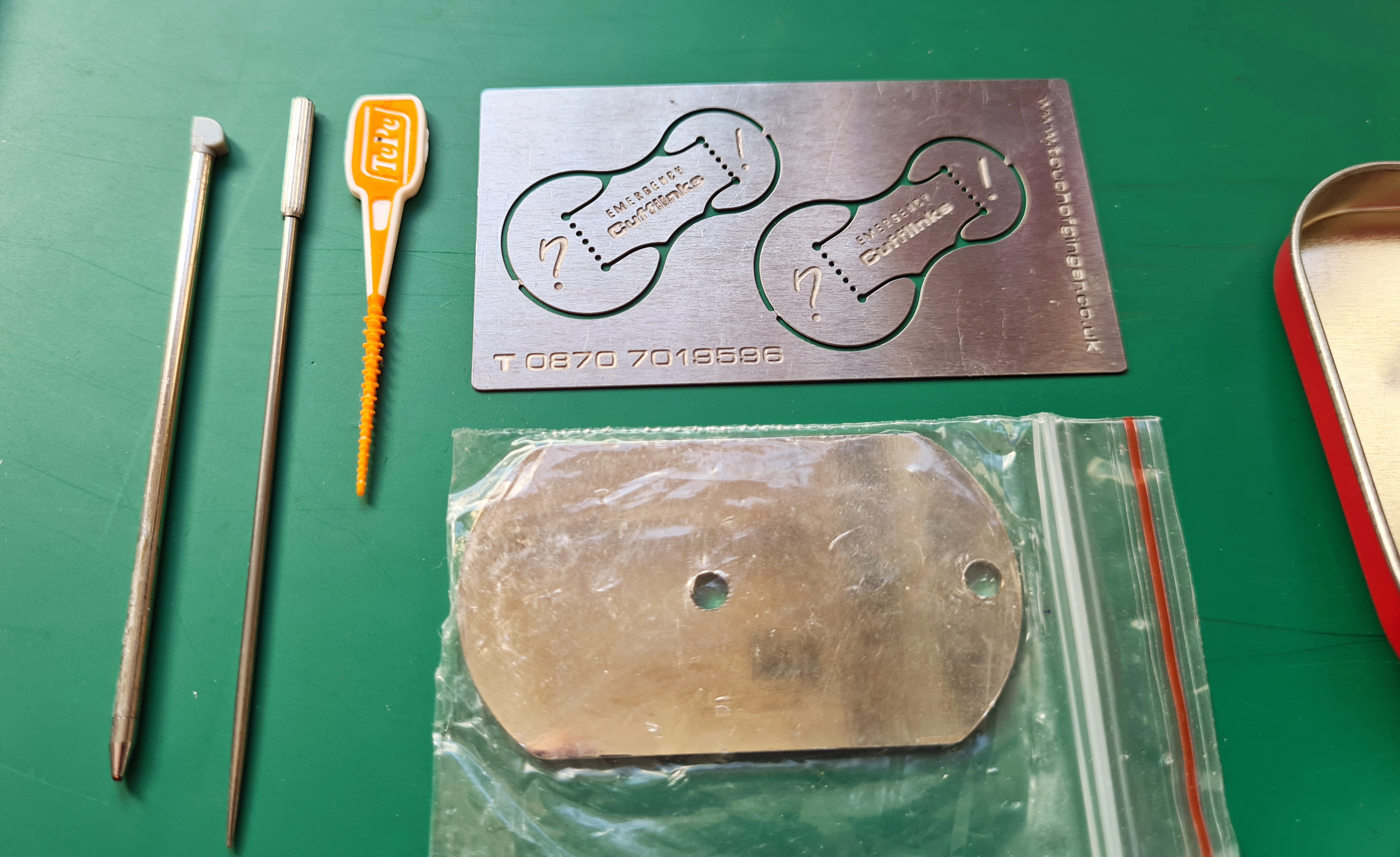 We then come to the final layer of goodies tucked into the bottom of the tin. None of these get used much but there isn’t much that would replace any of them. The first item demonstrates how much these kits should be personalised to the individual. I don’t think there are many that would include emergency cuff-links! However I have forgotten to take a pair once when changing into dress shirt and suit for an evening function, and lost a single link on another occasion. I was relieved to have an emergency cuff-link with me on at least one of those occasions.