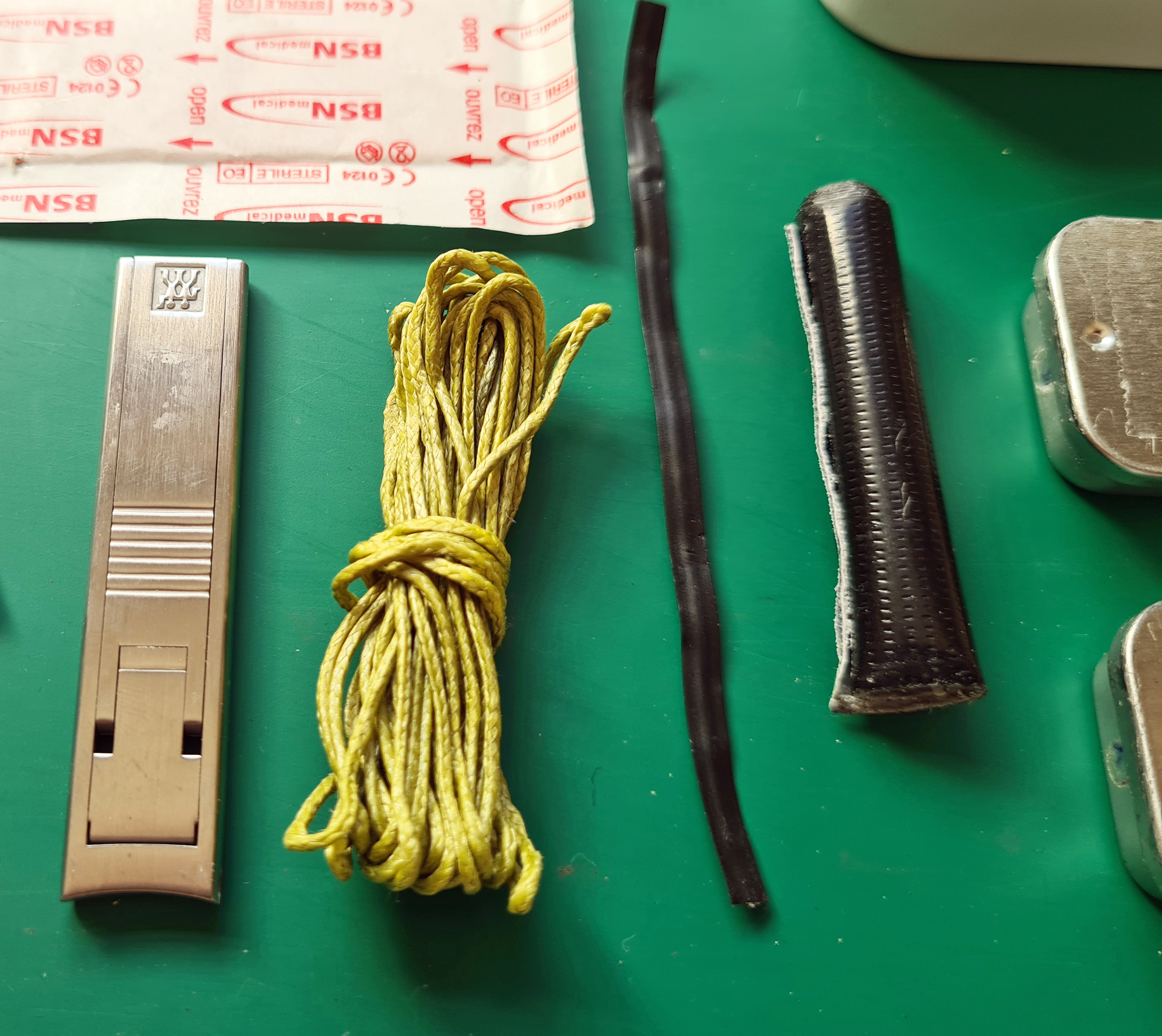 Moving onto the Fire stuff. I have a short piece of ‘strike’ card, two storm matches (cut down a little in length) and a single firelighter. Only one of the matches has ever had to be pulled into use from this kit. Fire starting could possibly be excluded from an urban kit but who knows? That BBQ isn’t going to light itself…
