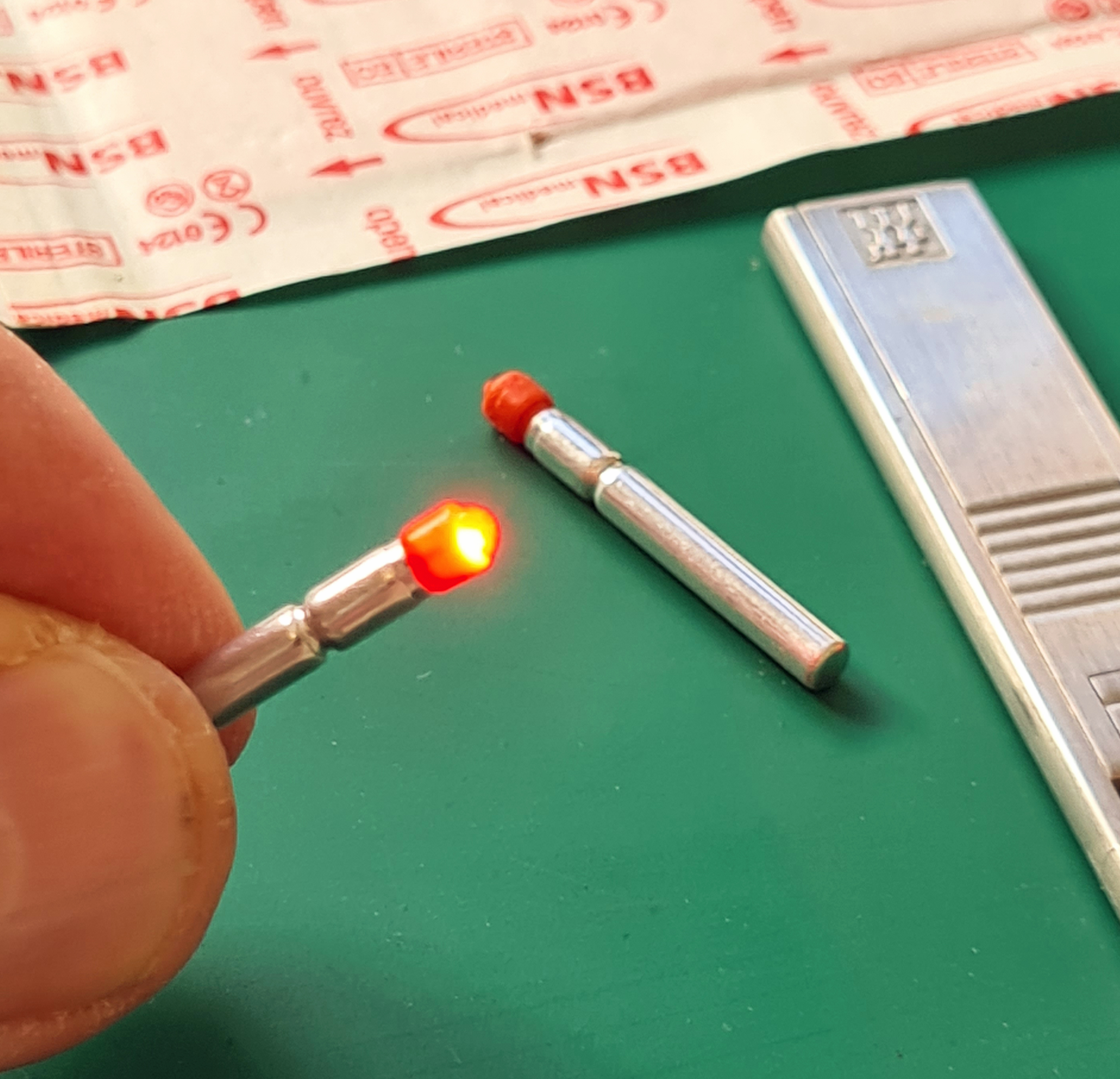 The two lights I include have little red LEDs in the end. In the dark, you can just about see across a room. You couldn’t walk the streets with these, not by a long shot. The low intensity 3v 20mAh lights were made for night time lure fishing but I have used one for loo visits at night in unfamiliar surroundings. Also when scrambling around under and behind a desk looking for electrical connectors when I was able to tape one to a fingertip, there being no room for anything else.