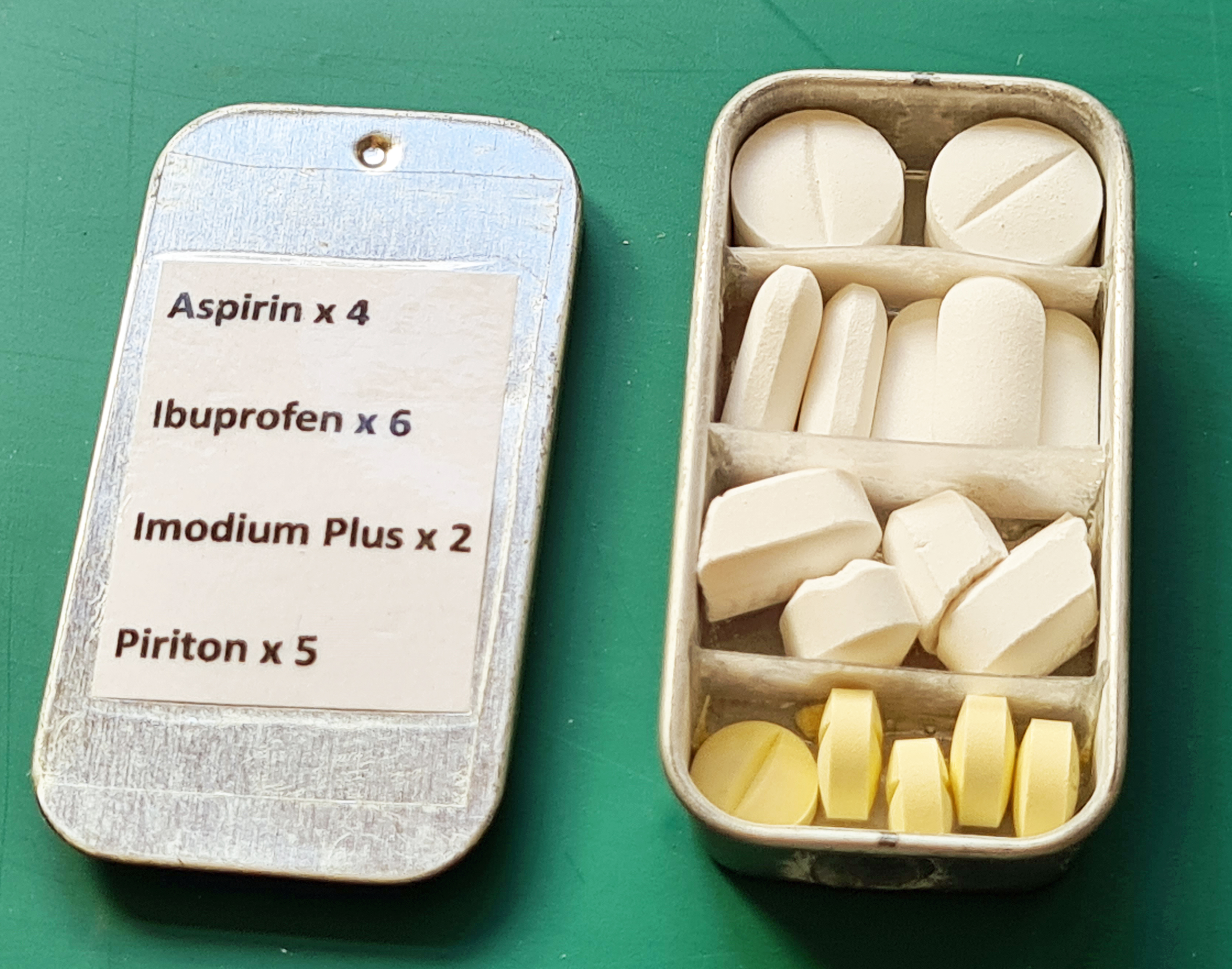 There is a little medication carried in my Urban Altoids. Three Points of the Compass is of [ahem] a certain age, so four Aspirin are carried in case of heart. Ibuprofen as an anti-inflamatory. Imodium because when you need it, you need it, and anti-allergy for stings etc. These tablets get changed out periodically as efficacy drops with age.
