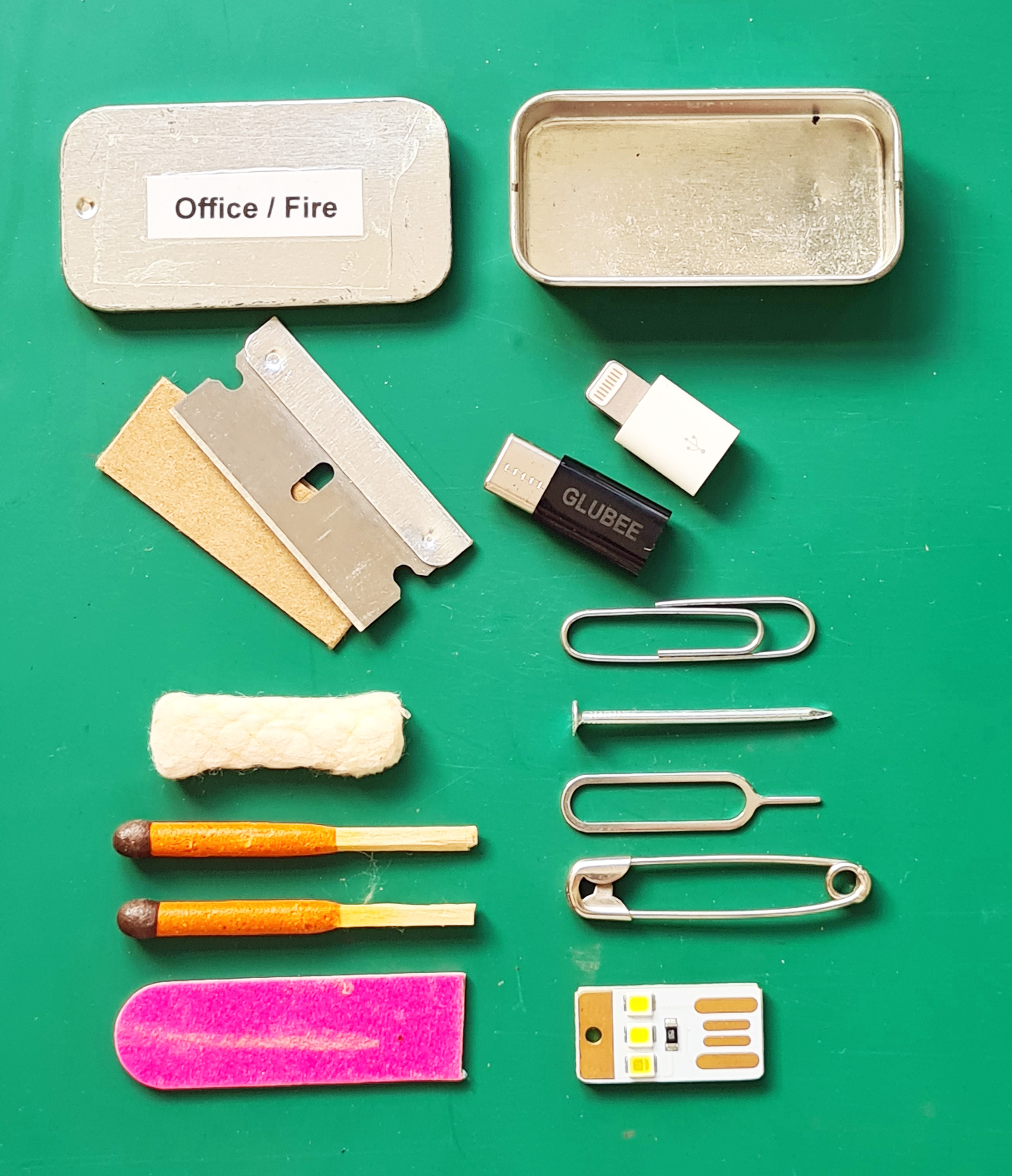 The second tin is labelled up as Office/Fire. Working round the image of the contents, starting with office related items are- a single craft blade in paper sleeve. This is the only sharp blade contained in the kit, unless I have swapped out to the Leatherman Style CS. I have two mini adapters to fix to my shortie charge cable, one is from Micro USB to Lightning, the second from Micro USB to USB C. Also a single paperclip, another nail, SIM card ejector, safety pin and tiny USB LED light.