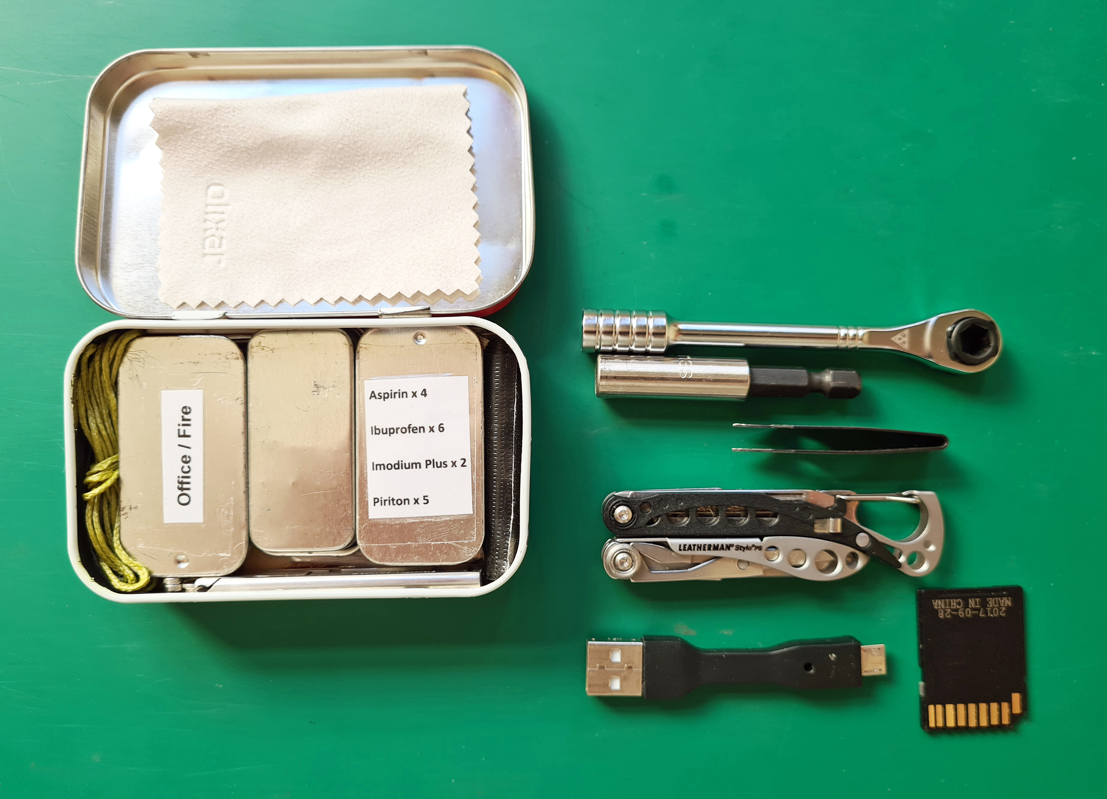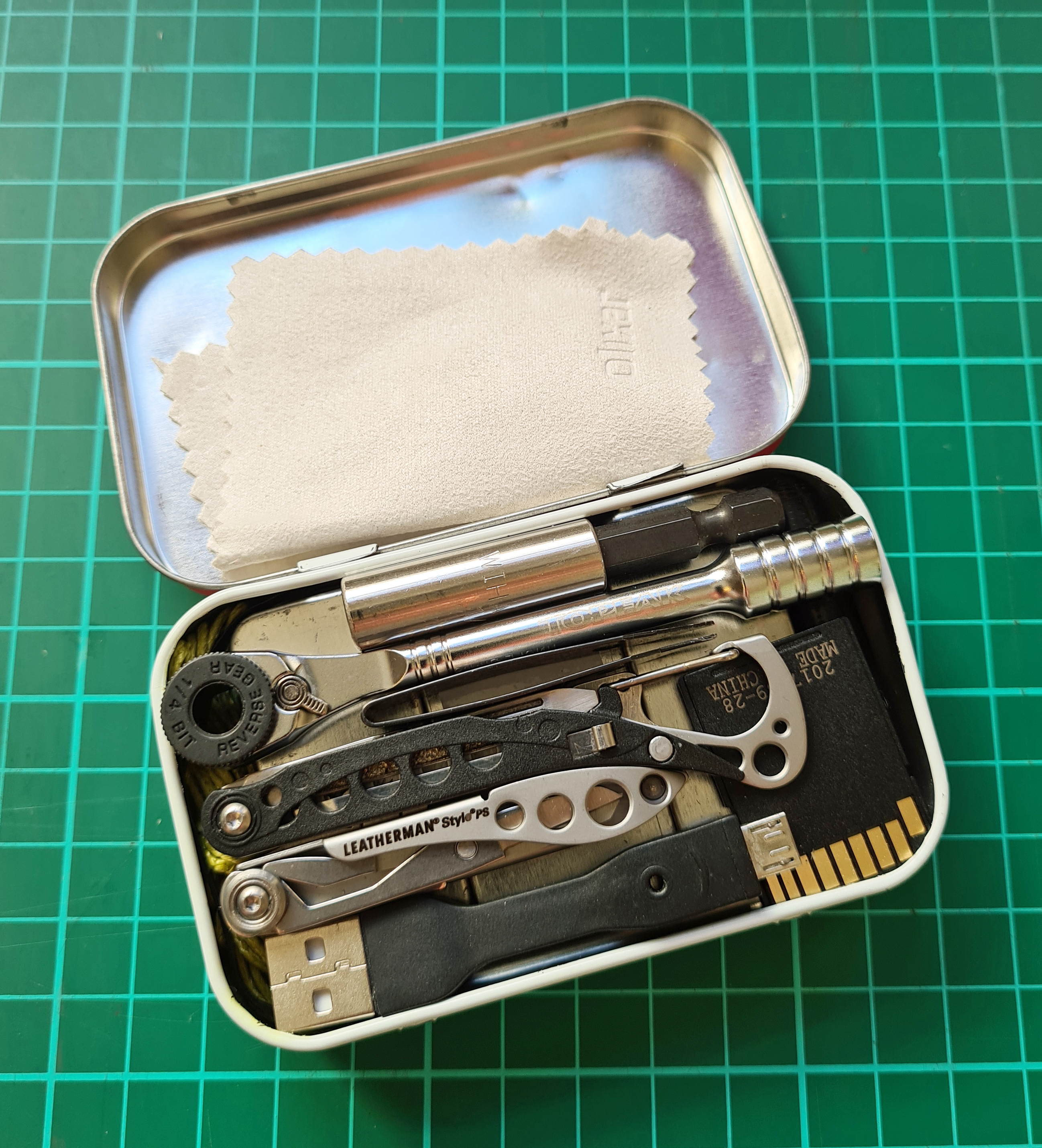 The ‘meat on the bones’ of the contents comes in the second layer. First there is a terrific little 1/4″ drive ratchet. This quality tool also has a 1/4″ insert in the handle to be used as a screwdriver extension. Both bit holders are magnetic. This is complimented by a magnetised extension. Tweezers are the black version of the Uncle Bill’s Sliver Grippers without keychain hanger. No doubt the most useful and used tool is the Leatherman Style PS I keep in the kit. I have changed this out to the Leatherman Style CS at times. Especially if taking this kit on holiday as that tool comes with larger scissors and a knife blade. If abroad I wouldn’t then be carrying my keys, which hold a small Victorinox Classic. So most times on an urban commute, the kit will include the Style PS which has pliers and I will rely on a small knife and scissors carried outside the tin. The short little charge lead is used probably more than it should be. The length is ideal to plug into a laptop and keep a phone charged up on the desk. This lead has had its keychain hanger removed to make it fit in the tin better. The final item in the top layer is an SD card adapter with 128GB Micro SD card. This has frequently been useful as an extra data storage unit or for slotting in to my phone or camera as films and photos fill up an existing card. I used to include a small thin Flash Drive with removable Micro SD but that has wandered off somewhere for now.