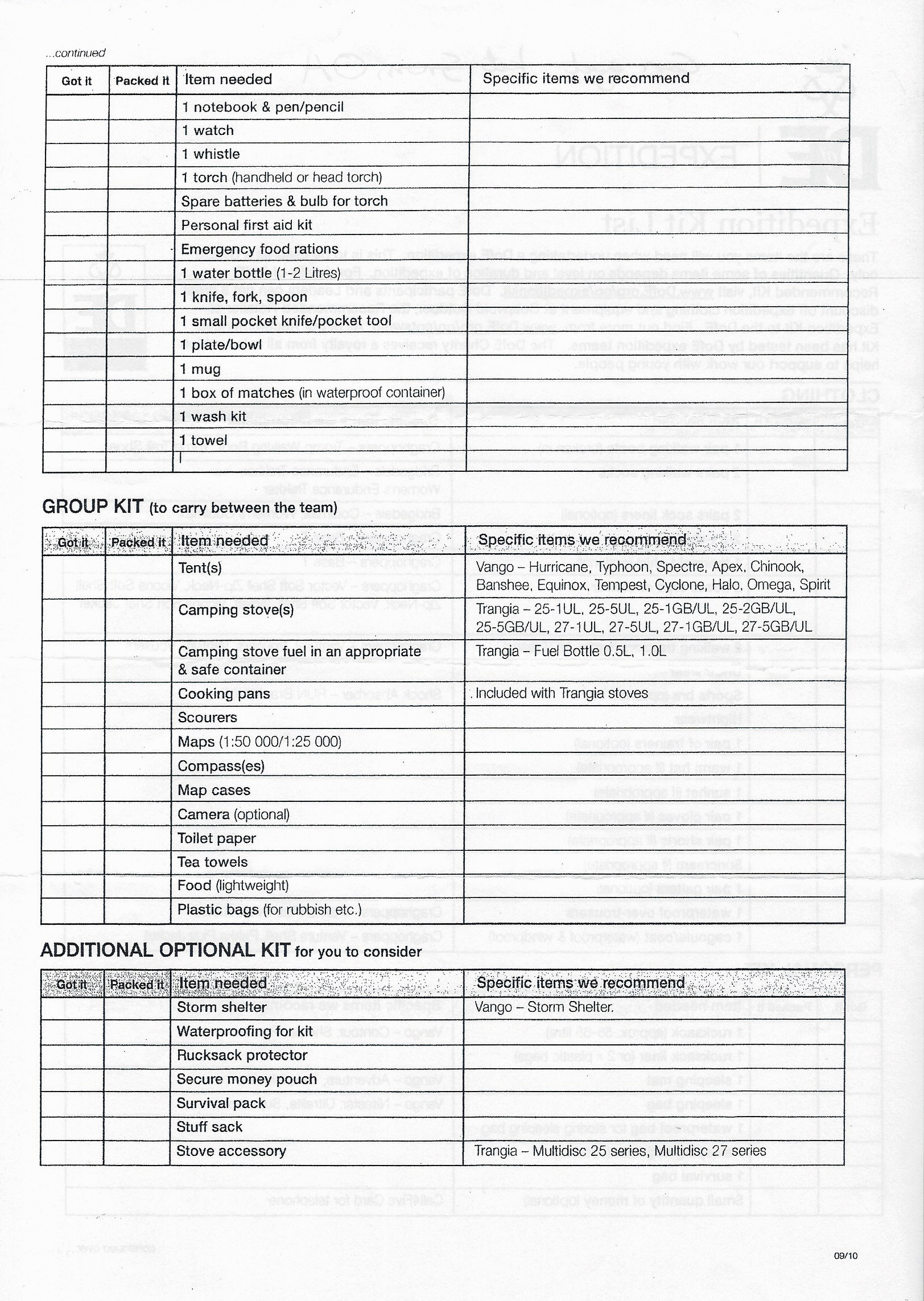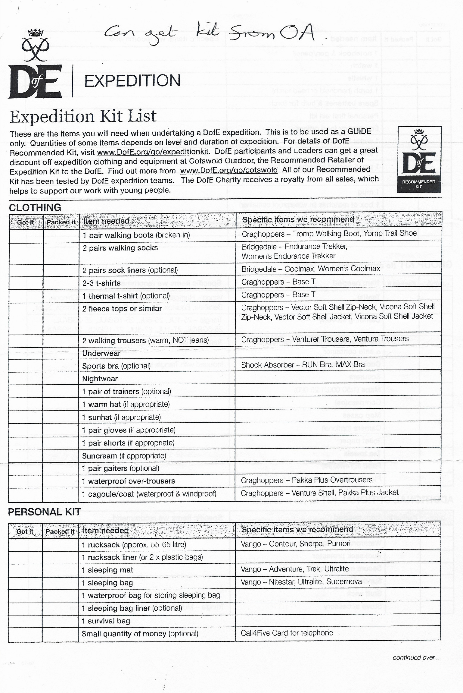 Duke of Edinburgh Expedition Kit List- 2019