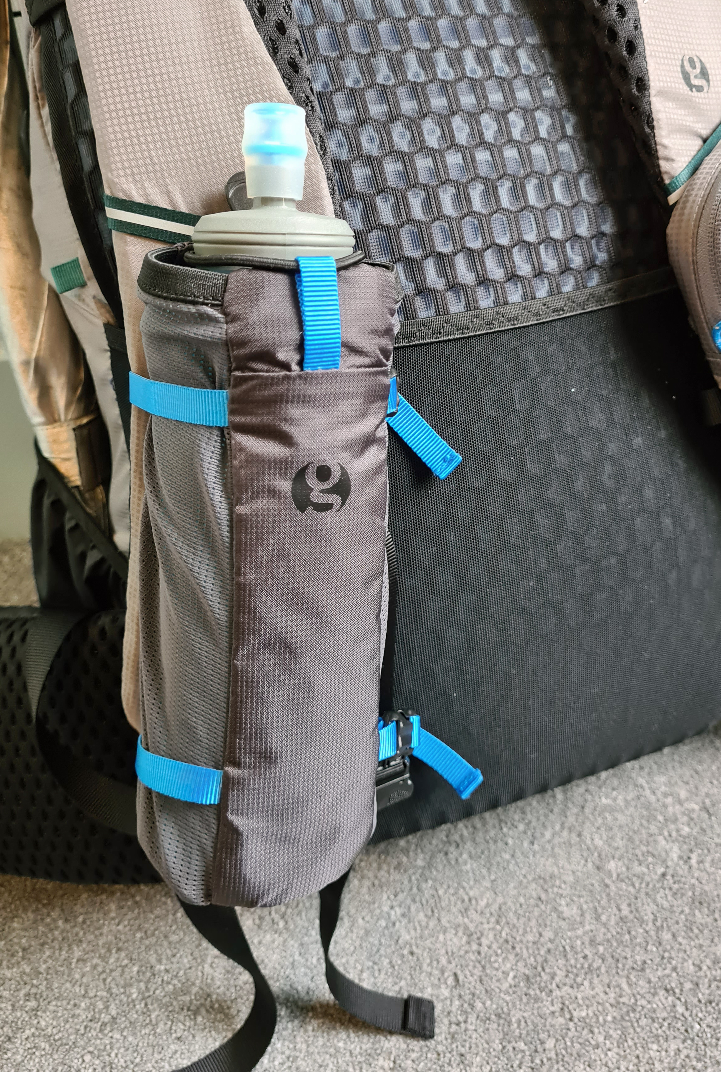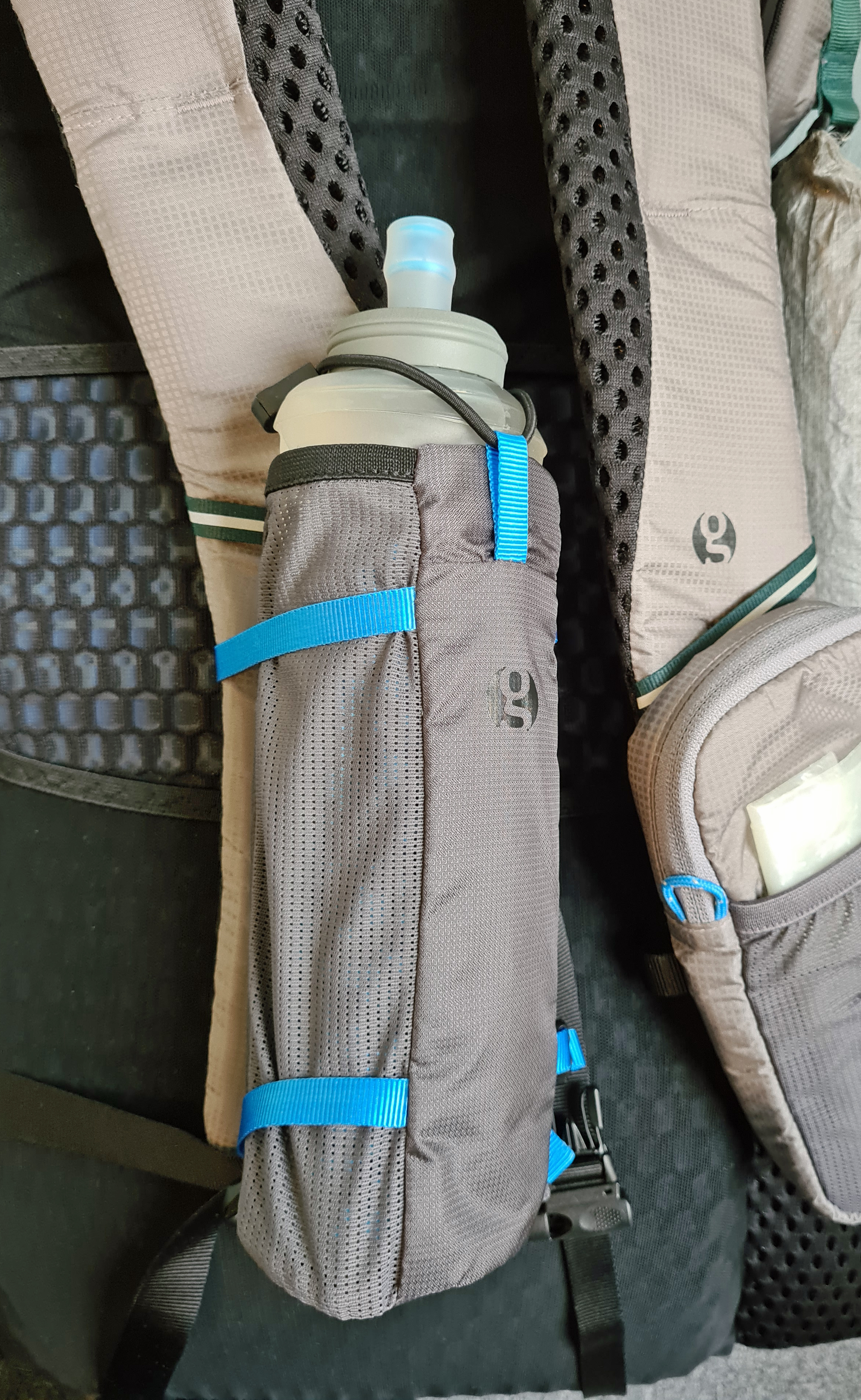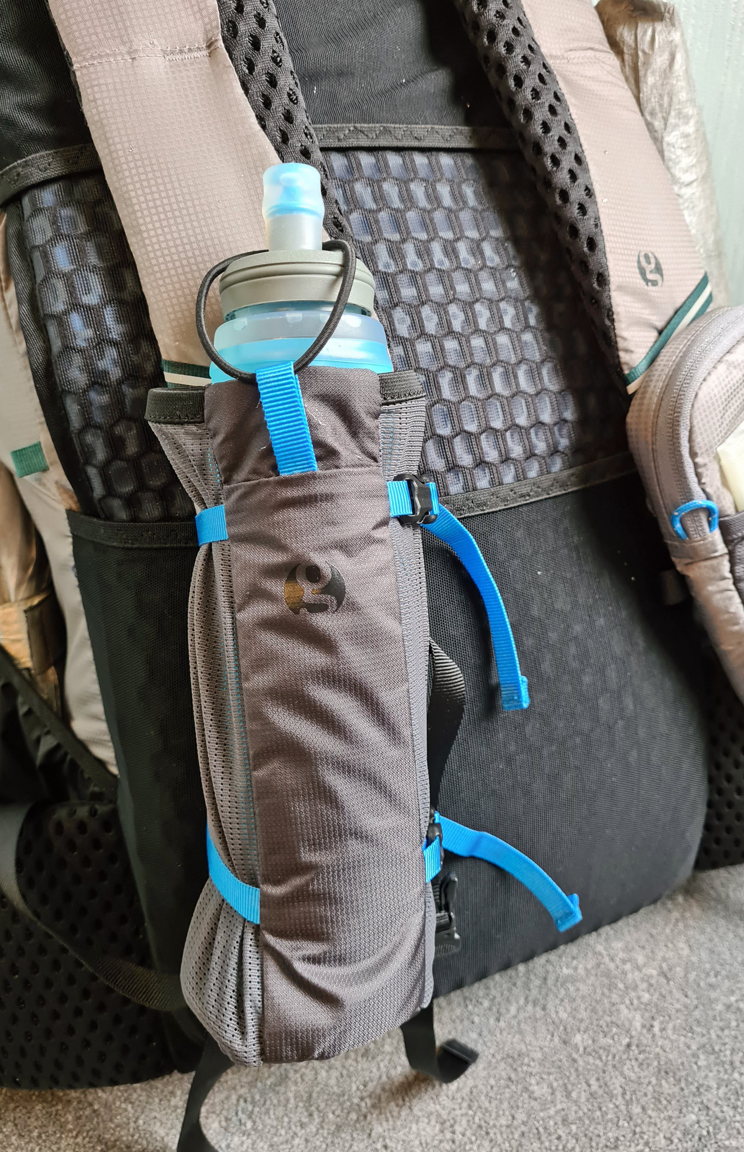 850ml Smartwater bottle with sports cap in Gossamer Gear Bottle Rocket shoulder strap bottle holder. The pack is the Gossamer Gear G4-20.