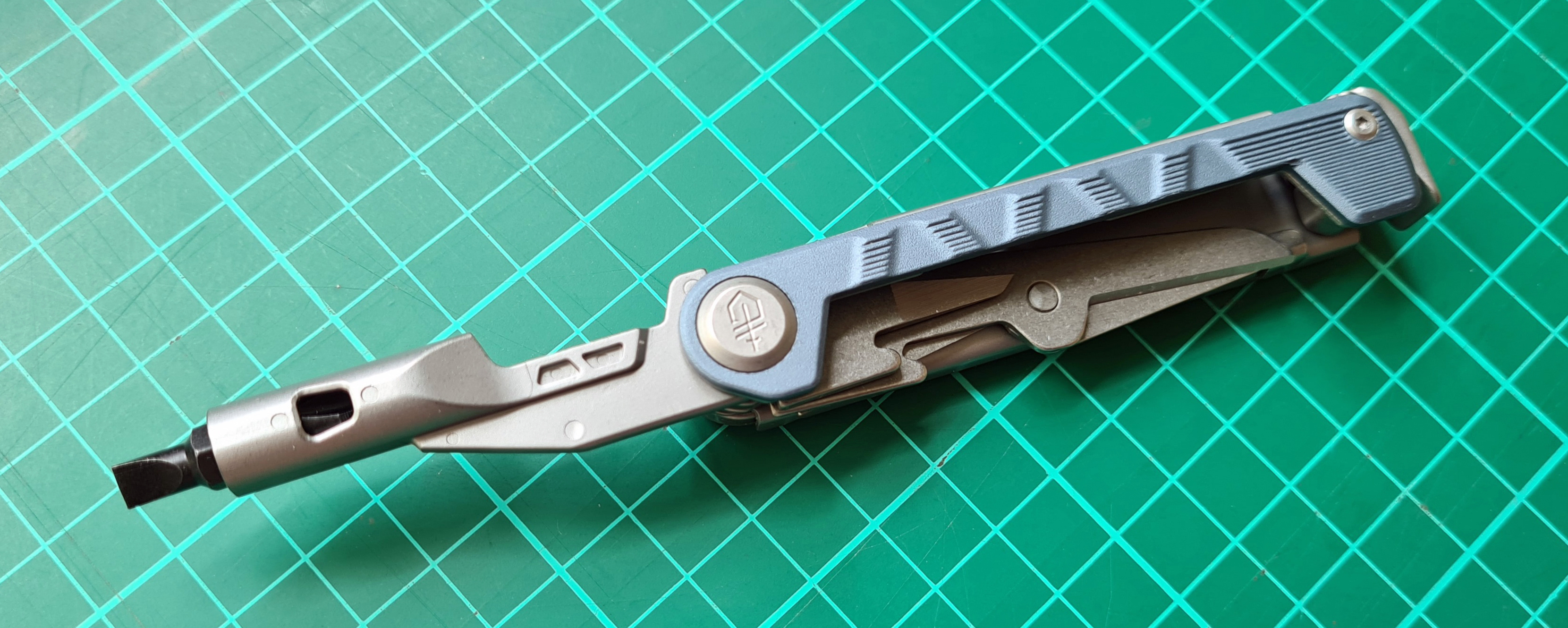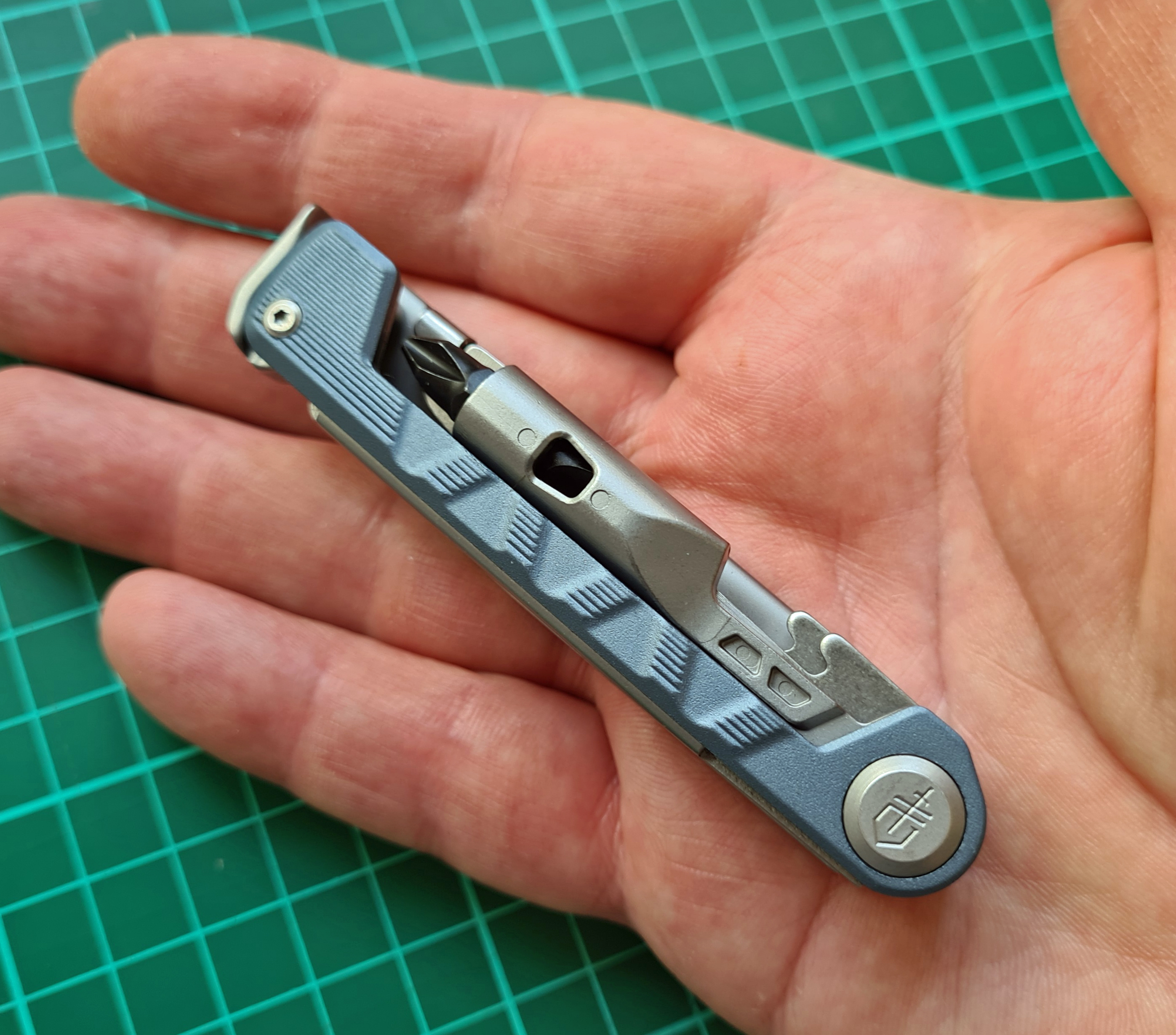 Build quality and appearance is pretty good. Gerber products made in China have really come on in their finished appearance. There are no rough unfinished edges and the anodised effect is quite smart. The tool is available in three colour finishes- Onyx, Orange and the Urban Blue shown here. Weight is reasonable. 86.8g with no bit or 91.3g with the included two-ended drive bit. The tool measures 90mm when closed, 138mm when open. 18.10mm wide (max) and 20mm thick (max).