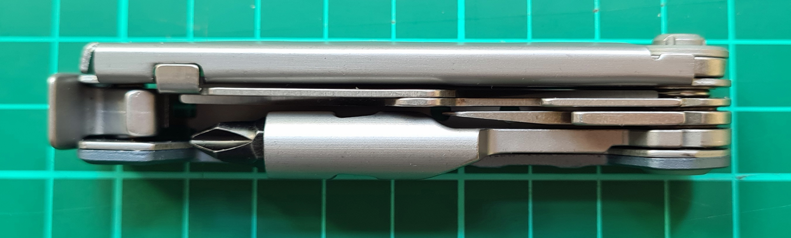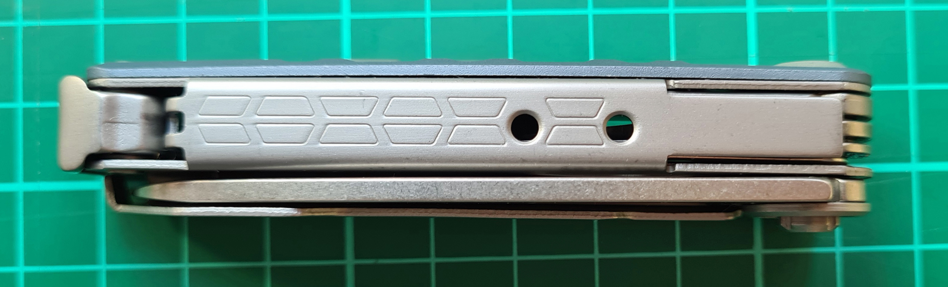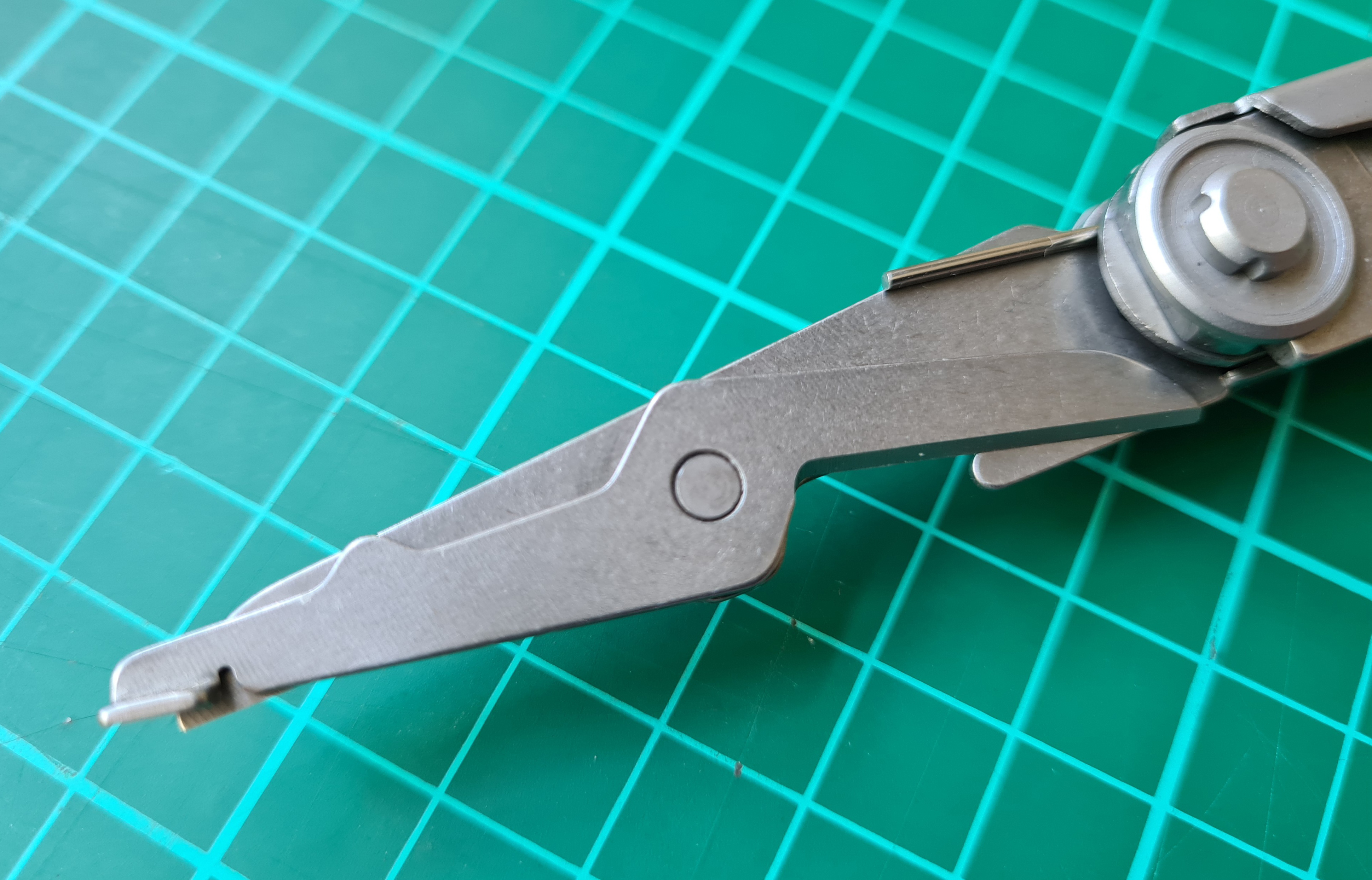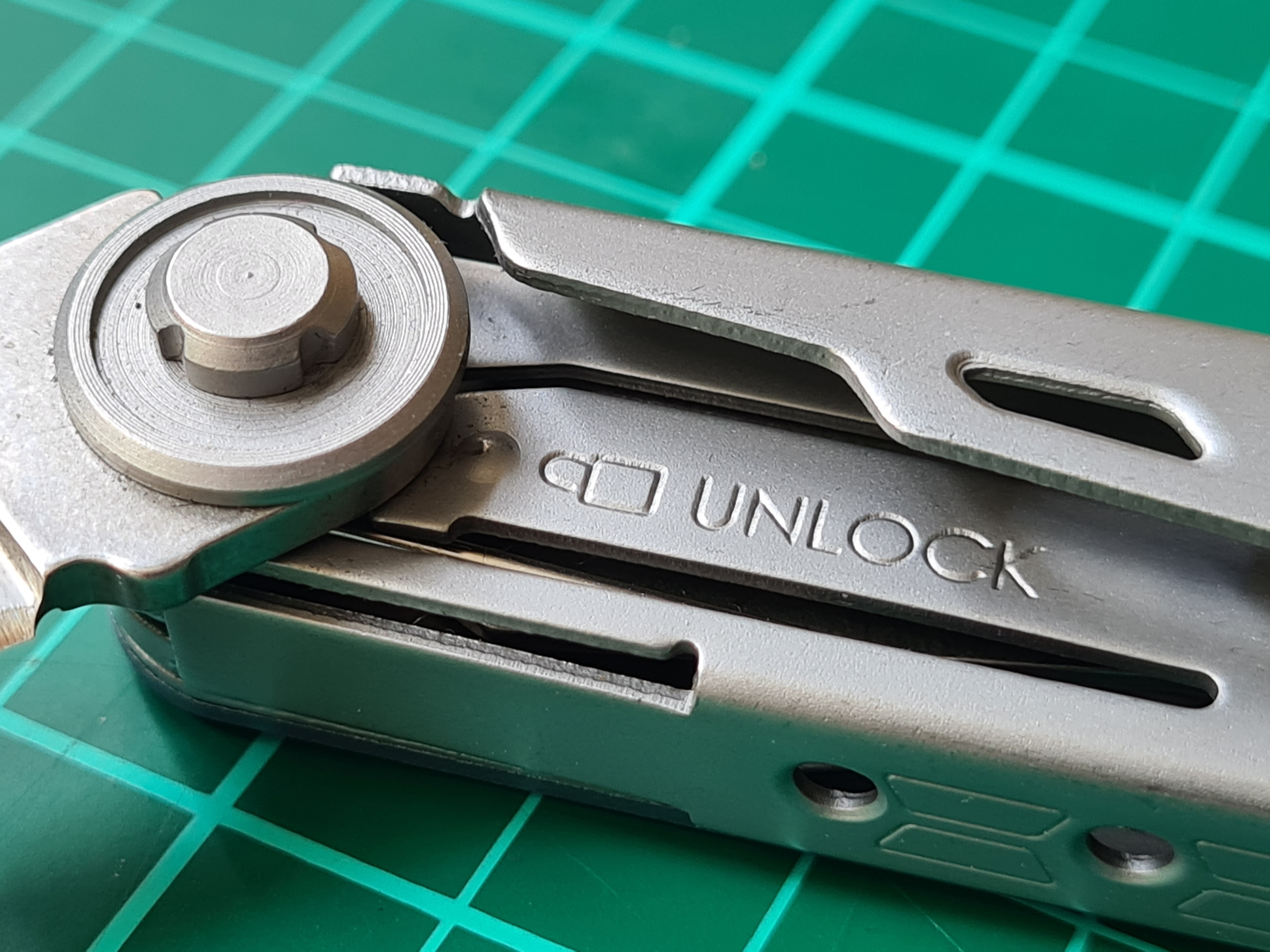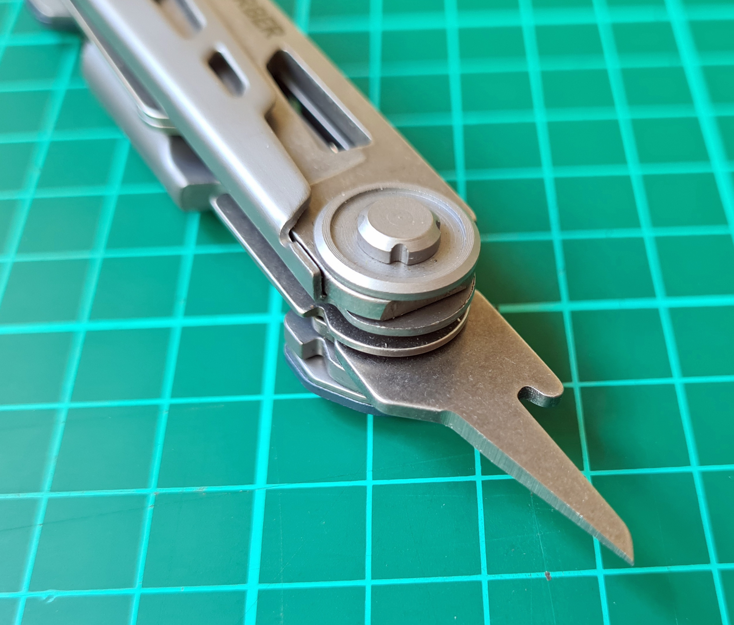 The blade is quite chunky in appearance- it is 15.55mm wide and 2.70mm thick across the spine. The blade has a liner lock that is easily depressed with the thumb when the tool is being folded, this is most suited to right-handed users. This lock means the tool is non-compliant with UK knife law for street carry.