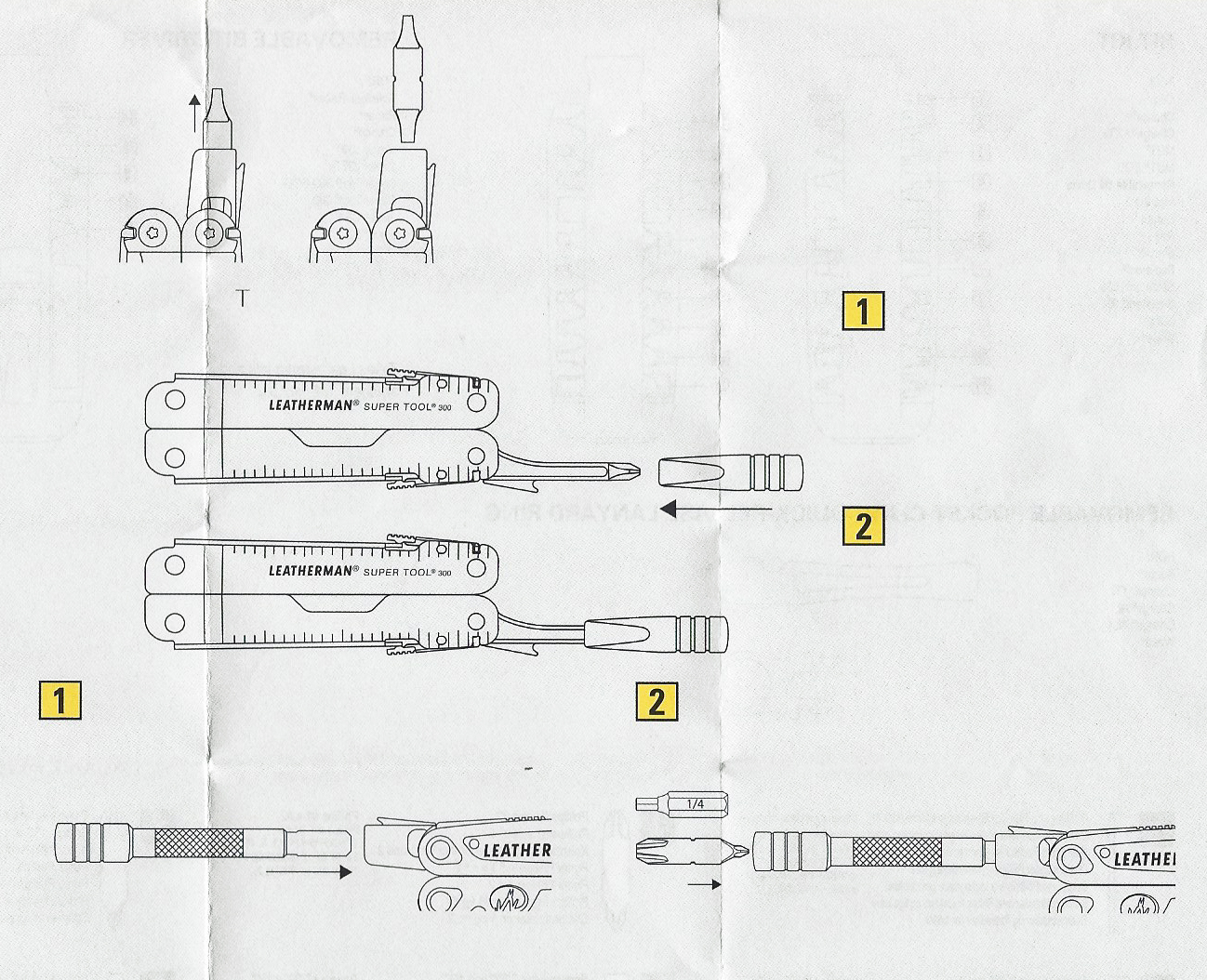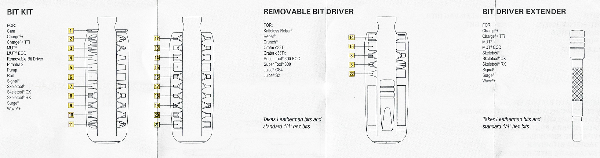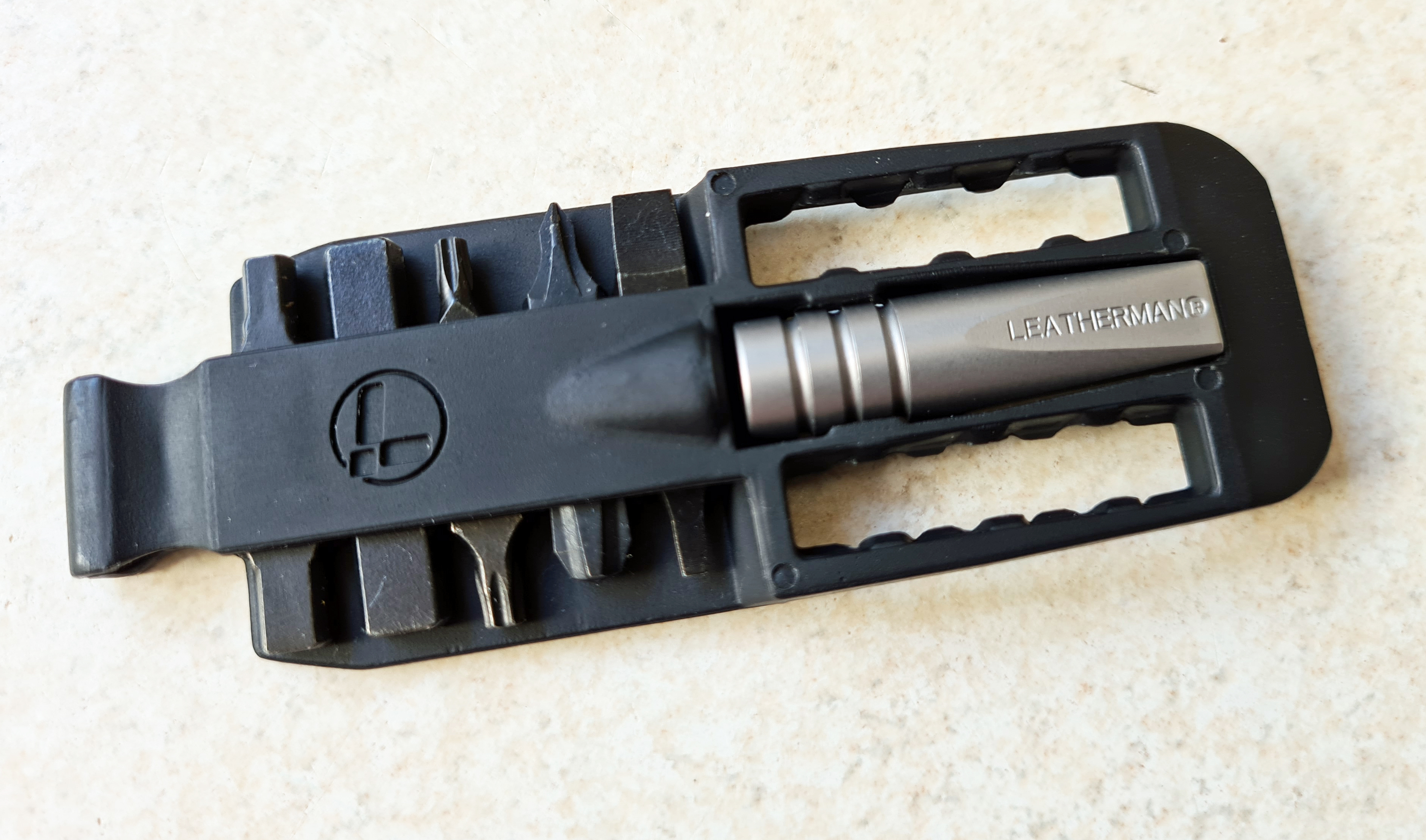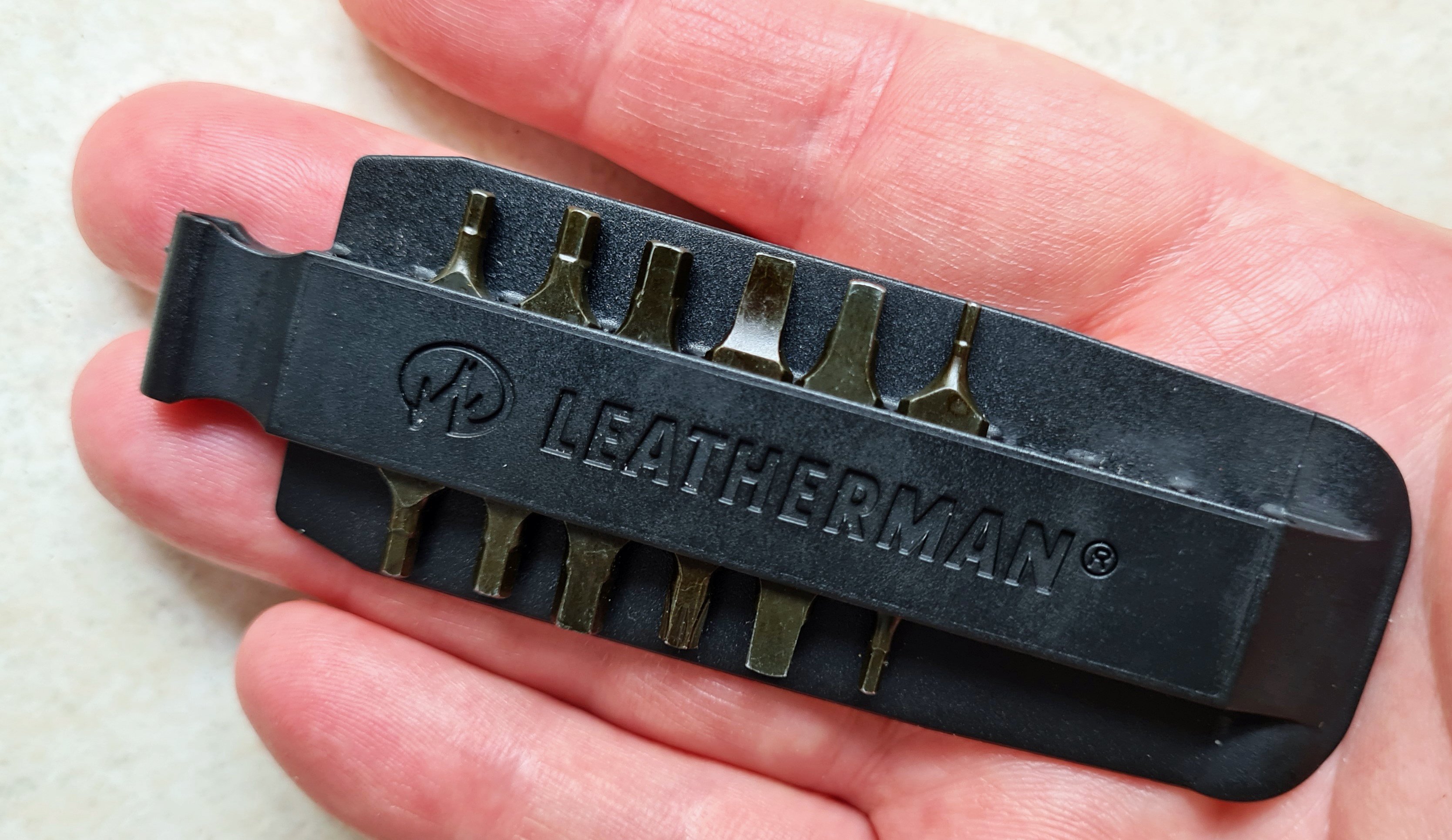 The Leatherman Bit Driver is a short adapter fitted in to a plastic case along with five double ended bits. These currently (2021) are: