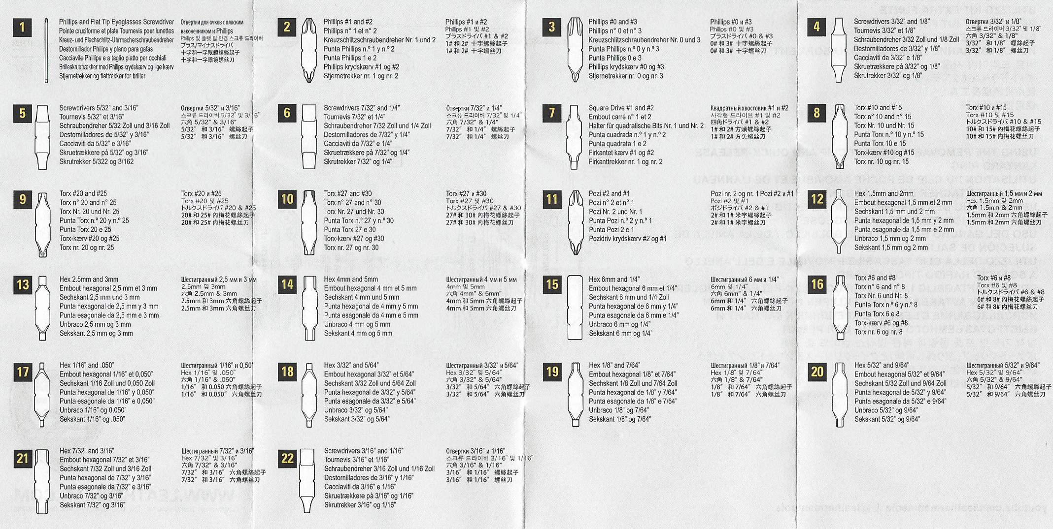 The 42 bits in my set comprise: Small (eyeglasses) flat/Philips screwdriver, Philips #1/#2, Phillips #0/#3, flat 1/8 with 3/32, flat 3/16 with 5/32, flat 1/4 and 7/32, square R#2/R#3, T10/T15, T20/T25, T27/T30, Allen 1/16 and .050, Allen 1.5mm/2mm, Allen 2.5mm/3mm, Allen 4mm/5mm, Allen 1/4″/6mm, Allen 1/8 with 7/64, Allen 5/32 and 9/64, Allen 7/32 and 3/16, Pozi 3/Square R#1, Pozi 1/Pozi 2, Flat 3/16 with Phillips #1-2