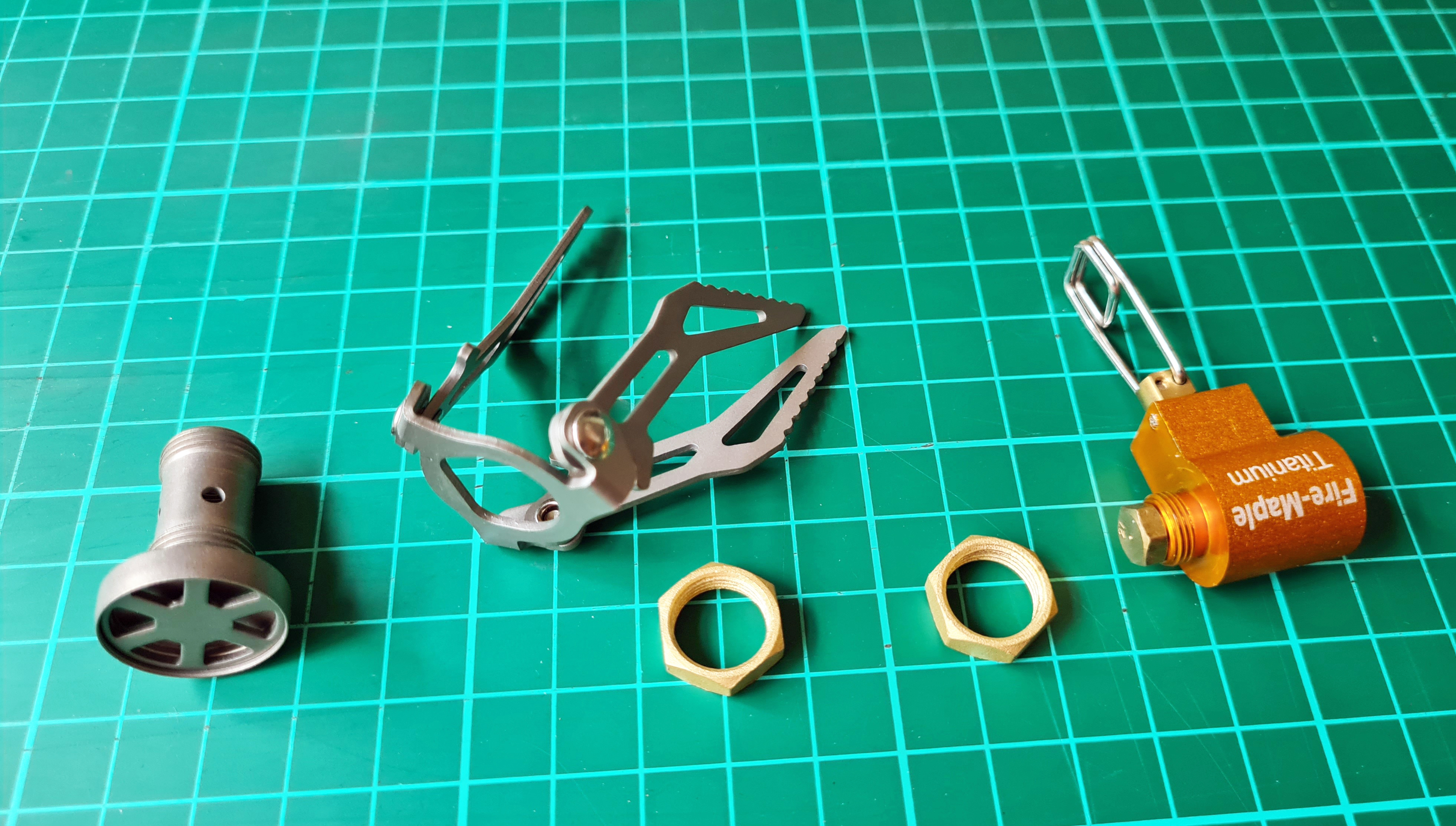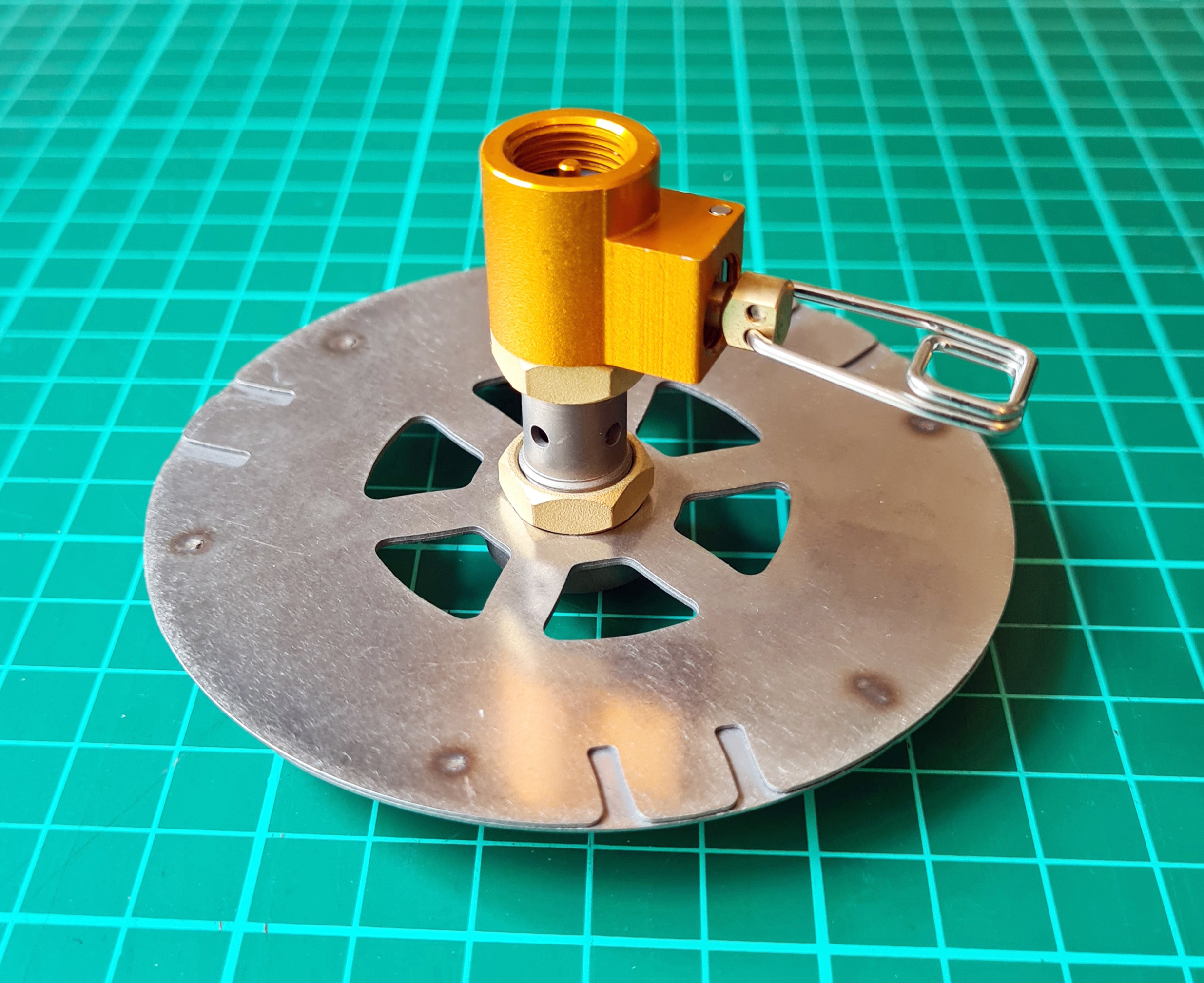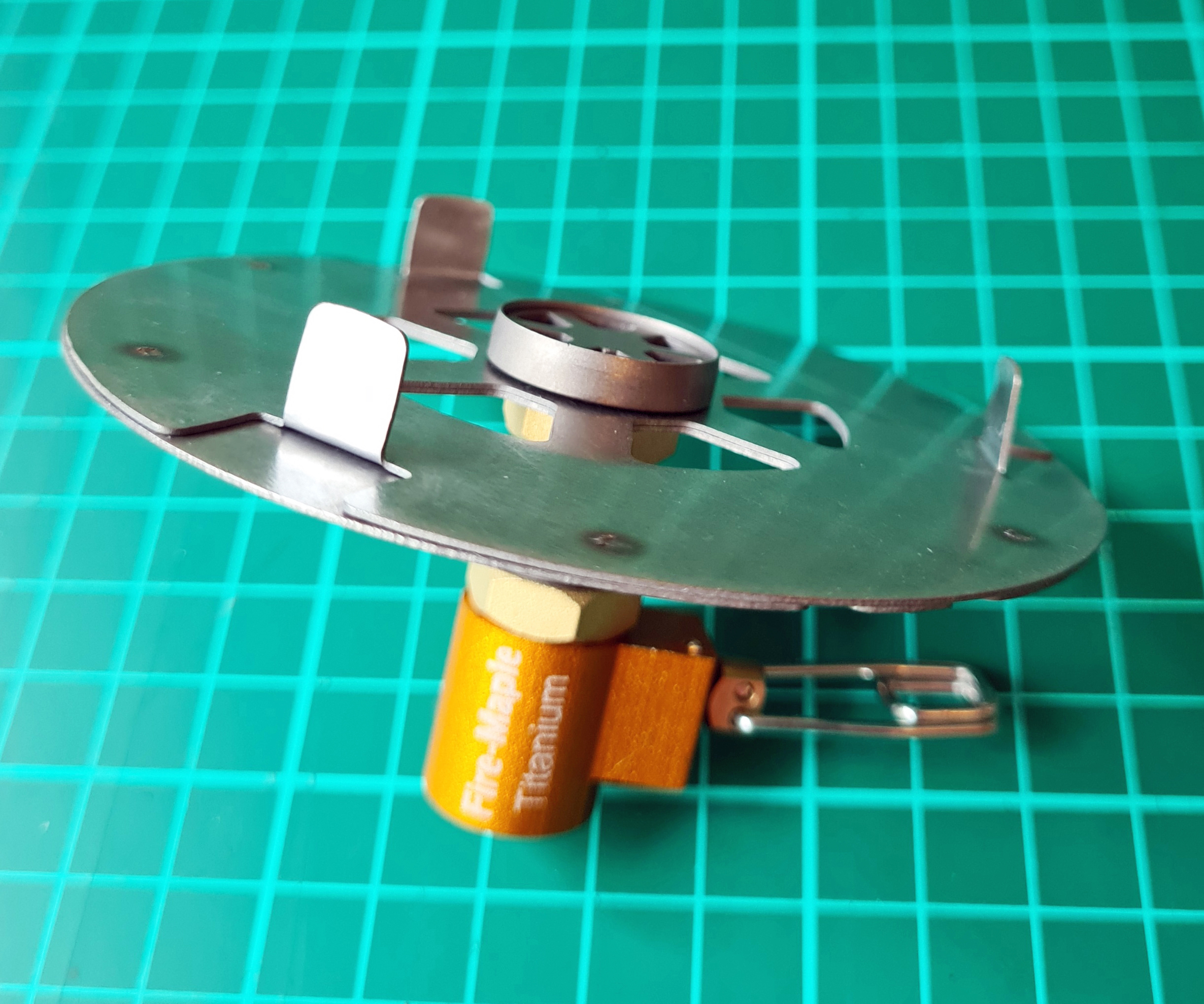 This is an adapter plate that converts a little FMS-300T Hornet stove to work with a heat exchanger pot. Heat Exchanger pots have a ring of fins around their base that snatch a few more of those BTUs from the stove and transfer them to the pot. They also act as a windscreen to the base of the pot. By partially dismantling the Fire Maple stove, which takes a grand total of one spanner, it can be reassembled with the adapter plate in place instead of the pot support arms.