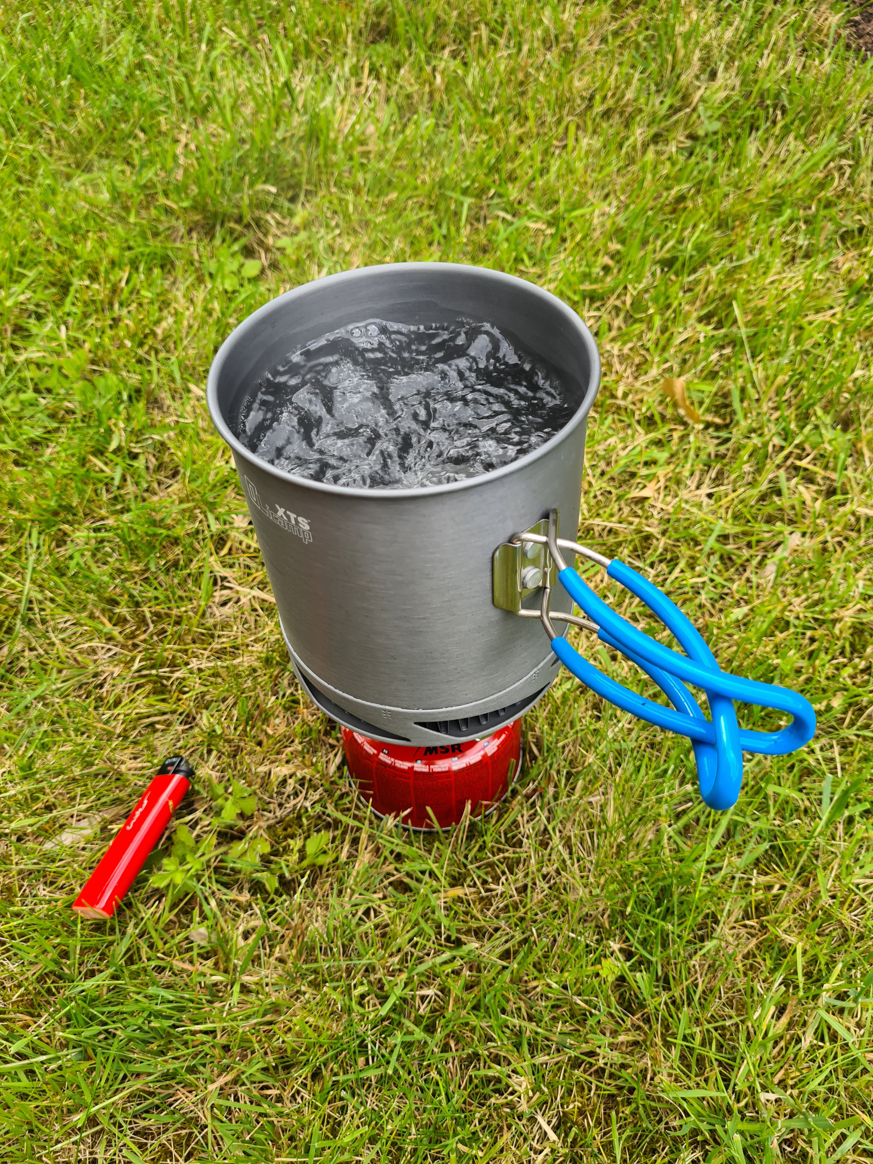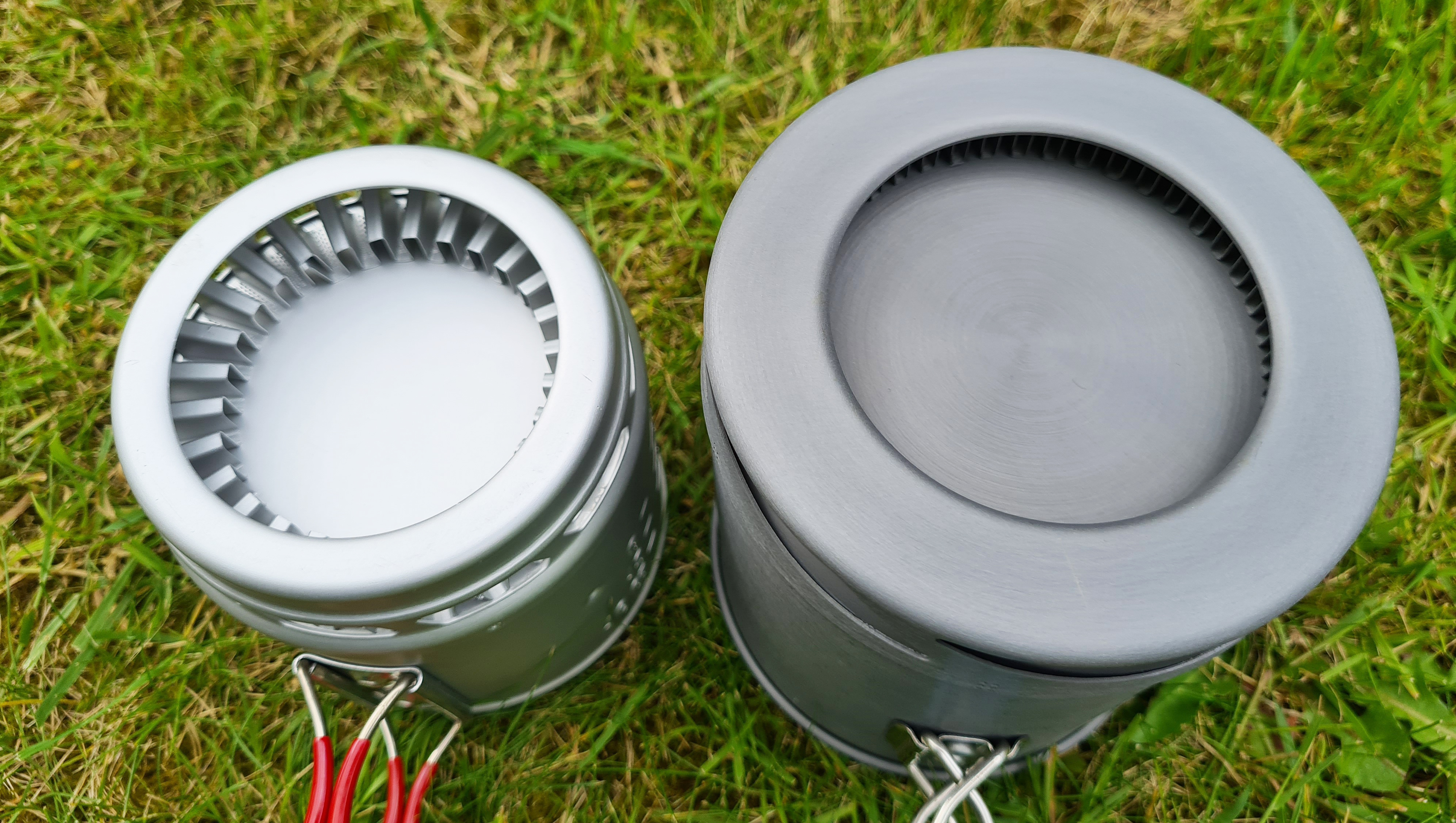 I had a glance at a couple of other heat exchanger pots I have. The pot from the fantastic MSR Windburner stove has angled fins in the heat exchanger which prevent it nesting with the adapter plate, so that didn’t work. My old Jetboil Flash heat exchanger pot does fit the adapter. It is not a particularly snug fit but cannot slip off while in use. However it is a tall pot and holds a lot of water. If not using a canister stand, and few of us do, it is a bit of a rickety top-heavy affair when in use and I experimented no further with it as I wasn’t keen on the set-up.